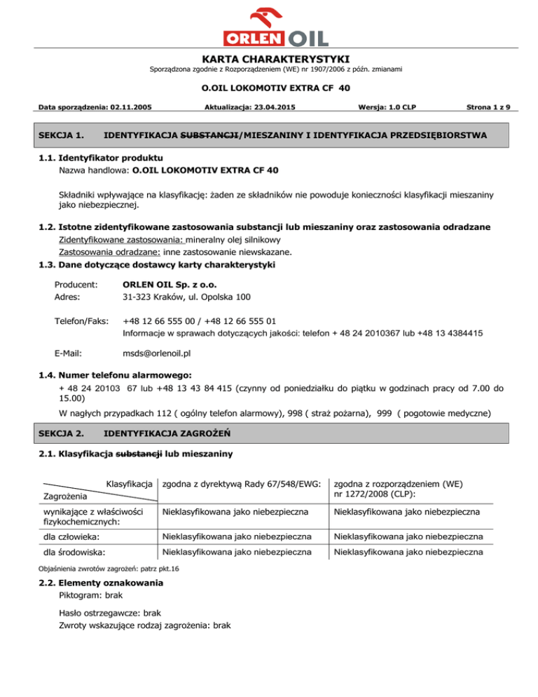 KARTA CHARAKTERYSTYKI Sporządzona zgodnie z Rozporządzeniem (WE) nr 1907/2006 z późn. zmianami O.OIL LOKOMOTIV EXTRA CF 40 Data sporządzenia: 02.11.2005 SEKCJA 1. Aktualizacja: 23.04.2015 Wersja: 1.0 CLP Strona 1 z 9 IDENTYFIKACJA SUBSTANCJI/MIESZANINY I IDENTYFIKACJA PRZEDSIĘBIORSTWA 1.1. Identyfikator produktu Nazwa handlowa: O.OIL LOKOMOTIV EXTRA CF 40 Składniki wpływające na klasyfikację: żaden ze składników nie powoduje konieczności klasyfikacji mieszaniny jako niebezpiecznej. 1.2. Istotne zidentyfikowane zastosowania substancji lub mieszaniny oraz zastosowania odradzane Zidentyfikowane zastosowania: mineralny olej silnikowy Zastosowania odradzane: inne zastosowanie niewskazane. 1.3. Dane dotyczące dostawcy karty charakterystyki Producent: ORLEN OIL Sp. z o.o. Adres: 31-323 Kraków, ul. Opolska 100 Telefon/Faks: +48 12 66 555 00 / +48 12 66 555 01 Informacje w sprawach dotyczących jakości: telefon + 48 24 2010367 lub +48 13 4384415 E-Mail: [email protected] 1.4. Numer telefonu alarmowego: + 48 24 20103 67 lub +48 13 43 84 415 (czynny od poniedziałku do piątku w godzinach pracy od 7.00 do 15.00) W nagłych przypadkach 112 ( ogólny telefon alarmowy), 998 ( straż pożarna), 999 ( pogotowie medyczne) SEKCJA 2. IDENTYFIKACJA ZAGROŻEŃ 2.1. Klasyfikacja substancji lub mieszaniny Klasyfikacja zgodna z dyrektywą Rady 67/548/EWG: zgodna z rozporządzeniem (WE) nr 1272/2008 (CLP): wynikające z właściwości fizykochemicznych: Nieklasyfikowana jako niebezpieczna Nieklasyfikowana jako niebezpieczna dla człowieka: Nieklasyfikowana jako niebezpieczna Nieklasyfikowana jako niebezpieczna dla środowiska: Nieklasyfikowana jako niebezpieczna Nieklasyfikowana jako niebezpieczna Zagrożenia Objaśnienia zwrotów zagrożeń: patrz pkt.16 2.2. Elementy oznakowania Piktogram: brak Hasło ostrzegawcze: brak Zwroty wskazujące rodzaj zagrożenia: brak KARTA CHARAKTERYSTYKI Sporządzona zgodnie z Rozporządzeniem (WE) nr 1907/2006 z późn. zmianami O.OIL LOKOMOTIV EXTRA CF 40 Data sporządzenia: 02.11.2005 Aktualizacja: 23.04.2015 Wersja: 1.0 CLP Strona 2 z 9 Zwroty wskazujące środki ostrożności: brak Informacje dodatkowe: Zawiera: Kwas benzenosulfonowy, mono- C16-24 pochodne alkilowe, sole wapnia. Może powodować wystapienie reakcji alergicznej. 2.3. Inne zagrożenia Produkt nie spełnia kryteriów PBT lub vPvB zgodnie z załącznikiem XIII Rozporządzenia REACH. Produkt palny o wysokiej temperaturze zapłonu. SEKCJA 3. SKŁAD/INFORMACJA O SKŁADNIKACH 3.1. Substancje – nie dotyczy 3.2. Mieszaniny: mieszanina mineralnych olejów bazowych i dodatków uszlachetniających Niebezpieczne składniki, zakresy ich stężeń w mieszaninie: Nazwa substancji/ Nr rejestracji REACH Olej bazowy niespecyfikowany Nr CAS / Nr WE % wag. 64742-54-7/ 265-157-1 ~90 Kwas fosforoditiowy, mieszanina estrów O,O –bis (1,3-dimetylobutylo i izo-Pr) , sole cynku 01-2119493626-26 84605-29-8/ 283-392-8 c<0,72 Kwas benzenosulfonowy, mono- C16-24 pochodne alkilowe, sole wapnia 70024-690/274-263-7 c<0,35 01-119484627-25-xxxx Nr indeksowy Klasyfikacja wg 67/548/EWG Klasyfikacja wg 1272/2008 (CLP) 649-467-00-8 Nie klasyfikowana Nie klasyfikowana - N, Xi R38, R41, R51/53 Aquatic Chronic 2;H411 Eye Dam.1; H318 Skin Irrit 2; H315 Xi, R43 Skin Sens. 1;H317 01-2119492616-28 Opis zwrotów R,H oraz pełne brzmienie klasyfikacji podano w Sekcji 16. Stosowane oleje bazowe nie są klasyfikowane jako rakotwórcze. Zawartość ekstraktu DMSO (wg IP 346) < 3%. Na podstawie lepkości produkt nie stwarza zagrożenia spowodowanego aspiracją. SEKCJA 4. ŚRODKI PIERWSZEJ POMOCY 4.1. Opis środków pierwszej pomocy Wdychanie: Poszkodowanego usunąć (wyprowadzić/wynieść) z miejsca narażenia na świeże powietrze; zapewnić spokój i ciepło. Nieprzytomnego ułożyć w pozycji bocznej ustalonej, rozluźnić uciskające części ubrania; kontrolować i utrzymywać drożność dróg oddechowych. W przypadku zaburzeń w oddychaniu podawać tlen, w przypadku braku oddechu stosować sztuczne oddychanie. W przypadku utraty przytomności, zaburzeń oddychania lub utrzymującego się złego samopoczucia natychmiast zapewnić pomoc lekarską. Kontakt ze skórą: Natychmiast zdjąć zanieczyszczoną/nasiąkniętą odzież i buty. Zanieczyszczoną skórę umyć dokładnie wodą z mydłem lub łagodnym detergentem, a następnie spłukać wodą. W przypadku wystąpienia i utrzymywania się objawów podrażnienia skonsultować się z lekarzem. UWAGA: Zanieczyszczoną/nasiąkniętą odzież usunąć w bezpieczne miejsce z dala od źródeł ciepła i źródeł zapłonu. Kontakt z oczami: KARTA CHARAKTERYSTYKI Sporządzona zgodnie z Rozporządzeniem (WE) nr 1907/2006 z późn. zmianami O.OIL LOKOMOTIV EXTRA CF 40 Data sporządzenia: 02.11.2005 Aktualizacja: 23.04.2015 Wersja: 1.0 CLP Strona 3 z 9 Zanieczyszczone oczy natychmiast płukać ciągłym strumieniem wody, usunąć szkła kontaktowe (jeśli są) i kontynuować płukanie przez ok. 15 minut. Podczas płukania trzymać powieki szeroko rozwarte i poruszać gałką oczną. W przypadku wystąpienia i utrzymywania się dolegliwości skonsultować się z lekarzem. UWAGA: Nie stosować zbyt silnego strumienia wody, aby nie uszkodzić rogówki. Połknięcie: Nie prowokować wymiotów. W przypadku wystąpienia samoistnych wymiotów trzymać poszkodowanego w pozycji nachylonej do przodu z twarzą skierowaną do ziemi. Zapewnić pomoc medyczną. 4.2. Najważniejsze ostre i opóźnione objawy oraz skutki narażenia Nie określono. 4.3. Wskazania dotyczące wszelkiej postępowania z poszkodowanym natychmiastowej pomocy lekarskiej i szczególnego Nie prowokować wymiotów i nie podawać niczego doustnie osobie nieprzytomnej. Pokazać kartę charakterystyki lub etykietę/opakowanie personelowi medycznemu udzielającemu pomocy. Osoby udzielające pomocy w obszarze o nieznanym stężeniu par/mgły powinny być wyposażone w odpowiednie ochrony dróg oddechowych. Wskazówki dla lekarza: leczenie ob