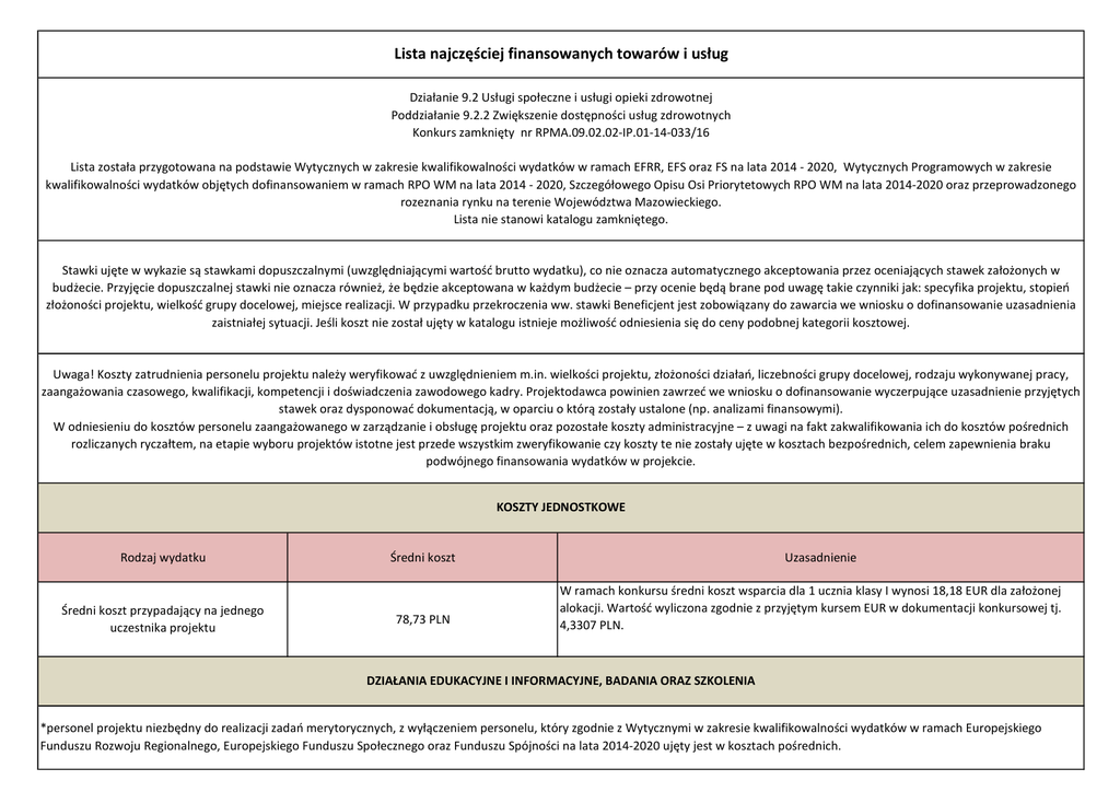 Lista najczęściej finansowanych towarów i usług Działanie 9.2 Usługi społeczne i usługi opieki zdrowotnej Poddziałanie 9.2.2 Zwiększenie dostępności usług zdrowotnych Konkurs zamknięty nr RPMA.09.02.02-IP.01-14-033/16 Lista została przygotowana na podstawie Wytycznych w zakresie kwalifikowalności wydatków w ramach EFRR, EFS oraz FS na lata 2014 - 2020, Wytycznych Programowych w zakresie kwalifikowalności wydatków objętych dofinansowaniem w ramach RPO WM na lata 2014 - 2020, Szczegółowego Opisu Osi Priorytetowych RPO WM na lata 2014-2020 oraz przeprowadzonego rozeznania rynku na terenie Województwa Mazowieckiego. Lista nie stanowi katalogu zamkniętego. Stawki ujęte w wykazie są stawkami dopuszczalnymi (uwzględniającymi wartość brutto wydatku), co nie oznacza automatycznego akceptowania przez oceniających stawek założonych w budżecie. Przyjęcie dopuszczalnej stawki nie oznacza również, że będzie akceptowana w każdym budżecie – przy ocenie będą brane pod uwagę takie czynniki jak: specyfika projektu, stopień złożoności projektu, wielkość grupy docelowej, miejsce realizacji. W przypadku przekroczenia ww. stawki Beneficjent jest zobowiązany do zawarcia we wniosku o dofinansowanie uzasadnienia zaistniałej sytuacji. Jeśli koszt nie został ujęty w katalogu istnieje możliwość odniesienia się do ceny podobnej kategorii kosztowej. Uwaga! Koszty zatrudnienia personelu projektu należy weryfikować z uwzględnieniem m.in. wielkości projektu, złożoności działań, liczebności grupy docelowej, rodzaju wykonywanej pracy, zaangażowania czasowego, kwalifikacji, kompetencji i doświadczenia zawodowego kadry. Projektodawca powinien zawrzeć we wniosku o dofinansowanie wyczerpujące uzasadnienie przyjętych stawek oraz dysponować dokumentacją, w oparciu o którą zostały ustalone (np. analizami finansowymi). W odniesieniu do kosztów personelu zaangażowanego w zarządzanie i obsługę projektu oraz pozostałe koszty administracyjne – z uwagi na fakt zakwalifikowania ich do kosztów pośrednich rozliczanych ryczałtem, na etapie wyboru projektów istotne jest przede wszystkim zweryfikowanie czy koszty te nie zostały ujęte w kosztach bezpośrednich, celem zapewnienia braku podwójnego finansowania wydatków w projekcie. KOSZTY JEDNOSTKOWE Rodzaj wydatku Średni koszt przypadający na jednego uczestnika projektu Średni koszt 78,73 PLN Uzasadnienie W ramach konkursu średni koszt wsparcia dla 1 ucznia klasy I wynosi 18,18 EUR dla założonej alokacji. Wartość wyliczona zgodnie z przyjętym kursem EUR w dokumentacji konkursowej tj. 4,3307 PLN. DZIAŁANIA EDUKACYJNE I INFORMACYJNE, BADANIA ORAZ SZKOLENIA *personel projektu niezbędny do realizacji zadań merytorycznych, z wyłączeniem personelu, który zgodnie z Wytycznymi w zakresie kwalifikowalności wydatków w ramach Europejskiego Funduszu Rozwoju Regionalnego, Europejskiego Funduszu Społecznego oraz Funduszu Spójności na lata 2014-2020 ujęty jest w kosztach pośrednich. Rodzaj wydatku Spotkanie informacyjno-edukacyjne w zakresie realizacji przesiewowego badania słuchu Kwota maksymalna brutto 150 PLN Uzasadnienie Spotkanie skierowane w szczególności dla dzieci oraz rodziców / opiekunów dzieci, pedagogów oraz pielęgniarek szkolnych. Będą dotyczyły min. roli zmysłu słuchu w procesach poznawczych, higieny słuchu, występujących wad słuchu i sposobów ich kompensacji, sposobów leczenia i rehabilitacji profilaktyki zaburzeń słuchu. Prowadzone wyłącznie przez absolwentów kierunków medycznych oraz absolwentów kierunku „zdrowie publiczne”. Stawka dotyczy wynagrodzenia prelegenta za przeprowadzenie jednego wykładu i wydruk materiałów informacyjnych dla uczestników spotkania. Zakłada się, że w każdej placówce oświatowej – szkole - odbędzie się co najmniej jedno takie spotkanie w każdym roku trwania programu. • wstępne badanie lekarskie kwalifikacyjne, mające na celu wykluczenie przeszkód natury medycznej, Badanie przesiewowe słuchu Zgodnie z kwotami rynkowymi obowiazującymi • progowe badanie audiometryczne słuchu dla przewodnictwa powietrznego dla częstotliwości: na obszarze realizacji projektu (rekomendowane 500, 1 000, 2 000, 4 000 i 8 000 Hz. W szczególnych przypadkach rozszerzone o częstotliwości uzasadnienie przyjętych stawek we wniosku) półoktawowe (3 000 i 6 000 Hz), • test oceniający centralne procesy słuchowe (badanie dźwiękami LINGA-dźwięki mowy) dobrany stosownie do rozwoju dziecka. Szkolenie dla personelu medycznego, personelu placówek oświatowych z zakresu laryngologii, foniatrii, audiologii i logopedii 2 000 PLN Działania informacyjno – szkoleniowe skierowane w szczególności do lekarzy i pielęgniarek POZ, lekarzy orzeczników, położnych, pielęgniarek środowiskowych, pielęgniarek i higienistek szkolnych, pedagogów, psychologów, rehabilitantów, fizjoterapeutów zwiększające umiejętności i kompetencje w zakresie wczesnego wykrywania deficytów słuchu wśród pacjentów w wieku szkolnym. Prowadzone wyłącznie przez absolwentów kierunków medycznych oraz absolwentów kierunku „zdrowie publiczne". Zgodnie z Wytycznymi Programowymi w zakresie kwalifikowalności wydatków objętych dofinansowaniem w ramach RPO WM na lata 2014-2020, wartość wydatków związanych ze zleceniem usług merytorycznych w ramach projektu nie może przekraczać 30% wartości projektu. WYDATKI TOWARZYSZĄCE Rodzaj wydatku Catering - przerwa kawowa Catering - przerwa kawowa i obiad Kwota maksymalna brutto Uzasadnienie 25 PLN/osoba/dzień szkoleniowy Wydatek kwalifikowalny, o ile jest to uzasadnione specyfiką i celami realizowanego projektu. Możliwość kwalifikowania jedynie w przypadku, gdy zajęcia trwają nie krócej niż 4 godziny lekcyjne dziennie. Obejmuje kawę, herbatę, wodę, mleko, cukier, cytryna, drobne słone lub słodkie przekąski typu paluszki lub kruche ciastka lub owoce, przy czym istnieje możliw