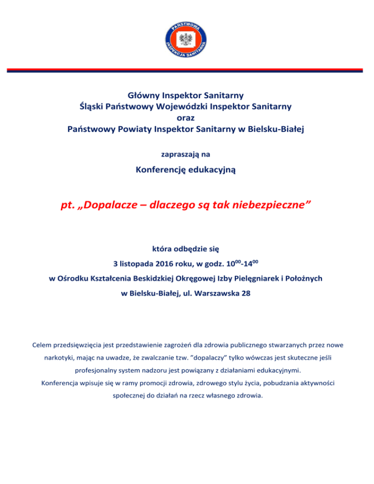 Główny Inspektor Sanitarny Śląski Państwowy Wojewódzki Inspektor Sanitarny oraz Państwowy Powiaty Inspektor Sanitarny w Bielsku-Białej zapraszają na Konferencję edukacyjną pt. „Dopalacze – dlaczego są tak niebezpieczne” która odbędzie się 3 listopada 2016 roku, w godz. 1000-1400 w Ośrodku Kształcenia Beskidzkiej Okręgowej Izby Pielęgniarek i Położnych w Bielsku-Białej, ul. Warszawska 28 Celem przedsięwzięcia jest przedstawienie zagrożeń dla zdrowia publicznego stwarzanych przez nowe narkotyki, mając na uwadze, że zwalczanie tzw. ”dopalaczy” tylko wówczas jest skuteczne jeśli profesjonalny system nadzoru jest powiązany z działaniami edukacyjnymi. Konferencja wpisuje się w ramy promocji zdrowia, zdrowego stylu życia, pobudzania aktywności społecznej do działań na rzecz własnego zdrowia. Program Konferencji 900-1000 Rejestracja uczestników 1000-1005 Rozpoczęcie Konferencji, przywitanie uczestników lek. med. Urszula Mendera-Bożek – Śląski Państwowy Wojewódzki Inspektor Sanitarny 1005-1020 Zwalczanie zagrożeń stwarzanych przez nowe narkotyki w działaniach Państwowej Inspekcji Sanitarnej lek. med. Urszula Mendera-Bożek – Śląski Państwowy Wojewódzki Inspektor Sanitarny 1020-1050 Edukacja w zakresie zagrożeń wynikających z użycia nowych narkotyków w aspekcie programu nauczania studentów dr hab. n. med. Małgorzata Kowalska – Katedra i Zakład Epidemiologii, Śląski Uniwersytet Medyczny 1050-1120 Skutki zdrowotne działania nowych narkotyków, diagnostyka zatruć nowymi narkotykami lek. med. Anna Bazylewicz – Ordynator Oddziału Chorób Zawodowych z Pododdziałem Chorób Wewnętrznych i Pododdziałem Alergologii, Regionalny Ośrodek Ostrych Zatruć z Oddziałem Toksykologii Klinicznej, Instytut Medycyny Pracy i Zdrowia Środowiskowego w Sosnowcu 1120-1135 Problem zatruć nowymi narkotykami z punktu widzenia ratownictwa medycznego lek. med. Aleksander Rutkiewicz – Oddział Anestezjologii i Intensywnej Terapii oraz Szpitalny Oddział Ratunkowy, Szpital Śląski w Cieszynie 1135-1200 Współczesne uzależnienia młodzieży na podstawie doświadczeń Ośrodka „Nadzieja” w Bielsku-Białej Ks. Józef Walusiak – specjalista terapii uzależnień, założyciel Fundacji Zapobiegania i Resocjalizacji Uzależnień „Nadzieja” 1200-1230 Przerwa 1230-1300 Przypadki zgonów po użyciu nowych środków psychoaktywnych w praktyce Zakładu Medycyny Sądowej mgr Ewelina Pieprzyca – Katedra i Zakład Medycyny Sądowej i Toksykologii SądowoLekarskiej, Śląski Uniwersytet Medyczny 1300-1315 Rozprzestrzenianie się nowych narkotyków – walka z dynamicznym rynkiem podinspektor celny Krzysztof Kasztura – Naczelnik Urzędu Celnego w Bielsku-Białej 1315-1345 Rozprzestrzenianie się nowych narkotyków – walka z dynamicznym rynkiem Paweł Marciniak – Kierownik Referatu do Walki z Przestępczością Narkotykową, Miejska Komenda Policji w Bielsku-Białej 1345-1400 Podsumowanie i zakończenie Konferencji Przesłanie: Edukacja podstawowym elementem stwarzanych przez nowe narkotyki. strategii zwalczania zagrożeń