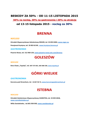 BESKIDY ZA 50% - OD 11-15 LISTOPADA 2015 50% na nocleg, 30% na gastronomię i 20% na atrakcję od 13-15 listopada 2015 - nocleg za 30% BRENNA NOCLEGI Ośrodek Wypoczynkowo-Szkoleniowy REGOR, tel. 33 853 6304, www.regor.eu Pensjonat Krystyna, tel. 33 853 62 80 , www.krystyna.brenna.pl GASTRONOMIA Pizzeria Nowa, tel. 512 960 129, www.pizzeria-nowa.wix.com/brenna GOLESZÓW NOCLEGI Etno Chata „Topolej”, tel. 607 272 831, 665 668 228, www.topolej.pl GÓRKI WIELKIE GASTRONOMIA Karczma pod Strzechom, tel. 33 857 90 73, www.karczmapodstrzechom.pl ISTEBNA NOCLEGI Ośrodek Szkoleniowo-Wypoczynkowy SZAROTKA, tel. 33 855 6018, www.szarotkaistebna.pl Willa Zwolakówka , tel.601 050 030, www.zwolakowka.pl GASTRONOMIA Restauracja w OSW Szarotka, tel. 33 855 6018, www.szarotkaistebna.pl ATRAKCJE Park Linowy Base Camp, tel. 888 661 794 , www.bcamp.pl Wypożyczalnia Rowerów Base Camp, tel. 888 661 794 , www.bcamp.pl KORBIELÓW ATRAKCJE Spa w Górskim Ośrodku Wypoczynkowym Połonina , tel.33 863 4033, www.polonina.com.pl/spa Wypożyczalnia rowerów w Górskim Ośrodku Wypoczynkowym Połonina, tel.33 863 4033, www.polonina.com.pl USTROŃ NOCLEGI Ośrodek Szkoleniowo-Wypoczynkowy ONDRASZEK, tel. 33 854 3580, www.ondraszek.pl Ośrodek rehabilitacyjno-wypoczynkowy MUFLON, 33 854 2711, www.orw-muflon.com.pl Pensjonat MILEŻÓWKA, tel.506 251 755, www.milezowka.pl Poniwiec Mała Czantoria, tel. 33 854 3210, www.poniwiec.pl ATRAKCJE SPA & WELLNESS Ośrodek rehabilitacyjno-wypoczynkowy MUFLON, 33 854 2711, www.orw-muflon.com.pl WISŁA NOCLEGI Hotel Polonia, tel. 33 855 3555, www. www.polonia.jur-gast.pl/news.php Willa Centrum, tel. 518 117 836, www.willacentrum.pl Willa Dana, tel. 602 506 349, www.dana-wisla.eu Willa Jodła, tel. 507 679 776 Willa Księżówka, tel. 501 322 179, www.ksiezowka.pl ATRAKCJE BC CROSS, tel. 33 855 3620, www.bccross.pl Ciuchcia Martusia, tel. 607 153 709 , www.itawisla.pl Dyskoteka 21:00 w Hotelu Polonia, tel. 33 855 3555, www. www.polonia.jurgast.pl/news.php Korty Tenisowe, tel. 508 361 151, www.ksiezowka.pl