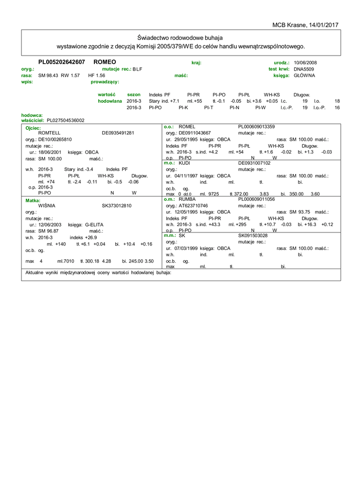 MCB Krasne, 14/01/2017 Świadectwo rodowodowe buhaja wystawione zgodnie z decyzją Komisji 2005/379/WE do celów handlu wewnątrzwspólnotowego. PL005202642607 oryg.: rasa: SM 98.43 RW 1.57 wpis: ROMEO kraj: mutacje rec.: B L F HF 1.56 prowadzący: wartość hodowlana sezon 2016-3 2016-3 maść: urodz.: 10/06/2008 test krwi: DNA5509 księga: GŁÓWNA Indeks PF PI-PR PI-PO PI-PŁ WH-KS Długow. Stary ind. +7.1 ml. +55 tł. -0.1 -0.05 bi. +3.6 +0.05 l.c. 19 l.o. PI-PO PI-K PI-T PI-N PI-W l.c.-P. 19 l.o.-P. hodowca: właściciel: P L02 750 45 360 02 o.o.: ROMEL PL000609013359 oryg.: DE0911043667 mutacje rec.: ur. 29/05/1995 księga: OBCA rasa: SM 100.00 maść.: Indeks PF PI-PR PI-PŁ WH-KS Długow. w.h. 2016-3 s.ind. +4.2 ml. +54 tł. +1.6 -0.02 bi. +1.3 -0.03 o.p. PI-PO N W m.o.: KUDI DE0931007102 w.h. 2016-3 Stary ind. -3.4 Indeks PF oryg.: mutacje rec.: PI-PR PI-PŁ WH-KS Długow. ur. 04/11/1997 księga: OBCA rasa: SM 100.00 maść.: ml. +74 tł. -2.4 -0.11 bi. -0.5 -0.06 w.h. ind. ml. tł. bi. o.p. 2016-3 oc.b. og. PI-PO N W max 0 dd.0 ml. 9725 tł. 372.00 3.83 bi. 350.00 3.60 o.m.: RUMBA PL000609011056 Matka: WIŚNIA SK373012810 oryg.: AT623710746 mutacje rec.: oryg.: ur. 12/05/1995 księga: OBCA rasa: SM 93.75 maść.: mutacje rec.: Indeks PF PI-PR PI-PŁ WH-KS Długow. w.h. 2016-3 s.ind. +43.3 ml. +295 tł. +10.7 -0.03 bi. +16.3 +0.12 ur.: 12/06/2003 księga: G-ELITA o.p. PI-PO N W rasa: SM 96.87 maść.: m.m.: SK SK091503028 w.h. 2016-3 indeks +26.9 oryg.: mutacje rec.: ml. +140 tł. +6.1 +0.04 bi. +10.4 +0.16 ur. 07/03/1999 księga: OBCA rasa: SM 100.00 maść.: oc.b. og. w.h. ind. ml. tł. bi. max 4 ml.7010 tł. 300.18 4.28 bi. 245.00 3.50 oc.b. og. max ml. tł. bi. Aktualne wyniki międzynarodowej oceny wartości hodowlanej buhaja: Ojciec: ROMTELL DE0935491281 oryg.: DE10/00265810 mutacje rec.: ur.: 18/06/2001 księga: OBCA rasa: SM 100.00 maść.: 18 16