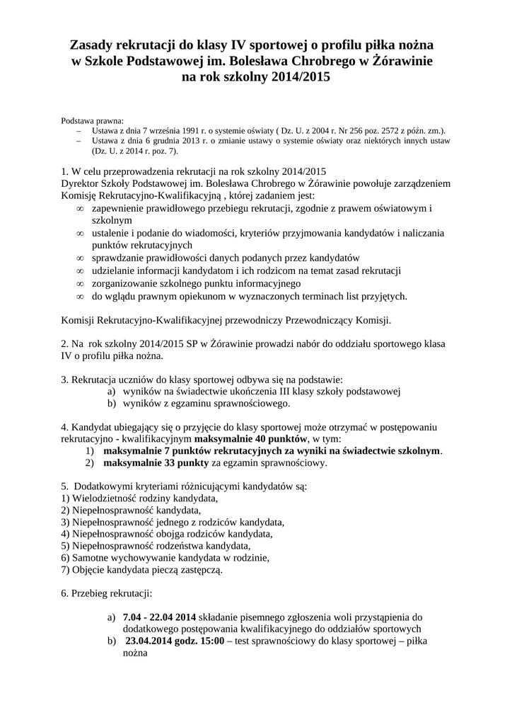 Zasady rekrutacji do klasy IV sportowej o profilu piłka nożna w Szkole Podstawowej im. Bolesława Chrobrego w Żórawinie na rok szkolny 2014/2015 Podstawa prawna: – Ustawa z dnia 7 września 1991 r. o systemie oświaty ( Dz. U. z 2004 r. Nr 256 poz. 2572 z późn. zm.). – Ustawa z dnia 6 grudnia 2013 r. o zmianie ustawy o systemie oświaty oraz niektórych innych ustaw (Dz. U. z 2014 r. poz. 7). 1. W celu przeprowadzenia rekrutacji na rok szkolny 2014/2015 Dyrektor Szkoły Podstawowej im. Bolesława Chrobrego w Żórawinie powołuje zarządzeniem Komisję Rekrutacyjno-Kwalifikacyjną , której zadaniem jest: • zapewnienie prawidłowego przebiegu rekrutacji, zgodnie z prawem oświatowym i szkolnym • ustalenie i podanie do wiadomości, kryteriów przyjmowania kandydatów i naliczania punktów rekrutacyjnych • sprawdzanie prawidłowości danych podanych przez kandydatów • udzielanie informacji kandydatom i ich rodzicom na temat zasad rekrutacji • zorganizowanie szkolnego punktu informacyjnego • do wglądu prawnym opiekunom w wyznaczonych terminach list przyjętych. Komisji Rekrutacyjno-Kwalifikacyjnej przewodniczy Przewodniczący Komisji. 2. Na rok szkolny 2014/2015 SP w Żórawinie prowadzi nabór do oddziału sportowego klasa IV o profilu piłka nożna. 3. Rekrutacja uczniów do klasy sportowej odbywa się na podstawie: a) wyników na świadectwie ukończenia III klasy szkoły podstawowej b) wyników z egzaminu sprawnościowego. 4. Kandydat ubiegający się o przyjęcie do klasy sportowej może otrzymać w postępowaniu rekrutacyjno - kwalifikacyjnym maksymalnie 40 punktów, w tym: 1) maksymalnie 7 punktów rekrutacyjnych za wyniki na świadectwie szkolnym. 2) maksymalnie 33 punkty za egzamin sprawnościowy. 5. Dodatkowymi kryteriami różnicującymi kandydatów są: 1) Wielodzietność rodziny kandydata, 2) Niepełnosprawność kandydata, 3) Niepełnosprawność jednego z rodziców kandydata, 4) Niepełnosprawność obojga rodziców kandydata, 5) Niepełnosprawność rodzeństwa kandydata, 6) Samotne wychowywanie kandydata w rodzinie, 7) Objęcie kandydata pieczą zastępczą. 6. Przebieg rekrutacji: a) 7.04 - 22.04 2014 składanie pisemnego zgłoszenia woli przystąpienia do dodatkowego postępowania kwalifikacyjnego do oddziałów sportowych b) 23.04.2014 godz. 15:00 – test sprawnościowy do klasy sportowej – piłka nożna c) 28.04.2014 – w sekretariacie szkoły do wglądu lista dzieci przyjętych do oddziału sportowego. UWAGA! Osoby, które nie dostaną się do szkoły nie będą mogły odebrać złożonych dokumentów w postępowaniu rekrutacyjnym, ponieważ szkoła ma obowiązek przechowywać je przez okres 1 roku. 7. Od 7 kwietnia 2014 w szkole działa punkt informacyjny, czynny codziennie od godz. 10.00 do 12.00 w sekretariacie.