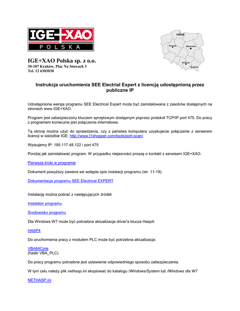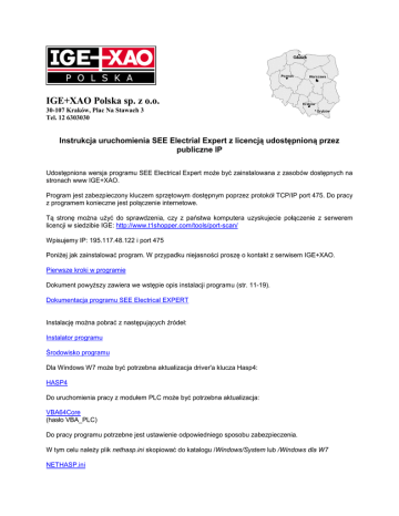 IGE+XAO Polska sp. z o.o. 30-107 Kraków, Plac Na Stawach 3 Tel. 12 6303030 Instrukcja uruchomienia SEE Electrial Expert z licencją udostępnioną przez publiczne IP Udostępniona wersja programu SEE Electrical Expert może być zainstalowana z zasobów dostępnych na stronach www IGE+XAO. Program jest zabezpieczony kluczem sprzętowym dostępnym poprzez protokół TCP/IP port 475. Do pracy z programem konieczne jest połączenie internetowe. Tą stronę można użyć do sprawdzenia, czy z państwa komputera uzyskujecie połączenie z serwerem licencji w siedzibie IGE: http://www.t1shopper.com/tools/port-scan/ Wpisujemy IP: 195.117.48.122 i port 475 Poniżej jak zainstalować program. W przypadku niejasności proszę o kontakt z serwisem IGE+XAO. Pierwsze kroki w programie Dokument powyższy zawiera we wstępie opis instalacji programu (str. 11-19). Dokumentacja programu SEE Electrical EXPERT Instalację można pobrać z następujących źródeł: Instalator programu Środowisko programu Dla Windows W7 może być potrzebna aktualizacja driver'a klucza Hasp4: HASP4 Do uruchomienia pracy z modułem PLC może być potrzebna aktualizacja: VBA64Core (hasło VBA_PLC) Do pracy programu potrzebne jest ustawienie odpowiedniego sposobu zabezpieczenia. W tym celu należy plik nethasp.ini skopiować do katalogu /Windows/System lub /Windows dla W7 NETHASP.ini Dalej należy uruchomić program Expert Start>Programy> SEE Electrical Expert > Konfiguracja SEE electrical Wypełnić pola jak poniżej, w zakładce "Bezpieczeństwo" naciskamy ikonę "Sposób zabezpieczenia programu". Odczyt klucza zabezpieczającego powinien wyglądać później jak na ilustracji poniżej. Naciskamy ikonę ”Informacje zabezpieczeń”. Uruchomić program skrótem z pulpitu(lub polecenie menu start). W przypadku niejasności prosimy o kontakt z serwisem hotline: Paweł Rospond tel. 12 630 30 30/443 Szymon Pękala tel. 12 630 30 30/445
