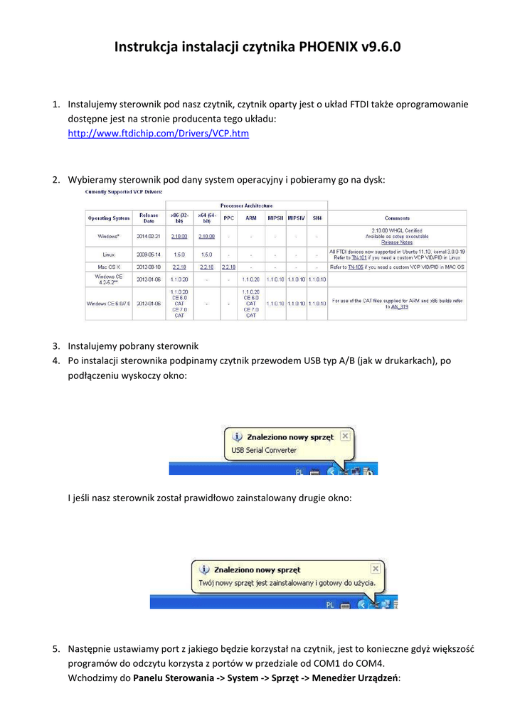 Instrukcja instalacji czytnika PHOENIX v9.6.0 1. Instalujemy sterownik pod nasz czytnik, czytnik oparty jest o układ FTDI także oprogramowanie dostępne jest na stronie producenta tego układu: http://www.ftdichip.com/Drivers/VCP.htm 2. Wybieramy sterownik pod dany system operacyjny i pobieramy go na dysk: 3. Instalujemy pobrany sterownik 4. Po instalacji sterownika podpinamy czytnik przewodem USB typ A/B (jak w drukarkach), po podłączeniu wyskoczy okno: I jeśli nasz sterownik został prawidłowo zainstalowany drugie okno: 5. Następnie ustawiamy port z jakiego będzie korzystał na czytnik, jest to konieczne gdyż większość programów do odczytu korzysta z portów w przedziale od COM1 do COM4. Wchodzimy do Panelu Sterowania -> System -> Sprzęt -> Menedżer Urządzeń: 6. Po wejściu w Menedżer Urządzeń przechodzimy do okna: Porty (COM i LPT) i sprawdzamy pod jakim portem zainstalował się nasz czytnik (w moim przypadku na porcie COM22): W tym przypadku należy zmienić port ręcznie, w przypadku gdy zainstaluje się pod portami COM1 do COM4 nie jest konieczna ta operacja. 7. Ręczna zmiana numeru portu dla naszego czytnika. Klikamy dwukrotnie prawym przyciskiem myszy na nasz port USB Serial Port, wchodzimy w zakładkę Ustawienia Portu -> Zaawansowane: 8. Otworzy się okno Zaawansowane ustawienia dla: COM22 (dla mojego przypadku): I zmieniamy go na któryś z zakresu od COM1 do COM4 (w tym przypadku wybieram COM3): Potwierdzam wybór OK i TAK w następnym oknie. Czytnik jest już zainstalowany pod portem COM3. 9. Odczyt karty TnK w programie Malinowy, uruchamiamy program, ustawiamy czytnik dla pracy o częstotliwości 3.57MHz i wsuwamy kartę TnK do czytnika. 10. Wybieramy wcześniej ustawiony port COM, w moim przypadku to jest COM3: Po wybraniu przyciskamy Port Open oraz Read: I karta odczytana, aby wyjść należy najpierw zamknąć port klikając w przycisk Port Close: