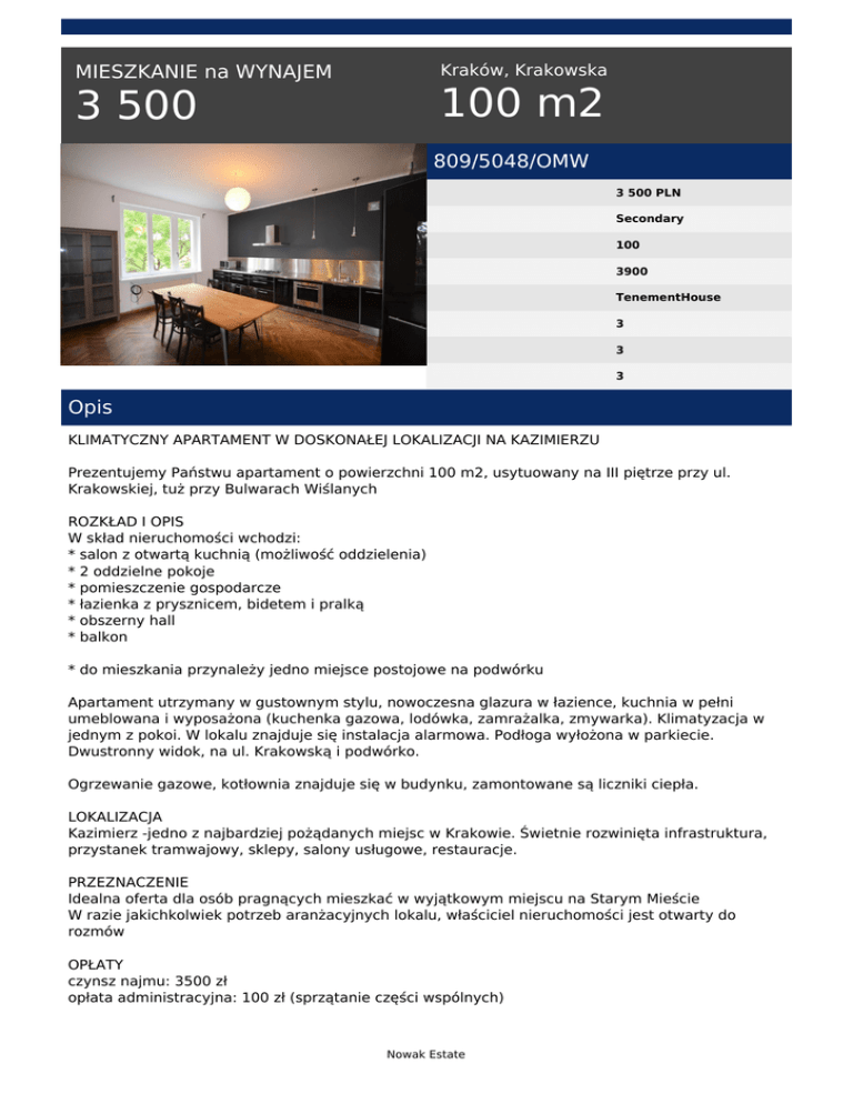 Kraków, Krakowska MIESZKANIE na WYNAJEM 100 m2 3 500 809/5048/OMW 3 500 PLN Secondary 100 3900 TenementHouse 3 3 3 Opis KLIMATYCZNY APARTAMENT W DOSKONAŁEJ LOKALIZACJI NA KAZIMIERZU Prezentujemy Państwu apartament o powierzchni 100 m2, usytuowany na III piętrze przy ul. Krakowskiej, tuż przy Bulwarach Wiślanych ROZKŁAD I OPIS W skład nieruchomości wchodzi: * salon z otwartą kuchnią (możliwość oddzielenia) * 2 oddzielne pokoje * pomieszczenie gospodarcze * łazienka z prysznicem, bidetem i pralką * obszerny hall * balkon * do mieszkania przynależy jedno miejsce postojowe na podwórku Apartament utrzymany w gustownym stylu, nowoczesna glazura w łazience, kuchnia w pełni umeblowana i wyposażona (kuchenka gazowa, lodówka, zamrażalka, zmywarka). Klimatyzacja w jednym z pokoi. W lokalu znajduje się instalacja alarmowa. Podłoga wyłożona w parkiecie. Dwustronny widok, na ul. Krakowską i podwórko. Ogrzewanie gazowe, kotłownia znajduje się w budynku, zamontowane są liczniki ciepła. LOKALIZACJA Kazimierz -jedno z najbardziej pożądanych miejsc w Krakowie. Świetnie rozwinięta infrastruktura, przystanek tramwajowy, sklepy, salony usługowe, restauracje. PRZEZNACZENIE Idealna oferta dla osób pragnących mieszkać w wyjątkowym miejscu na Starym Mieście W razie jakichkolwiek potrzeb aranżacyjnych lokalu, właściciel nieruchomości jest otwarty do rozmów OPŁATY czynsz najmu: 3500 zł opłata administracyjna: 100 zł (sprzątanie części wspólnych) Nowak Estate media: prąd, woda, gaz, wywóz śmieci kaucja: jednomiesięczna W momencie wynajęcia nieruchomości, biuro pobiera jednorazowo wynagrodzenie w wysokości jednego czynszu najmu plus VAT Gorąco polecam i zapraszam na prezentacje Opiekun oferty: Angelika Zender 530-900-086 Więcej na stronie: www.nestate.pl Angelika Zender tel. 530 900 086 email: [email protected] Nowak Estate Powered by TCPDF (www.tcpdf.org)