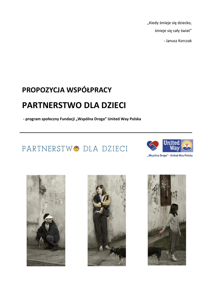 „Kiedy śmieje się dziecko, śmieje się cały świat” - Janusz Korczak PROPOZYCJA WSPÓŁPRACY PARTNERSTWO DLA DZIECI - program społeczny Fundacji „Wspólna Droga” United Way Polska PROGRAM SPOŁECZNY "PARTNERSTWO DLA DZIECI" Według raportu Komisji Europejskiej, co czwarte dziecko w Polsce żyje w biedzie lub na skraju ubóstwa. „Partnerstwo dla Dzieci” to autorski, wieloletni program naszej Fundacji, który jest odpowiedzią Strona | 2 na ten ogromny problem społeczny. Jego celem jest wspieranie rozwoju dzieci i młodzieży, zagrożonej niedostosowaniem społecznym i marginalizacją. Program, opierając się na współpracy międzysektorowej, łączy możliwości i potencjał różnych środowisk: organizacji pozarządowych, biznesu, samorządu, administracji rządowej, ośrodków naukowych i mediów. Jego formuła jest otwarta dla wszystkich, którzy chcą współdziałać przy opracowywaniu i wprowadzaniu nowoczesnych rozwiązań pomocowych na rzecz dzieci i tworzenia im warunków lepszego rozwoju. Program jest realizowany od 2006 roku dzięki środkom pochodzącym z Funduszu Inicjatyw Obywatelskich Ministerstwa Pracy i Polityki Społecznej, m. st. Warszawa, dotacjom firm partnerskich Fundacji „Wspólna Droga” United Way Polska oraz wsparciu indywidualnych darczyńców. BENEFICJENCI PROGRAMU Program jest adresowany do dzieci i młodzieży polskich miast, pochodzących z rodzin o niskim statusie materialnym i kulturowym, często dysfunkcyjnych. Dzieci te większość swego czasu spędzają na ulicach i podwórkach, w grupie rówieśniczej, bez nadzoru ze strony dorosłych, bez nadziei na lepszą przyszłość. Zaniżone poczucie własnej wartości, niskie aspiracje, a w konsekwencji wypadanie z systemu edukacyjnego, wynikają z braku wzorców oraz zaległości szkolnych. Dzisiejsza pomoc tym dzieciom jest dobrą, trwałą „inwestycją” w życie ich samych, ich rodzin i całego społeczeństwa. CELE PROGRAMU Celem programu jest przeciwdziałanie marginalizacji tej grupy dzieci i wyrównywanie ich szans przez budzenie aspiracji edukacyjnych i wydłużanie ścieżki edukacyjnej, a także rozwój indywidualnych zdolności i talentów. Program przyczynia się także do wzmocnienia systemu opieki nad dzieckiem ze środowisk defaworyzowanych oraz zwraca uwagę opinii publicznej na problemy dzieci "mniejszych szans." Fundacja „Wspólna Droga” United Way Polska 04-030 Warszawa, Kinowa 19/U-1; tel. 22 621 28 09; fax 22 622 60 00; [email protected], www.wspolnadroga.pl DZIAŁANIA REALIZOWANE W RAMACH PROGRAMU Przedstawione poniżej działania Fundacji przyczyniają się do poprawy sytuacji konkretnych dzieci, współtworzą system pomocy i aktywizują społeczeństwo do działania: 1. Koordynowanie i finansowanie programu mikrostypendiów edukacyjno-artystycznych, które umożliwiają dzieciom wyrównywanie zaległości szkolnych, rozwijanie ich zdolności i talentów oraz kształtowanie umiejętności społecznych 2. Dofinansowywanie projektów artystyczno-wychowawczych, które są realizowane przez partnerskie organizacje pozarządowe z całej Polski 3. Udzielanie pomocy materialnej w formie dożywiania, przekazywania pomocy szkolnych, upominków świątecznych 4. Organizowanie szkoleń kształcących pedagogów ulicy 5. Realizowanie autorskich projektów badawczych oraz szkoleniowych 6. Tworzenie lokalnych i ogólnopolskich koalicji na rzecz dzieci, zachęcanie firm do współpracy, organizowanie wolontariatu 7. Organizowanie kampanii informacyjnych i konferencji, wydawanie publikacji. KORZYŚCI Z UDZIAŁU W PARTNERSTWIE DLA DZIECI: nadrabianie zaległości szkolnych, wzrost wiary we własne możliwości i wzrost aspiracji edukacyjnych, pozytywna zmiana w relacjach rodzinnych, poprawa funkcjonowania społecznego, rozwój indywidualnych zainteresowań i talentów DLA ŚRODOWISKA LOKALNEGO: możliwość skorzystania z narzędzi badawczych i modelowych rozwiązań w zakresie pomocy dziecku, w tym zastosowania metody pedagogiki ulicy DLA FIRM: możliwość zbudowania spójnej i długofalowej strategii zaangażowania społecznego firmy oraz jej pracowników, budowanie pozytywnego wizerunku firmy w środowisku lokalnym, integracja pracowników poprzez wolontariat pracowniczy. SZCZEGÓŁOWY OPIS DZIAŁAŃ W RAMACH PROGRAMU "PARTNERSTWO DLA DZIECI" SZKOLENIA PEDAGOGÓW ULICY Fundacja od 2007 roku kształci pracowników organizacji pozarządowych z całego kraju w zakresie pedagogiki ulicy. Program szkoleń został opracowany i jest realizowany przez Fundacja „Wspólna Droga” United Way Polska 04-030 Warszawa, Kinowa 19/U-1; tel. 22 621 28 09; fax 22 622 60 00; [email protected], www.wspolnadroga.pl Strona | 3 praktyków z wieloletnim doświadczeniem – specjalistów streetworkingu oraz socjoterapii ze Stowarzyszenia Grupa Pedagogiki i Animacji Społecznej Praga Północ oraz Stowarzyszenia Przyjaciół Ośrodka Socjoterapeutycznego „Wspólny Dom” w Wildze. W ciągu czterech edycji szkoleń, Fundacja „Wspólna Droga” United Way Polska przygotowała do pracy 68 pedagogów Strona | ulicy oraz, podczas dwudniowych warsztatów, 35 pracowników Towarzystwa Przyjaciół Dzieci. 4 Na zakończenie każdego szkolenia pedagodzy przygotowują własne projekty, które - po ocenie eksperta oraz dofinansowaniu Komisji dystrybucyjnej - są realizowane w ich macierzystych organizacjach. Koszt jednej edycji szkolenia kształtuje się na poziomie 40 tys. złotych. "ŚWIATOTEKA" „Światoteka” to kameralny klub, działający przy Stowarzyszeniu „Serduszko dla Dzieci”, w którym dzieci i młodzież z różnych praskich organizacji pozarządowych może rozwijać swoje zainteresowania i talenty oraz w twórczy sposób zdobywać wiedzę. Różnorodność i wielobarwność prowadzonych w „Światotece” działań sprawia, że każdy młody człowiek, który tutaj trafi, może znaleźć temat najbardziej go interesujący, odkryć nowe pasje. Pod okiem wykwalifikowanego pedagog