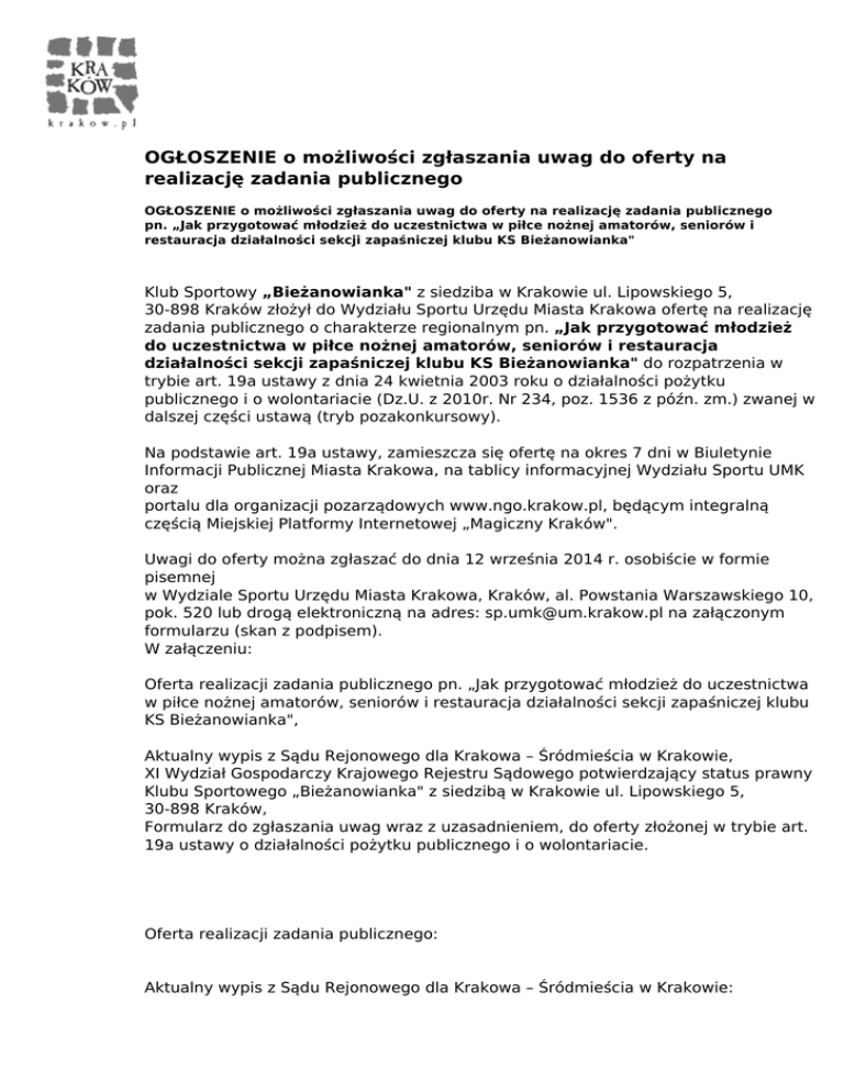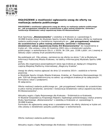 OGŁOSZENIE o możliwości zgłaszania uwag do oferty na realizację zadania publicznego OGŁOSZENIE o możliwości zgłaszania uwag do oferty na realizację zadania publicznego pn. „Jak przygotować młodzież do uczestnictwa w piłce nożnej amatorów, seniorów i restauracja działalności sekcji zapaśniczej klubu KS Bieżanowianka" Klub Sportowy „Bieżanowianka" z siedziba w Krakowie ul. Lipowskiego 5, 30-898 Kraków złożył do Wydziału Sportu Urzędu Miasta Krakowa ofertę na realizację zadania publicznego o charakterze regionalnym pn. „Jak przygotować młodzież do uczestnictwa w piłce nożnej amatorów, seniorów i restauracja działalności sekcji zapaśniczej klubu KS Bieżanowianka" do rozpatrzenia w trybie art. 19a ustawy z dnia 24 kwietnia 2003 roku o działalności pożytku publicznego i o wolontariacie (Dz.U. z 2010r. Nr 234, poz. 1536 z późn. zm.) zwanej w dalszej części ustawą (tryb pozakonkursowy). Na podstawie art. 19a ustawy, zamieszcza się ofertę na okres 7 dni w Biuletynie Informacji Publicznej Miasta Krakowa, na tablicy informacyjnej Wydziału Sportu UMK oraz portalu dla organizacji pozarządowych www.ngo.krakow.pl, będącym integralną częścią Miejskiej Platformy Internetowej „Magiczny Kraków". Uwagi do oferty można zgłaszać do dnia 12 września 2014 r. osobiście w formie pisemnej w Wydziale Sportu Urzędu Miasta Krakowa, Kraków, al. Powstania Warszawskiego 10, pok. 520 lub drogą elektroniczną na adres: [email protected] na załączonym formularzu (skan z podpisem). W załączeniu: Oferta realizacji zadania publicznego pn. „Jak przygotować młodzież do uczestnictwa w piłce nożnej amatorów, seniorów i restauracja działalności sekcji zapaśniczej klubu KS Bieżanowianka", Aktualny wypis z Sądu Rejonowego dla Krakowa – Śródmieścia w Krakowie, XI Wydział Gospodarczy Krajowego Rejestru Sądowego potwierdzający status prawny Klubu Sportowego „Bieżanowianka" z siedzibą w Krakowie ul. Lipowskiego 5, 30-898 Kraków, Formularz do zgłaszania uwag wraz z uzasadnieniem, do oferty złożonej w trybie art. 19a ustawy o działalności pożytku publicznego i o wolontariacie. Oferta realizacji zadania publicznego: Aktualny wypis z Sądu Rejonowego dla Krakowa – Śródmieścia w Krakowie: Powered by TCPDF (www.tcpdf.org)