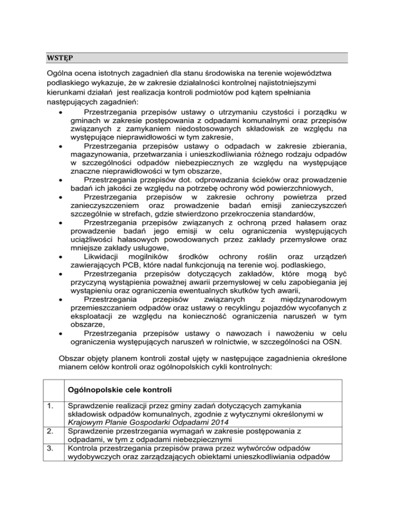 WSTĘP Ogólna ocena istotnych zagadnień dla stanu środowiska na terenie województwa podlaskiego wykazuje, że w zakresie działalności kontrolnej najistotniejszymi kierunkami działań jest realizacja kontroli podmiotów pod kątem spełniania następujących zagadnień: Przestrzegania przepisów ustawy o utrzymaniu czystości i porządku w gminach w zakresie postępowania z odpadami komunalnymi oraz przepisów związanych z zamykaniem niedostosowanych składowisk ze względu na występujące nieprawidłowości w tym zakresie, Przestrzegania przepisów ustawy o odpadach w zakresie zbierania, magazynowania, przetwarzania i unieszkodliwiania różnego rodzaju odpadów w szczególności odpadów niebezpiecznych ze względu na występujące znaczne nieprawidłowości w tym obszarze, Przestrzegania przepisów dot. odprowadzania ścieków oraz prowadzenie badań ich jakości ze względu na potrzebę ochrony wód powierzchniowych, Przestrzegania przepisów w zakresie ochrony powietrza przed zanieczyszczeniem oraz prowadzenie badań emisji zanieczyszczeń szczególnie w strefach, gdzie stwierdzono przekroczenia standardów, Przestrzegania przepisów związanych z ochroną przed hałasem oraz prowadzenie badań jego emisji w celu ograniczenia występujących uciążliwości hałasowych powodowanych przez zakłady przemysłowe oraz mniejsze zakłady usługowe, Likwidacji mogilników środków ochrony roślin oraz urządzeń zawierających PCB, które nadal funkcjonują na terenie woj. podlaskiego, Przestrzegania przepisów dotyczących zakładów, które mogą być przyczyną wystąpienia poważnej awarii przemysłowej w celu zapobiegania jej wystąpieniu oraz ograniczenia ewentualnych skutków tych awarii, Przestrzegania przepisów związanych z międzynarodowym przemieszczaniem odpadów oraz ustawy o recyklingu pojazdów wycofanych z eksploatacji ze względu na konieczność ograniczenia naruszeń w tym obszarze, Przestrzegania przepisów ustawy o nawozach i nawożeniu w celu ograniczenia występujących naruszeń w rolnictwie, w szczególności na OSN. Obszar objęty planem kontroli został ujęty w następujące zagadnienia określone mianem celów kontroli oraz ogólnopolskich cykli kontrolnych: Ogólnopolskie cele kontroli 1. 2. 3. Sprawdzenie realizacji przez gminy zadań dotyczących zamykania składowisk odpadów komunalnych, zgodnie z wytycznymi określonymi w Krajowym Planie Gospodarki Odpadami 2014 Sprawdzenie przestrzegania wymagań w zakresie postępowania z odpadami, w tym z odpadami niebezpiecznymi Kontrola przestrzegania przepisów prawa przez wytwórców odpadów wydobywczych oraz zarządzających obiektami unieszkodliwiania odpadów 4. 5. 6. 7. 8. 9. 10. 11. 12. 13. 14. 15. 16. 17. 18. 19. 20. 21. 22. 23. 24. 25. 26. 27. wydobywczych Kontrola gospodarki osadami ściekowymi, obejmująca wytwarzanie, wykorzystywanie, unieszkodliwianie osadów ściekowych Kontrola przestrzegania wymagań wynikających z ustawy o gospodarce opakowaniami i odpadami opakowaniowymi Kontrola terenów zanieczyszczonych i zdegradowanych składowaniem niebezpiecznych odpadów przemysłowych Ocena przestrzegania wymagań wynikających z ustawy o bateriach i akumulatorach przez podmioty prowadzące działalność w zakresie wytwarzania, zbierania i przetwarzania zużytych baterii i zużytych akumulatorów Kontrola podmiotów wprowadzających ścieki do wód lub do ziemi pod kątem sprawdzenia przestrzegania prawa i decyzji administracyjnych Kontrola wywiązania się aglomeracji priorytetowych z realizacji zadań ujętych w KPOŚK 2010, wg stanu na dzień 31 grudnia 2014r. Sprawdzenie przestrzegania przepisów ochrony środowiska w zakresie emisji substancji i energii do powietrza Sprawdzenie wykonywania zadań określonych w programach ochrony powietrza i planach działań krótkoterminowych Sprawdzenie przestrzegania przepisów ochrony środowiska w zakresie emisji hałasu do środowiska Sprawdzenie przestrzegania przepisów przez podmioty używające czynników chłodniczych oraz dokonujące obrotu nimi pod kątem zastępowania SZWO czynnikami z grupy F-gazów Sprawdzenie przestrzegania przepisów dotyczących substancji chemicznych i ich mieszanin Poprawa jakości danych dostarczanych przez prowadzących instalację w ramach Krajowego Rejestru Uwalniania i Transferu Zanieczyszczeń Sprawdzenie zawartości siarki w ciężkim oleju opałowym stosowanym w instalacjach energetycznego spalania paliw Sprawdzenie zawartości siarki w oleju do silników statków żeglugi śródlądowej Kontrola gospodarstw rolnych podlegających ocenie wypełniania wymogów wzajemnej zgodności (cross-compliance) Sprawdzenie wyeliminowania z użytkowania instalacji i urządzeń zawierających poniżej 50 ppm PCB Kontrola w zakresie monitorowania stanu likwidacji magazynów i mogilników środków chemicznych ochrony roślin Kontrola w zakresie realizacji zadań programu likwidacji „bomb ekologicznych” Kontrola w zakresie przeciwdziałania poważnym awariom Kontrola w zakresie poszukiwania i rozpoznawania złóż gazu łupkowego Kontrola zakładów przetwarzania zużytego sprzętu elektrycznego i elektronicznego Kontrola przestrzegania przepisów ustawy o zużytym sprzęcie elektrycznym i elektronicznym Kontrola stacji demontażu pojazdów Kontrola przestrzegania przepisów ustawy o recyklingu pojazdów 28. 29. 30. 31. wycofanych z eksploatacji Działania kontrolne w ramach funkcjonowania systemu transgranicznego przemieszczania odpadów Sprawdzenie prawidłowości funkcjonowania instalacji przetwarzających i wytwarzających odpady, do których są przywożone, lub z których są wywożone odpady w ramach transgranicznego przemieszczania odpadów Ocena zgodności wyrobów z zasadniczymi wymaganiami przestrzegania Dyrektywy 94/62/WE w sprawie opakowań i odpadów opakowaniowych Ocena zgodności wyrobów z zasadniczymi wymaganiami przestrzegania Dyrektywy 2000/14/WE w sprawie emisji hałasu do otoczenia przez urządzenia u