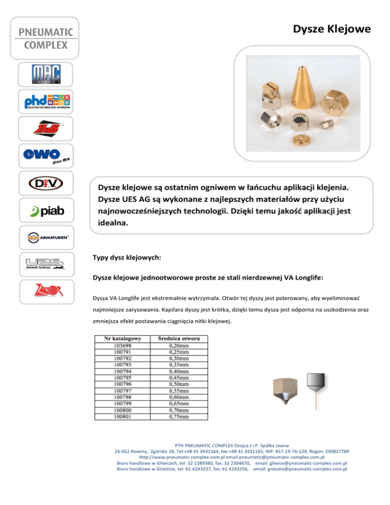 Dysze Klejowe Dysze klejowe są ostatnim ogniwem w łańcuchu aplikacji klejenia. Dysze UES AG są wykonane z najlepszych materiałów przy użyciu najnowocześniejszych technologii. Dzięki temu jakość aplikacji jest idealna. Typy dysz klejowych: Dysze klejowe jednootworowe proste ze stali nierdzewnej VA Longlife: Dysza VA Longlife jest ekstremalnie wytrzymała. Otwór tej dyszy jest polerowany, aby wyeliminować najmniejsze zarysowania. Kapilara dyszy jest krótka, dzięki temu dysza jest odporna na uszkodzenia oraz zmniejsza efekt postawania ciągnięcia nitki klejowej. PTH PNEUMATIC COMPLEX Osojca J.i P. Spółka Jawna 26-052 Nowiny, Zgórsko 1B, Tel:+48 41 3431164, fax:+48 41 3431165, NIP: 657-19-76-128, Regon: 290827789 http://www.pneumatic-complex-com.pl email:[email protected] Biuro handlowe w Gliwicach, tel: 32 2389380, fax: 32 2304870, email: [email protected] Biuro handlowe w Gnieźnie, tel: 61 4243237, fax: 61 4243256, email: [email protected] Dysze Klejowe Dysze klejowe wielootworowe proste: W niektórych aplikacjach należy podać dwie lub więcej kropli/ linii klejowych w niedużej odległości w tym samym czasie. W takich przypadkach stosuje się dysze wielootworowe. Odległość między kroplami definiuje kąt między otworami dyszy. PTH PNEUMATIC COMPLEX Osojca J.i P. Spółka Jawna 26-052 Nowiny, Zgórsko 1B, Tel:+48 41 3431164, fax:+48 41 3431165, NIP: 657-19-76-128, Regon: 290827789 http://www.pneumatic-complex-com.pl email:[email protected] Biuro handlowe w Gliwicach, tel: 32 2389380, fax: 32 2304870, email: [email protected] Biuro handlowe w Gnieźnie, tel: 61 4243237, fax: 61 4243256, email: [email protected] Dysze Klejowe Dysze klejowe kątowe 90o jednootworowe oraz wielootworowe: Na maszynach gdzie nie ma miejsca stosuje się dysze kątowe 90o. Klej jest aplikowany pod kątem 90o w stosunku do modułu klejowego. Dysze klejowe rozpryskowe: Dysze rozpryskowe do modułów H300 SP. Dysza posiada dodatkowe otwory powietrzne do nadania nitce kleju rotacji. PTH PNEUMATIC COMPLEX Osojca J.i P. Spółka Jawna 26-052 Nowiny, Zgórsko 1B, Tel:+48 41 3431164, fax:+48 41 3431165, NIP: 657-19-76-128, Regon: 290827789 http://www.pneumatic-complex-com.pl email:[email protected] Biuro handlowe w Gliwicach, tel: 32 2389380, fax: 32 2304870, email: [email protected] Biuro handlowe w Gnieźnie, tel: 61 4243237, fax: 61 4243256, email: [email protected]