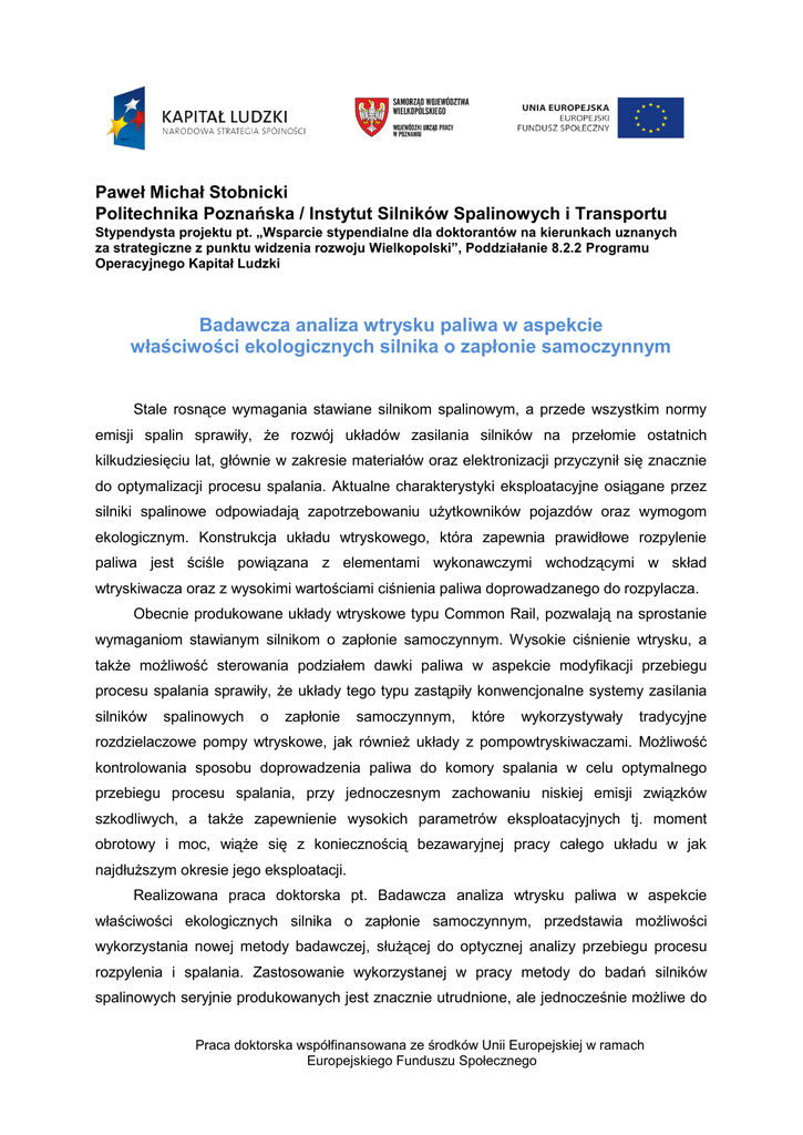 Paweł Michał Stobnicki Politechnika Poznańska / Instytut Silników Spalinowych i Transportu Stypendysta projektu pt. „Wsparcie stypendialne dla doktorantów na kierunkach uznanych za strategiczne z punktu widzenia rozwoju Wielkopolski”, Poddziałanie 8.2.2 Programu Operacyjnego Kapitał Ludzki Badawcza analiza wtrysku paliwa w aspekcie właściwości ekologicznych silnika o zapłonie samoczynnym Stale rosnące wymagania stawiane silnikom spalinowym, a przede wszystkim normy emisji spalin sprawiły, że rozwój układów zasilania silników na przełomie ostatnich kilkudziesięciu lat, głównie w zakresie materiałów oraz elektronizacji przyczynił się znacznie do optymalizacji procesu spalania. Aktualne charakterystyki eksploatacyjne osiągane przez silniki spalinowe odpowiadają zapotrzebowaniu użytkowników pojazdów oraz wymogom ekologicznym. Konstrukcja układu wtryskowego, która zapewnia prawidłowe rozpylenie paliwa jest ściśle powiązana z elementami wykonawczymi wchodzącymi w skład wtryskiwacza oraz z wysokimi wartościami ciśnienia paliwa doprowadzanego do rozpylacza. Obecnie produkowane układy wtryskowe typu Common Rail, pozwalają na sprostanie wymaganiom stawianym silnikom o zapłonie samoczynnym. Wysokie ciśnienie wtrysku, a także możliwość sterowania podziałem dawki paliwa w aspekcie modyfikacji przebiegu procesu spalania sprawiły, że układy tego typu zastąpiły konwencjonalne systemy zasilania silników spalinowych o zapłonie samoczynnym, które wykorzystywały tradycyjne rozdzielaczowe pompy wtryskowe, jak również układy z pompowtryskiwaczami. Możliwość kontrolowania sposobu doprowadzenia paliwa do komory spalania w celu optymalnego przebiegu procesu spalania, przy jednoczesnym zachowaniu niskiej emisji związków szkodliwych, a także zapewnienie wysokich parametrów eksploatacyjnych tj. moment obrotowy i moc, wiąże się z koniecznością bezawaryjnej pracy całego układu w jak najdłuższym okresie jego eksploatacji. Realizowana praca doktorska pt. Badawcza analiza wtrysku paliwa w aspekcie właściwości ekologicznych silnika o zapłonie samoczynnym, przedstawia możliwości wykorzystania nowej metody badawczej, służącej do optycznej analizy przebiegu procesu rozpylenia i spalania. Zastosowanie wykorzystanej w pracy metody do badań silników spalinowych seryjnie produkowanych jest znacznie utrudnione, ale jednocześnie możliwe do Praca doktorska współfinansowana ze środków Unii Europejskiej w ramach Europejskiego Funduszu Społecznego zrealizowania. Aktualnie badania tego typu wykonywane są głównie na specjalnych stanowiskach badawczych w laboratoriach oraz ośrodkach badawczo-rozwojowych specjalizujących się w tego typu badaniach, zlokalizowanych również na terenie województwa wielkopolskiego. Wykorzystana w pracy metoda rejestracji procesów zachodzących w komorze spalania silnika spalinowego, pozwala na szeroką analizę rzeczywistej jednostki badawczej podczas jej pracy, co jest główną zaletą technik optycznych. Dzięki temu technologia rejestracji procesów przy użyciu kamery z jednoczesnym pomiarem ciśnień jest coraz częstszą metodą analizy toku rozprzestrzeniania mieszanki paliwowo-powietrznej w cylindrze silnika spalinowego. Pomimo znacznych utrudnień związanych z zastosowaniem metody w produkcji seryjnej silników spalinowych, a także rejestracji obrazów wewnątrz cylindra, metoda badań optycznych pozwala na znaczące zmniejszenie nakładów finansowych koncernów motoryzacyjnych produkujących nowe jednostki silnikowe. Dodatkową korzyścią jest ponadto uzyskanie szczegółowej analizy procesów zachodzących w komorze spalania nowoczesnych silników, a procesy rozpylenia i spalania paliwa w układach wtryskowych dostarczają szereg nowych informacji w zakresie wielkości szybkozmiennych. W związku z przedstawionym stanem rzeczy, za przedmiot rozprawy postawiono analizę wtrysku paliwa w aspekcie właściwości ekologicznych silnika o zapłonie samoczynnym. Zagadnienie to postanowiono rozwiązać na drodze szczegółowej analizy rozpylenia oleju napędowego. Modelowe badania rozpylenia paliwa wykonane na stanowisku pozasilnikowym, zweryfikowane badaniami symulacyjnymi z wykorzystaniem oprogramowania AVL Fire 2010, skojarzono z wynikami pomiarów emisyjnych związków toksycznych spalin silnika o zapłonie samoczynnym. Uzyskano dzięki temu zależności, które pozwalają na podstawie badań optycznych rozpylenia paliwa, przewidywać zmiany emisji związków toksycznych spalin. Pozwoli to w rezultacie wykorzystywać przyjętą metodę do poprawiania emisyjności. Kolejną zaletą przyjętej metodyki jest ograniczenie w procesie optymalizacji wtrysku paliwa badań silnikowych, na rzecz relatywnie tanich oraz łatwych do wykonania badań wizualizacyjnych rozpylenia. Badania i analiza wtrysku paliwa, a także jego rozpylenia pozwolą na poszerzenie wiedzy konstruktorów w tej dziedzinie. Uzyskany materiał badawczy w rezultacie pozwoli na szerszą analizę procesów zachodzących w komorze spalania silnika spalinowego, co w konsekwencji umożliwi znaczące ograniczenie emisji toksycznych składników spalin, zmniejszenie zużycia paliwa oraz zasobów energetycznych województwa i kraju. Praca doktorska współfinansowana ze środków Unii Europejskiej w ramach Europejskiego Funduszu Społecznego