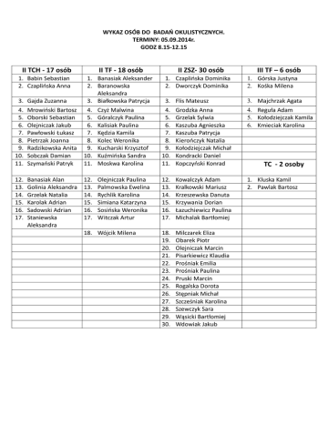 WYKAZ OSÓB DO BADAŃ OKULISTYCZNYCH. TERMINY: 05.09.2014r. GODZ 8.15-12.15 II TCH - 17 osób 1. Babin Sebastian 2. Czaplińska Anna 3. 4. 5. 6. 7. 8. 9. 10. 11. Gajda Zuzanna Mrowiński Bartosz Oborski Sebastian Olejniczak Jakub Pawłowski Łukasz Pietrzak Joanna Radzikowska Anita Sobczak Damian Szymański Patryk 12. 13. 14. 15. 16. 17. Banasiak Alan Golinia Aleksandra Grzelak Natalia Karolak Adrian Sadowski Adrian Staniewska Aleksandra II TF - 18 osób II ZSZ- 30 osób 1. Banasiak Aleksander 2. Baranowska Aleksandra 3. Białkowska Patrycja 4. Czyż Malwina 5. Góralczyk Paulina 6. Kalisiak Paulina 7. Kędzia Kamila 8. Kolec Weronika 9. Kucharski Krzysztof 10. Kuźmińska Sandra 11. Moskwa Karolina 3. 4. 5. 6. 7. 8. 9. 10. 11. Flis Mateusz Grodzka Anna Grzelak Sylwia Kaszuba Agnieszka Kaszuba Patrycja Kierończyk Natalia Kołodziejczak Michał Kondracki Daniel Kopczyński Konrad 3. 4. 5. 6. 12. 13. 14. 15. 16. 17. 12. 13. 14. 15. 16. 17. Kowalczyk Adam Kralkowski Mariusz Krzeszewska Danuta Krzywania Dorian Łazuchiewicz Paulina Michalak Bartłomiej 1. Kluska Kamil 2. Pawlak Bartosz 18. 19. 20. 21. 22. 23. 24. 25. 26. 27. 28. 29. 30. Milczarek Eliza Obarek Piotr Olejniczak Marcin Pisarkiewicz Klaudia Prośniak Emilia Prośniak Paulina Pruski Marcin Rogalska Dorota Stępniak Michał Szcześniak Karolina Szewczyk Sara Wąsicki Bartłomiej Wdowiak Jakub Olejniczak Paulina Palmowska Ewelina Rychlik Karolina Simiana Katarzyna Sosińska Weronika Witczak Artur 18. Wójcik Milena 1. Czaplińska Dominika 2. Dworczyk Dominika III TF – 6 osób 1. Górska Justyna 2. Kośka Milena Majchrzak Agata Reguła Adam Kołodziejczak Kamila Kmieciak Karolina TC - 2 osoby III ZSZ -20 12 września 2014 Banasiak Magdalena Beczkowska Justyna Błaszczyk Mateusz Derlecki Seweryn Gabryelczyk Sebastian Grzelak Paulina Janicka Patrycja Kociszewski Kamil Kołodziejczak Michal Kubiak Sebastian Misiak Katarzyna Olczak Julita Pietrzak Paulina Pilaszewska Sylwia Rzepecka Paulina Rzęsiewicz Seweliusz Stróżek Dominik Wiśniewska Sylwia Witczak Damian Woźniak Bartłomiej II TUG/TOT 15 + 3 Bołdowski Mateusz Chojna Patrycja Dobrowolska Daria Golan Daria Grzejszczak Patrycja Michalak Patrycja Milczarek Patrycja Nowicka Joanna Podwysocki Adrian Rakowski Dawid Stawińska Angelika Świątkiewicz Agnieszka Uniszewski Julian Zieliński Mateusz Szymańska Joanna CYBULSKI FILIP PIETRZAK KLAUDIA WESOLOWSKI DOMINIK III TOT - 22 Cholewińska Wioletta Cyms Kacper Czaprak Natalia Dośpiał Patryk Graczyk Karolina Ignaczak Wiktor Kacprzak Agnieszka Karolczak Anna Karpiński Rafał Koziński Patryk Krawczyk Agata Krawczyk Paulina Leszczak Damian Marciniak Marika Mirowska Karina Ptaszyńska Joanna Sas Izabela Sikorska Izabela Skoczylas Rafał Sobczak Klaudia Zajdel Paulina Żak Damian III TUG – 24 Antczak Krystian Bielajew Tomasz Brzezińska Aneta Czaplińska Iza Dawid Patrycja Dymkowska Karolina Gerstenberger Angelika Górecka Ewelina Jęckowski Dawid Kaczmarek Michał Kurzawa Gabriela Mrozowicz Marcin Olejniczak Justyna Ostrowski Adam Pawłowska Daria Przybylska Emilia Siech Ewelina Sieradzka Karolina Sieradzka Sylwia Skonieczka Ewelina Suchiński Rafał Szuba Martyna Urbaniak Katarzyna Zasada Angelika