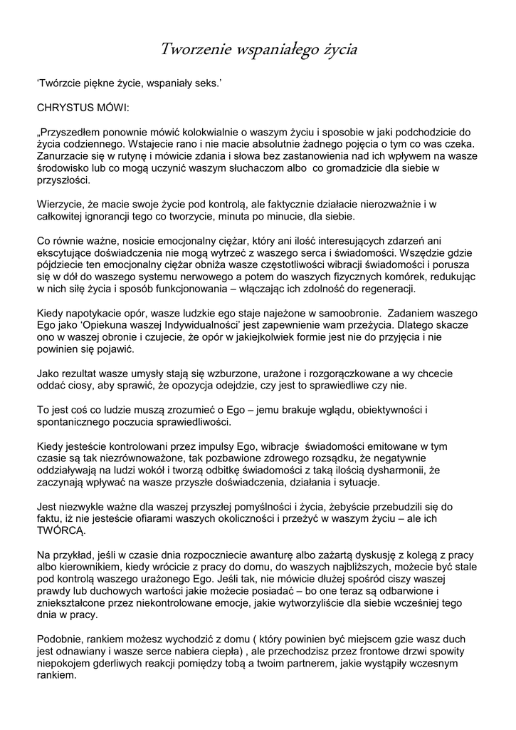 Tworzenie wspaniałego życia ‘Twórzcie piękne życie, wspaniały seks.’ CHRYSTUS MÓWI: „Przyszedłem ponownie mówić kolokwialnie o waszym życiu i sposobie w jaki podchodzicie do życia codziennego. Wstajecie rano i nie macie absolutnie żadnego pojęcia o tym co was czeka. Zanurzacie się w rutynę i mówicie zdania i słowa bez zastanowienia nad ich wpływem na wasze środowisko lub co mogą uczynić waszym słuchaczom albo co gromadzicie dla siebie w przyszłości. Wierzycie, że macie swoje życie pod kontrolą, ale faktycznie działacie nierozważnie i w całkowitej ignorancji tego co tworzycie, minuta po minucie, dla siebie. Co równie ważne, nosicie emocjonalny ciężar, który ani ilość interesujących zdarzeń ani ekscytujące doświadczenia nie mogą wytrzeć z waszego serca i świadomości. Wszędzie gdzie pójdziecie ten emocjonalny ciężar obniża wasze częstotliwości wibracji świadomości i porusza się w dół do waszego systemu nerwowego a potem do waszych fizycznych komórek, redukując w nich siłę życia i sposób funkcjonowania – włączając ich zdolność do regeneracji. Kiedy napotykacie opór, wasze ludzkie ego staje najeżone w samoobronie. Zadaniem waszego Ego jako ‘Opiekuna waszej Indywidualności’ jest zapewnienie wam przeżycia. Dlatego skacze ono w waszej obronie i czujecie, że opór w jakiejkolwiek formie jest nie do przyjęcia i nie powinien się pojawić. Jako rezultat wasze umysły stają się wzburzone, urażone i rozgorączkowane a wy chcecie oddać ciosy, aby sprawić, że opozycja odejdzie, czy jest to sprawiedliwe czy nie. To jest coś co ludzie muszą zrozumieć o Ego – jemu brakuje wglądu, obiektywności i spontanicznego poczucia sprawiedliwości. Kiedy jesteście kontrolowani przez impulsy Ego, wibracje świadomości emitowane w tym czasie są tak niezrównoważone, tak pozbawione zdrowego rozsądku, że negatywnie oddziaływają na ludzi wokół i tworzą odbitkę świadomości z taką ilością dysharmonii, że zaczynają wpływać na wasze przyszłe doświadczenia, działania i sytuacje. Jest niezwykle ważne dla waszej przyszłej pomyślności i życia, żebyście przebudzili się do faktu, iż nie jesteście ofiarami waszych okoliczności i przeżyć w waszym życiu – ale ich TWÓRCĄ. Na przykład, jeśli w czasie dnia rozpoczniecie awanturę albo zażartą dyskusję z kolegą z pracy albo kierownikiem, kiedy wrócicie z pracy do domu, do waszych najbliższych, możecie być stale pod kontrolą waszego urażonego Ego. Jeśli tak, nie mówicie dłużej spośród ciszy waszej prawdy lub duchowych wartości jakie możecie posiadać – bo one teraz są odbarwione i zniekształcone przez niekontrolowane emocje, jakie wytworzyliście dla siebie wcześniej tego dnia w pracy. Podobnie, rankiem możesz wychodzić z domu ( który powinien być miejscem gzie wasz duch jest odnawiany i wasze serce nabiera ciepła) , ale przechodzisz przez frontowe drzwi spowity niepokojem gderliwych reakcji pomiędzy tobą a twoim partnerem, jakie wystąpiły wczesnym rankiem. Być może mieliście kłótnię ze swoim partnerem z powodu tej czy innej pretensji i próbowaliście uzdrowić to poprzez seks tylko po to, aby zauważyć, że gdy podczas seksu wydawało się, że znowu zbliżyliście się emocjonalnie, to w rzeczywistości nie satysfakcjonuje i nie uzdrowiło to starej urazy. Musicie zrozumieć, że kiedy uprawiacie seks bez zabezpieczeń, wymieniacie nie tylko płyny waszych ciał, ale również świadomość. Świadomość wielu ludzi jest stale tak bierna i nawet wroga wobec rodzaju ludzkiego i życia w ogóle, że nie tylko redukuje fizyczne zdrowie jednostki, ale negatywnie wpływa na dobre samopoczucie fizyczne i emocjonalne partnera. Kiedy po raniącej kłótni uprawiacie seks, aby zatuszować spór, wtedy jesteście zainfekowani świadomością złych odczuć waszego partnera. Całkowicie bezwiednie przyjmujecie je do siebie jak własne. Wyjaśniam wam dokładnie jak wasz ziemski świat (który nazywacie solidnym), ale jest w rzeczywistości energią ŚWIADOMOŚCI – jest ukształtowany z form świadomości złych humorów– albo tych z miłości i dobrego humoru – wpływając na wasze zdrowie i czynienie w życiu dobra albo zła. Jakąkolwiek formę świadomości nie wytworzycie, zostawiacie waszą energię odciśniętą na wszystkim co spotykacieA włączając wasz samochód, komputer i cokolwiek używacie w czasie dnia. „Jak to możliwe?” - prawdopodobnie pytacie. Ponieważ cały wszechświat ze wszystkimi swoimi galaktykami jest tylko ŚWIADOMOŚCIĄ – MIŁOŚCIĄ/INTELIGENCJĄ w swojej najwyższej formie, pracującą poprzez wewnętrzne akcje elektromagnetyzmu. ELEKTROMAGNETYZM jest w rzeczywistości ‘surowcem’ dla siły ludzkiego umysłu i emocjonalnych impulsów – jak to widać w obszarze ziemskiego życia. Czytajcie Listy 5 & 6 dopóki nie zrozumiecie w pełni, że nic nie jest solidne. Wszystko co widzicie, czujecie, czego dotykacie jest w rzeczywistości IMPULSAMI ŚWIADOMOŚCI uczynionymi widzialnymi poprzez wzajemne oddziaływanie elektromagnetyzmu. Kiedy w pełni to zrozumiecie i ujrzycie prawdziwą pozycję, jaką zajmujecie w tworzeniu dobrego albo złego stanu zdrowia, szczęścia albo nieszczęścia DLA SIEBIE I INNYCH LUDZI – możecie wtedy przekonać się, że jedyna sensowna droga na przód to A PÓJŚĆ DROGĄ CHRYSTUSA AA DROGĄ BEZWARUNKOWEJ MIŁOŚCI. Jak możecie zacząć zmieniać wasze normalne wzorce myślowe i opanować nieposłuszne emocje? Możecie zrobić to, wyrażając siłę woli. Kiedy jednak polegacie na sile woli, opieracie się na tej samej świadomości ego, która powoduje utratę poczucia równowagi emocjonalnej. To jest jak wycieranie melasą nieporządku pozostałego po melasie. Albo możecie nauczyć się kontrolować wasze Ego, starając się poznać i nawiązać kontakt ze ŹRÓDŁEM waszego ISTNIENIA, które nazywałem ‘Ojcem’. Czytajcie Listy 7 i 8.