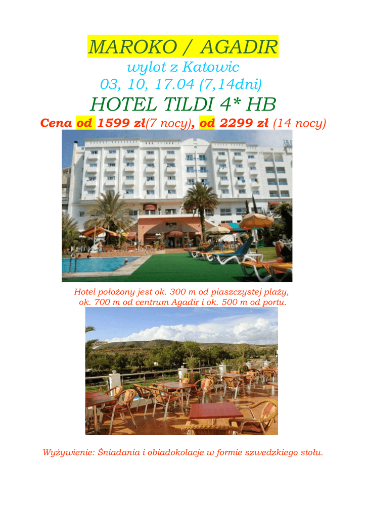 MAROKO / AGADIR wylot z Katowic 03, 10, 17.04 (7,14dni) HOTEL TILDI 4* HB Cena od 1599 zł(7 nocy), od 2299 zł (14 nocy) Hotel położony jest ok. 300 m od piaszczystej plaży, ok. 700 m od centrum Agadir i ok. 500 m od portu. Wyżywienie: Śniadania i obiadokolacje w formie szwedzkiego stołu. Sport, relaks, rozrywka Bezpłatnie: basen, leżaki i parasole, aerobic, siłownia tenis stołowy, minigolf, szachy, bule, animacje Odpłatnie: fitness center, spa, jacuzzi, sauna, hamman, masaże - sporty wodne na plaży Cena zawiera (PLN): bilet lotniczy, zakwaterowanie w hotelu (doba hotelowa zaczyna się w dniu przyjazdu od godz. 14:00, kończy o godz. 12:00), transfer lotnisko - hotel lotnisko; opiekę polskojęzycznego rezydenta; wyżywienie wg opisu, podatek VAT, obowiązkowe ubezpieczenie (KL I NW, BAGAżU, ubezpieczenia od chorób przewlekłych Europaische Reiseversicherung AG Europejskie), opłaty lotniskowe i paliwowe.