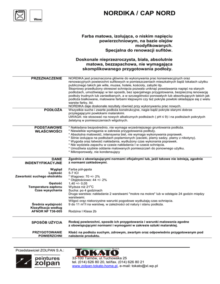NORDIKA / CAP NORD Wew Farba matowa, izolująca, o niskim napięciu powierzchniowym, na bazie olejów modyfikowanych. Specjalna do renowacji sufitów. Doskonale nieprzezroczysta, biała, absolutnie matowa, bezzapachowa, nie wymagająca skomplikowanego przygotowania podłoŜy. PRZEZNACZENIE PODŁOśA PODSTAWOWE WŁAŚCIWOŚCI DANE INDENTYFIKACYJNE Wygląd Lepkość Zawartość suchego ekstraktu Gęstość Temperatura zapłonu Czas wysychania Średnia wydajność Klasyfikacja według AFNOR NF T36-005 NORDIKA jest przeznaczona głównie do wykonywania prac konserwacyjnych oraz renowacyjnych powierzchni sufitowych w pomieszczeniach mieszkalnych bądź lokalach uŜytku publicznego takich jak wille, muzea, hotele, kościoły, zabytki itp. Stopniowy przedłuŜony okresowi schnięcia pozwala uniknąć powstawania napięć na starych podłoŜach, umoŜliwiając w ten sposób, bez specjalnego przygotowania, bezpieczną renowację podłoŜy trudnych lub zaniedbanych, a w szczególności porowatych lub absorbujących takich jak podłoŜa białkowane, malowane farbami klejowymi czy teŜ pokryte powłoki składające się z wielu warstw farby, itd. NORDIKA daje doskonałe rezultaty równieŜ przy wykonywaniu prac nowych. Wszystkie suche i zwarte podłoŜa konstrukcyjne, nagie bądź pokryte starymi dobrze przylegającymi powłokami malarskimi. UWAGA: nie stosować na nowych alkalicznych podłoŜach ( pH ≤ 9) i na podłoŜach pokrytych Ŝelatyną w pomieszczeniach wilgotnych. * Nakładana bezpośrednio, nie wymaga wcześniejszego gruntowania podłoŜa. * Niewielkie wymagania w zakresie przygotowania podłoŜy. * Absolutna matowość, intensywna biel, nie wymaga wykonywania poprawek. * Silnie izolująca na podłoŜach poplamionych (zacieki, plamy sadzy, plamy z nikotyny). * Wygoda oraz łatwość nakładania, wydłuŜony czas wykonania poprawek. * Nie wydziela zapachu w czasie nakładania I w czasie schnięcia. * UmoŜliwia szybkie oddanie malowanych pomieszczeń do ponownego uŜytku. * Mikroporowaty, nie kondensujący Zgodnie z obowiązującymi normami oficjalnymi lub, jeśli takowe nie istnieją, zgodnie z normami zakładowymi. Farba pół-gęsta 5-7 ICI * Wagowo: 70 +/- 2% * Objętościowo: 44 +/- 2% 1,40 +/- 0,05 o WyŜsza niŜ 21 C Sucha: po 4 godzinach Druga warstwa: nakładanie 2 warstwami "mokre na mokre" lub w odstępie 24 godzin między warstwami. Wilgoć oraz niekorzystne warunki pogodowe wydłuŜają czas schnięcia. 2 9 do 11 m /l na warstwę, w zaleŜności od natury i stanu podłoŜa. Rodzina I Klasa 2b SPOSÓB UśYCIA Rodzaj powierzchni, sposób ich przygotowania i warunki malowania zgodne z obowiązującymi normami i wymogami w zakresie sztuki malarskiej. PRZYGOTOWANIE POWIERZCHNI Kłaść na podłoŜu suchym, zdrowym, zwartym oraz odpowiednio przygotowanym pod nałoŜenie produktu. Przedstawiciel ZOLPAN S.A.: 33-100 Tarnów, ul.Tuchowska 25 tel. (014) 626 80 20, tel/fax. (014) 626 80 21 www.zolpan-tokato.home.pl, e-mail: [email protected] * PodłoŜa surowe: odpylenie, zatarcie. * Stare powłoki malarskie: usunięcie fragmentów łuszczących się lub źle przylegających za pomocą szczotkowania, skrobania, odpylania. Jeśli to konieczne, wypełnienie ubytków / szpachlowanie. * PodłoŜa tłuste (na przykład w kuchniach): ługowanie. * PodłoŜa zaatakowane pleśnią: przemycie FONGIMOUSSE PLUS. * Metale: gruntowanie ZOLMETAL w przypadku podłoŜy dotkniętych korozją. NAKŁADANIE PRODUKTU Sposób postępowania Narzędzia 1 do 2 warstw w zaleŜności od stanu podłoŜa. Nakładać regularnymi ruchami krzyŜowymi, prowadząc pędzel zawsze w tym samym kierunku, aby otrzymać równe warstwy. JeŜeli okaŜe się konieczne połoŜenie drugiej warstwy (podłoŜa silnie poplamione, porowate lub silnie kontrastowe) najlepsze rezultaty otrzymujemy nakładając metodą "mokre na mokre" (drugą warstwę nakładamy, gdy tylko pierwsza zacznie matowieć, to znaczy po upływie 1 do 2 godzin w zaleŜności od porowatości podłoŜa). W przeciwnym razie naleŜy zaczekać do następnego dnia. Pędzel, wałek z rynienką, pistolet pneumatyczny lub bezpowietrzny. Rozcieńczanie Produkt gotowy do uŜycia Do 5% rozpuszczalnikiem bezzapachowym DILUZOIL w przypadku nakładania ręcznego (brak pojawienia się zapachu nie jest gwarantowany przy rozcieńczaniu produktem WHITE SPIRIT) Mycie narzędzi WHITE SPIRIT, natychmiast po uŜyciu. ZALECENIA KOLORY OPAKOWANIE PRZECHOWYWANIE BEZPIECZEŃSTWO I HIGIENA PRACY * Na obrzeŜach malowanych powierzchni, w miejscach przekroczenia granicy malowanego obszaru istnieje moŜliwość przyklejania lekkich tapet ściennych, gdy farba wyschnie, to jest po upływie minimum 24 godzin (przed przyklejeniem tapety wykonać próbę). Naklejanie innych powłok ściennych lub cięŜkich tapet wymaga całkowitego wcześniejszego wyschnięcia produktu lub unikania wyjścia farbą na sąsiednie powierzchnie. * MoŜliwość dodatkowej ochrony przed mikroorganizmami poprzez dodanie specjalnego rozpuszczalnikowego grzybobójczego środka pomocniczego ADDITIF FONGICIDE Spécial Phase Solvant, w pomieszczeniach wilgotnych o podwyŜszonej temperaturze (piekarnie, kawiarnie,…) Biały, moŜe być barwiony po dodaniu uniwersalnych kolorantów nie przekraczając 3% 4 L, 16 L. 24 miesiące w opakowaniu zamkniętym Przechowywać w chłodnym oraz przewiewnym pomieszczeniu. Produkt palny. UŜywać wyłącznie w pomieszczeniach o dobrej wentylacji. Nie wyrzucać resztek do kanalizacji. Zapoznać się z Instrukcją Bezpiecznego UŜytkowania. Karta Techniczna nr 2328 Data wydania: wrzesień 1998 Data zmian: wrzesień 2003 Producent: ZOLPAN S.A. Francja Uwaga: UniewaŜnia i zastępuje wcześniejsze wydania. Do naszych klientów naleŜy sprawdzenie, przed uŜyciem, czy chodzi o ostatnie wydanie ulotki. Informacje zawarte w tej ulotce mają tylko charakter orientacyjny i nie mogą zastąpić instrukcji postępowania dostosowanego do natury oraz do stanu konkretnego podłoŜa. Przedstawiciel ZOLPA