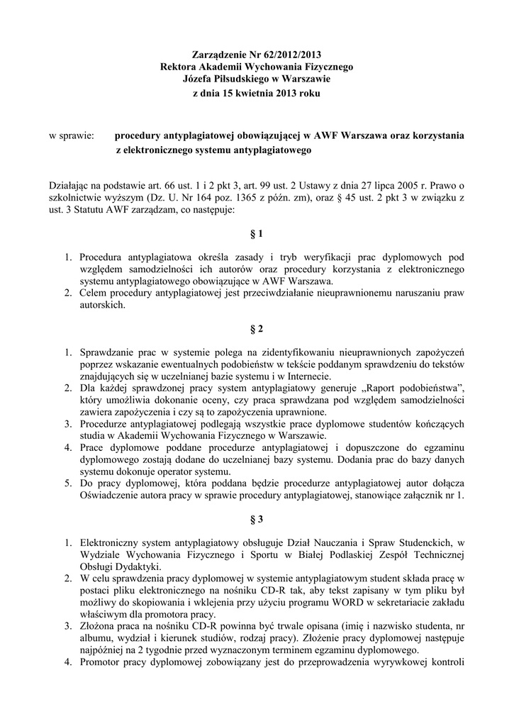 Zarządzenie Nr 62/2012/2013 Rektora Akademii Wychowania Fizycznego Józefa Piłsudskiego w Warszawie z dnia 15 kwietnia 2013 roku w sprawie: procedury antyplagiatowej obowiązującej w AWF Warszawa oraz korzystania z elektronicznego systemu antyplagiatowego Działając na podstawie art. 66 ust. 1 i 2 pkt 3, art. 99 ust. 2 Ustawy z dnia 27 lipca 2005 r. Prawo o szkolnictwie wyższym (Dz. U. Nr 164 poz. 1365 z późn. zm), oraz § 45 ust. 2 pkt 3 w związku z ust. 3 Statutu AWF zarządzam, co następuje: §1 1. Procedura antyplagiatowa określa zasady i tryb weryfikacji prac dyplomowych pod względem samodzielności ich autorów oraz procedury korzystania z elektronicznego systemu antyplagiatowego obowiązujące w AWF Warszawa. 2. Celem procedury antyplagiatowej jest przeciwdziałanie nieuprawnionemu naruszaniu praw autorskich. §2 1. Sprawdzanie prac w systemie polega na zidentyfikowaniu nieuprawnionych zapożyczeń poprzez wskazanie ewentualnych podobieństw w tekście poddanym sprawdzeniu do tekstów znajdujących się w uczelnianej bazie systemu i w Internecie. 2. Dla każdej sprawdzonej pracy system antyplagiatowy generuje „Raport podobieństwa”, który umożliwia dokonanie oceny, czy praca sprawdzana pod względem samodzielności zawiera zapożyczenia i czy są to zapożyczenia uprawnione. 3. Procedurze antyplagiatowej podlegają wszystkie prace dyplomowe studentów kończących studia w Akademii Wychowania Fizycznego w Warszawie. 4. Prace dyplomowe poddane procedurze antyplagiatowej i dopuszczone do egzaminu dyplomowego zostają dodane do uczelnianej bazy systemu. Dodania prac do bazy danych systemu dokonuje operator systemu. 5. Do pracy dyplomowej, która poddana będzie procedurze antyplagiatowej autor dołącza Oświadczenie autora pracy w sprawie procedury antyplagiatowej, stanowiące załącznik nr 1. §3 1. Elektroniczny system antyplagiatowy obsługuje Dział Nauczania i Spraw Studenckich, w Wydziale Wychowania Fizycznego i Sportu w Białej Podlaskiej Zespół Technicznej Obsługi Dydaktyki. 2. W celu sprawdzenia pracy dyplomowej w systemie antyplagiatowym student składa pracę w postaci pliku elektronicznego na nośniku CD-R tak, aby tekst zapisany w tym pliku był możliwy do skopiowania i wklejenia przy użyciu programu WORD w sekretariacie zakładu właściwym dla promotora pracy. 3. Złożona praca na nośniku CD-R powinna być trwale opisana (imię i nazwisko studenta, nr albumu, wydział i kierunek studiów, rodzaj pracy). Złożenie pracy dyplomowej następuje najpóźniej na 2 tygodnie przed wyznaczonym terminem egzaminu dyplomowego. 4. Promotor pracy dyplomowej zobowiązany jest do przeprowadzenia wyrywkowej kontroli zgodności wersji drukowanej z wersją elektroniczną pracy dyplomowej. 5. Promotor lub upoważniony przez niego pracownik składa w Sekretariacie Prorektorów pracę dyplomową, która została zakwalifikowana do sprawdzenia w systemie antyplagiatowym. 6. Sekretariat Prorektora rejestruje złożenie pracy dyplomowej (data złożenia, podpis składającego) i przekazuje pracę do Działu Nauczania i Spraw Studenckich. 7. W przypadku Wydziału Wychowania Fizycznego i Sportu w Białej Podlaskiej, student składa pracę dyplomową w sekretariacie właściwej katedry. Sekretariat właściwej katedry rejestruje złożenie pracy dyplomowej (data złożenia, podpis składającego) i przekazuje pracę do Zespołu Technicznej Obsługi Dydaktyki. §4 1. Administrator systemu dokonuje wstępnej analizy „Raportu podobieństwa” i przekazuje „Protokół oceny samodzielności pracy” do promotora. 2. Jeżeli w wyniku wstępnej analizy „Raportu podobieństwa” praca zostanie uznana za wymagającą dodatkowej oceny promotora z punktu widzenia występowania niedopuszczalnych zapożyczeń, administrator systemu do „Protokołu oceny samodzielności pracy” dołącza pełną wersję „Raportu podobieństwa” zawierającą wygenerowany przez system tekst pracy dyplomowej. 3. Prace dyplomowe podlegają ocenie, o której mowa w ust. 2, w których współczynnik podobieństwa 1 lub 2 przekroczył odpowiednio 50% lub/i 5% i jednocześnie na podstawie wstępnej analizy stwierdzono, że praca zawiera obszerne fragmenty nieuprawnionych zapożyczeń (co najmniej 50 słów) lub, że w pracy znajdują się intencjonalne zniekształcenia tekstu, wskazujące na próbę ukrycia nieuprawnionych zapożyczeń. 4. Promotor podejmuje decyzję w sprawie zapożyczeń, według wzoru stanowiącego załącznik nr 2 do zarządzenia. „Opinia promotora pracy dyplomowej” wymaga zatwierdzenia kierownika katedry, zaś w przypadku, kiedy promotorem jest kierownik katedry, dokument zatwierdza dziekan wydziału. 5. Prace dyplomowe podlegają ocenie komisji egzaminacyjnej powołanej w wydziale przez dziekana, w których współczynnik podobieństwa 2 przekroczył 20% i jednocześnie na podstawie wstępnej analizy stwierdzono, że: 1) praca zawiera obszerne fragmenty nieuprawnionych zapożyczeń (co najmniej 50 słów), 2) występuje duża ilość potencjalnych zapożyczeń z jednego źródła, 3) cechy redakcyjne pracy wskazują na „mechaniczne” zapożyczenia, 4) w pracy znajdują się intencjonalne zniekształcenia tekstu, wskazujące na próbę ukrycia nieuprawnionych zapożyczeń. 6. Komisja, o której mowa w ust. 5, podejmuje decyzję w sprawie zapożyczeń, według wzoru stanowiącego załącznik nr 3 do zarządzenia. 7. Promotor oraz członkowie komisji, o której mowa w ust. 5, mogą zwrócić się do administratora systemu o interpretację „Raportu podobieństwa”. 8. „Protokół oceny samodzielności pracy” oraz odpowiednio „Opinia promotora pracy dyplomowej” lub „Opinia komisji egzaminacyjnej” dołączone zostają do dokumentacji studenta. §5 1. W przypadku pracy, w której stwierdzono istotne nieuprawnione zapożyczenia, praca nie zostaje dopuszczona do egzaminu dyplomowego, a promotor lub przewodniczący komisji, o której mowa w § 4 ust. 5 niniejsze