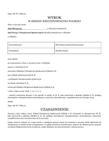 Sygn. akt IX U 883/15 WYROK W IMIENIU RZECZYPOSPOLITEJ POLSKIEJ Dnia 11 stycznia 2016r. Sąd Okręgowy___________________ w Gliwicach Wydział IX Sąd Pracy i Ubezpieczeń Społecznych Ośrodek Zamiejscowy w Rybniku w składzie: Przewodniczący: SSO Barbara Kużdrzał-Kiermaszek Protokolant: Monika Holona przy udziale po rozpoznaniu w dniu 11 stycznia 2016r. w Rybniku sprawy z odwołania D. R. przeciwko Zakładowi Ubezpieczeń Społecznych Oddział w R. przy udziale zainteresowanej M. R. o podleganie ubezpieczeniom społecznym na skutek odwołania D. R. od decyzji Zakładu Ubezpieczeń Społecznych Oddział w R. z dnia 21 lipca 2015r. Znak (...)/ (...)- (...) - zmienia zaskarżoną decyzję w ten sposób, iż ustala, że M. R. jako pracownik u płatnika składek D. R. podlega obowiązkowo ubezpieczeniom emerytalnemu, rentowym, chorobowemu, wypadkowemu od 16 lutego 2015r. Sędzia Sygn. akt IX U 883/15 UZASADNIENIE Decyzją z dnia 21lipca 2015r. Zakład Ubezpieczeń Społecznych Oddział w R. stwierdził, że ubezpieczona M. R., jako pracownik u płatnika składek D. R. nie podlega obowiązkowo ubezpieczeniom: emerytalnemu, rentowym, wypadkowemu oraz chorobowemu od 16.02.2015r. Organ rentowy wskazał, że w jego ocenie w niniejszej sprawie mamy do czynienia z sytuacją, kiedy zgłoszenie do ubezpieczeń na krótko przed wystąpieniem o wypłatę świadczeń chorobowych, zmierza do obejścia prawa poprzez uzyskanie długoterminowych świadczeń, a takie działanie nie może korzystać z ochrony prawa. Odwołanie od powyższej decyzji wniosła D. R., domagając się jej zmiany. Wskazała, że M. R., będąca jej synową została zatrudniona w celu odciążenia pracodawcy z tytułu dużego zainteresowania imprezami okolicznościowymi. W odpowiedzi na odwołanie organ rentowy wniósł o jego oddalenie, podtrzymując stanowisko wyrażone w zaskarżonej decyzji. Rozpoznając sprawę Sąd ustalił, co następuje. Ubezpieczona D. R. z zawodu jest ceramikiem. Od około dwudziestu pięciu lat prowadzi działalność gospodarczą. Początkowo polegała ona na handlu artykułami detalicznymi na targowiskach, jednakże kiedy po pewnym czasie stała się nierentowna, zmieniła profil tej działalności. Na działce położonej obok swojego domu, ubezpieczona wybudowała dom przyjęć (...), gdzie świadczy usługi polegające na organizacji przyjęć okolicznościowych takich jak: wesela, komunie, stypy, przyjęcia urodzinowego, pożegnania emerytów i inne. Ubezpieczona sama zajmuje się organizacją tych przyjęć, korzystając z pomocy domowników, a w pewnych okresach w zależności od potrzeb zatrudniając pracowników w niepełnym wymiarze czasu pracy lub osoby na podstawie umów cywilnoprawnych. Zainteresowana M. R. pomagała zainteresowanej w obsługiwaniu organizowanych przez nią imprez okolicznościowych jeszcze przed rokiem 2012. Była wówczas narzeczoną syna ubezpieczonej. Razem z nim pomagała nieodpłatnie przyszłej teściowej przy pracach związanych z nakrywaniem do stołów, roznoszeniem posiłków, zmywaniem naczyń, sprzątaniem sali itp. Zamieszkiwała wówczas w domu rodzinnym w tej samej miejscowości. Po ślubie wraz z mężem wyprowadziła się do G., jednak nadal pomagała przy obsłudze organizowanych imprez. Jeżeli przyjęcie wiązało się z dużym nakładem pracy, zdarzało się, że nie wracała na noc do domu, lecz nocowała u rodziców. Kiedy ubezpieczona zaszła w ciążę nie było żadnych przeciwwskazać medycznych do kontynuowania dotychczasowego zajęcia. Nie miała żadnych dolegliwości. Wówczas strony postanowiły sformalizować zatrudnienie, aby zainteresowana z racji wykonywanej pracy mogła również skorzystać ze świadczeń macierzyńskich. Ubezpieczona uzyskała zdolność do pracy, odbyła szkolenie BHP. Pracowała przy organizowaniu zamówionych przyjęć okolicznościowych głównie wykonując obowiązki kelnerki, ale również przy przygotowaniu sali, prasowaniu obrusów czy pomaganiu w kuchni. Podczas jednej z wizyt kontrolnych, prowadzący ciążę lekarz poinformował ubezpieczoną, iż doszło do skrócenia szyjki macicy, co jest stanem zagrażającym ciąży. Od dnia 23.04.2015r. zainteresowana przebywała na zwolnieniu lekarskim. W związku z powyższym ubezpieczona D. R. postanowiła na czas nieobecności w pracy swojej synowej zatrudnić do pomocy inną osobę, jednakże nie znalazła właściwej osoby, aż do dnia 22.07.2015r. Po zakończeniu urlopu macierzyńskiego zainteresowana ma zamiar kontynuować dotychczasowe zatrudnienie. Powyższe ustalił Sąd na podstawie akt organu rentowego, dokumentacji medycznej z przebiegu ciąży ubezpieczonej, zeznań świadków M. G., G. J. i T. R., a także zeznań ubezpieczonej oraz zainteresowanej ( nagranie z rozprawy w dniu11.01.2016r. minuty od 00:06:32 do 00:43:45). Sąd dał w całości wiarę zeznaniom słuchanych w sprawie świadków, ubezpieczonej i zainteresowanej, ponieważ są one przekonywujące, logiczne, wzajemnie się pokrywają i uzupełniają przedstawiając łącznie rzeczywisty przebieg pracy i zakres obowiązków ubezpieczonej, a także przyczyny zatrudnienia ubezpieczonej, ponadto znajdują potwierdzenie w powołanej w sprawie dokumentacji. Mając na uwadze powyższe ustalenia Sąd zważył, co następuje. Odwołanie ubezpieczonej zasługuje na uwzględnienie. Zgodnie z treścią art. 6 ust. 1 pkt. 1 i art. 11 ust. 1 oraz art. 12 ust. 1 ustawy z dnia 13 października 1998 r. o systemie ubezpieczeń społecznych (j.t. Dz. U. z 2013r., poz. 1442), zwanej dalej Ustawą, pracownicy podlegają obowiązkowo ubezpieczeniom emerytalnemu, rentowym, chorobowemu i wypadkowemu. Obowiązkowym ubezpieczeniom pracownicy podlegają od dnia nawiązania stosunku pracy do dnia jego ustania (art. 13). Jak stanowi art. 22 kp przez nawiązanie stosunku pracy pracownik zobowiązuje się do wykonywania pracy określonego rodzaju na rzecz pracodawcy i pod jego kierownictwem oraz w miejscu i czasie wyzn