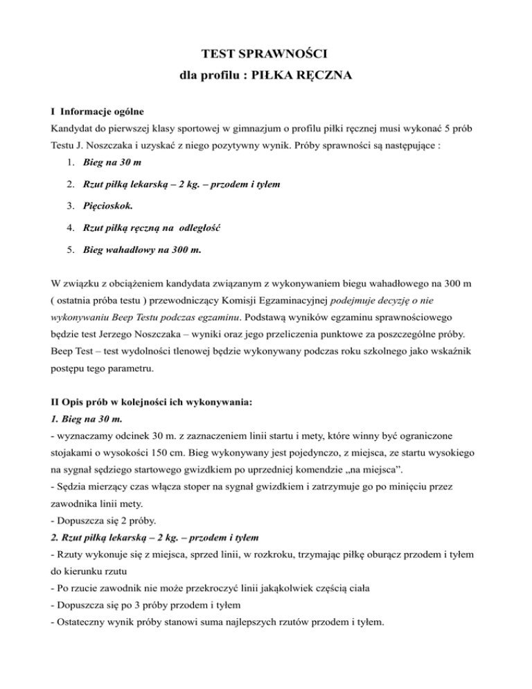 TEST SPRAWNOŚCI dla profilu : PIŁKA RĘCZNA I Informacje ogólne Kandydat do pierwszej klasy sportowej w gimnazjum o profilu piłki ręcznej musi wykonać 5 prób Testu J. Noszczaka i uzyskać z niego pozytywny wynik. Próby sprawności są następujące : 1. Bieg na 30 m 2. Rzut piłką lekarską – 2 kg. – przodem i tyłem 3. Pięcioskok. 4. Rzut piłką ręczną na odległość 5. Bieg wahadłowy na 300 m. W związku z obciążeniem kandydata związanym z wykonywaniem biegu wahadłowego na 300 m ( ostatnia próba testu ) przewodniczący Komisji Egzaminacyjnej podejmuje decyzję o nie wykonywaniu Beep Testu podczas egzaminu. Podstawą wyników egzaminu sprawnościowego będzie test Jerzego Noszczaka – wyniki oraz jego przeliczenia punktowe za poszczególne próby. Beep Test – test wydolności tlenowej będzie wykonywany podczas roku szkolnego jako wskaźnik postępu tego parametru. II Opis prób w kolejności ich wykonywania: 1. Bieg na 30 m. - wyznaczamy odcinek 30 m. z zaznaczeniem linii startu i mety, które winny być ograniczone stojakami o wysokości 150 cm. Bieg wykonywany jest pojedynczo, z miejsca, ze startu wysokiego na sygnał sędziego startowego gwizdkiem po uprzedniej komendzie „na miejsca”. - Sędzia mierzący czas włącza stoper na sygnał gwizdkiem i zatrzymuje go po minięciu przez zawodnika linii mety. - Dopuszcza się 2 próby. 2. Rzut piłką lekarską – 2 kg. – przodem i tyłem - Rzuty wykonuje się z miejsca, sprzed linii, w rozkroku, trzymając piłkę oburącz przodem i tyłem do kierunku rzutu - Po rzucie zawodnik nie może przekroczyć linii jakąkolwiek częścią ciała - Dopuszcza się po 3 próby przodem i tyłem - Ostateczny wynik próby stanowi suma najlepszych rzutów przodem i tyłem. 3. Pięcioskok. - Pięcioskok wykonywany jest sprzed linii, z miejsca, z odbicia obunóż z lądowaniem na obie nogi. - Pomiędzy odbiciem obunóż a lądowaniem należy wykonać odbicia jednonóż w rytmie – LN-PNLN-PN lub PN-LN-PN – LN. - Odległość mierzymy jak w skoku w dal – od linii do najbliższego punkty zaznaczonego po lądowaniu. - Dopuszcza się 2 próby. 4.Rzut piłką ręczną na odległość - Rzuty wykonujemy z miejsca, jednorącz z podłoża. - Podczas rzutu jedna stopa winna cały czas dotykać podłoża. - Po rzucie nie można przekraczać linii. - Rzuty mierzymy po linii prostej prostopadłej do linii startowej – rzutu. - Dopuszcza się 3 próby. 5.Bieg wahadłowy na 300 m. - wyznaczamy odcinek 30 m. i ograniczamy go stojakami – chorągiewkami o wysokości 150 cm. - Z jednej strony odcinka 30 m. rysujemy 2 m. linię startu i mety. - Zawodnik startuje na sygnał gwizdkiem po uprzedniej komendzie na „miejsca” i pokonuje dziesięciokrotnie odcinki 30 m. obiegając za każdym razem stojaki – chorągiewki. - Dopuszcza się 1 próbę. III Tabele punktowe PKT 80 79 78 77 76 75 74 73 72 71 70 69 68 67 66 65 64 63 63 61 60 59 58 57 56 55 54 53 52 51 50 49 48 47 46 45 44 43 42 41 bieg na 30 m rzut p.lekarską 2kg 3.70 30.00 3.72 29.80 3.74 29.60 3.76 29.40 3.78 29.20 3.80 29.00 3.82 28.80 3.84 28.60 3.86 28.40 3.88 28.20 3.90 28.00 3.92 27.80 3.94 27.60 3.96 27.40 3.98 27.20 4.00 27.00 4.02 26.80 4.04 26.60 4.06 26.40 4.08 26.20 4.10 26.00 4.12 25.80 4.14 25.60 4.16 25.40 4.18 25.20 4.20 25.00 4.22 24.80 4.24 24.60 4.26 24.40 4.28 24.20 4.30 24.00 4.32 23.80 4.34 23.60 4.36 23.40 4.38 23.20 4.40 23.00 4.42 22.80 4.44 22.60 4.46 22.40 4.48 22.20 pięcioskok 13.50 13.45 13.40 13.35 13.30 13.25 13.20 13.15 13.10 13.05 13.00 12.95 12.90 12.85 12.80 12.75 12.70 12.65 12.60 12.55 12.50 12.45 12.40 12.35 12.30 12.25 12.20 12.15 12.10 12.05 12.00 11.95 11.90 11.85 11.80 11.75 11.70 11.65 11.60 11.55 rzut p. ręczną 43.00 42.80 42.60 42.40 42.20 42.00 41.80 41.60 41.40 41.20 41.00 40.80 40.60 40.40 40.20 40.00 39.80 39.60 39.40 39.20 39.00 38.80 38.60 38.40 38.20 38.00 37.80 37.60 37.40 37.20 37.00 36.80 36.60 36.40 36.20 36.00 35.80 35.60 35.40 35.20 bieg wahadłowy na 300 m 58.0 58.2 58.4 58.6 58.8 59.0 59.2 59.4 59.6 59.8 60.0 60.2 60.4 60.6 60.8 61.0 61.2 61.4 61.6 61.8 62.0 62.2 62.4 62.6 62.8 63.0 63.4 63.8 64.2 64.6 65.0 65.4 65.8 66.2 66.6 67.0 67.4 67.8 68.2 68.6 PKT 80 79 78 77 76 75 74 73 72 71 70 69 68 67 66 65 64 63 63 61 60 59 58 57 56 55 54 53 52 51 50 49 48 47 46 45 44 43 42 41 PKT 40 39 38 37 36 35 34 33 32 31 30 29 28 27 26 25 24 23 22 21 20 19 18 17 16 15 14 13 12 11 10 bieg na 30 m rzut p.lekarską 2kg 4.50 22.00 4.52 21.80 4.54 21.60 4.56 21.40 4.58 21.20 4.60 21.00 4.64 20.80 4.68 20.60 4.64 20.40 4.72 20.20 4.80 20.00 4.84 19.80 4.88 19.60 4.92 19.40 4.96 19.20 5.00 19.00 5.04 18.80 5.08 18.60 5.12 18.40 5.16 18.20 5.20 18.00 5.25 17.80 5.30 17.60 5.35 17.40 5.40 17.20 5.45 17.00 5.50 16.50 5.60 16.00 5.70 15.50 5.80 15.00 5.90 14.50 pięcioskok 11.50 11.40 11.30 11.20 11.10 11.00 10.90 10.80 10.70 10.60 10.50 10.40 10.30 10.20 10.10 10.00 9.90 9.80 9.70 9.60 9.50 9.40 9.30 9.20 9.00 8.80 8.60 8.40 8.20 8.00 7.80 rzut p. ręczną 35.00 34.80 34.60 34.40 34.20 34.00 33.80 33.60 33.40 33.20 33.00 32.50 32.00 31.50 31.00 30.50 30.00 29.50 29.00 28.50 28.00 27.50 27.00 26.50 26.00 25.50 25.00 24.50 24.00 23.00 22.00 bieg wahadłowy na 300 m 69.0 69.4 69.8 70.2 70.6 71.0 71.4 71.8 72.2 72.6 73.0 73.5 74.0 74.5 75.0 75.5 76.0 76.5 77.0 77.5 78.0 78.5 79.0 79.5 80.0 80.5 81.0 82.0 83.0 84.0 85.0 PKT 40 39 38 37 36 35 34 33 32 31 30 29 28 27 26 25 24 23 22 21 20 19 18 17 16 15 14 13 12 11 10