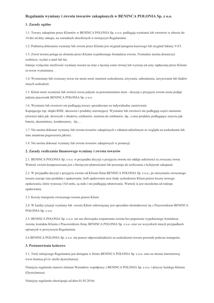 Regulamin zwrotu Beninca Polonia