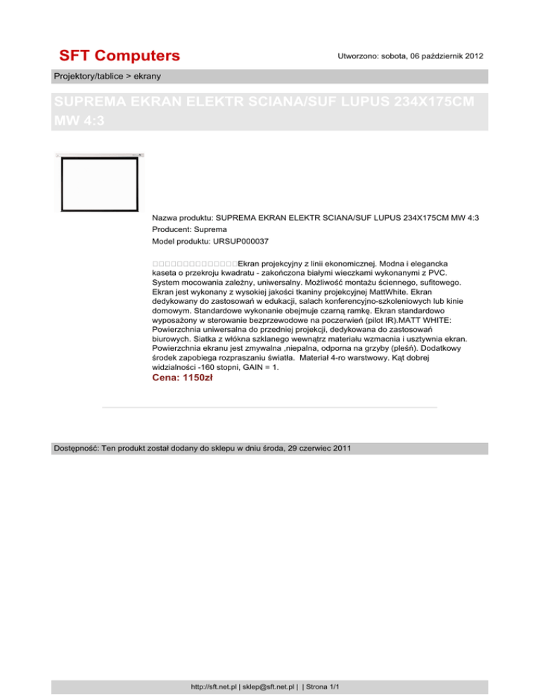 SFT Computers Utworzono: sobota, 06 październik 2012 Projektory/tablice > ekrany SUPREMA EKRAN ELEKTR SCIANA/SUF LUPUS 234X175CM MW 4:3 Nazwa produktu: SUPREMA EKRAN ELEKTR SCIANA/SUF LUPUS 234X175CM MW 4:3 Producent: Suprema Model produktu: URSUP000037 Ekran projekcyjny z linii ekonomicznej. Modna i elegancka kaseta o przekroju kwadratu - zakończona białymi wieczkami wykonanymi z PVC. System mocowania zależny, uniwersalny. Możliwość montażu ściennego, sufitowego. Ekran jest wykonany z wysokiej jakości tkaniny projekcyjnej MattWhite. Ekran dedykowany do zastosowań w edukacji, salach konferencyjno-szkoleniowych lub kinie domowym. Standardowe wykonanie obejmuje czarną ramkę. Ekran standardowo wyposażony w sterowanie bezprzewodowe na poczerwień (pilot IR).MATT WHITE: Powierzchnia uniwersalna do przedniej projekcji, dedykowana do zastosowań biurowych. Siatka z włókna szklanego wewnątrz materiału wzmacnia i usztywnia ekran. Powierzchnia ekranu jest zmywalna ,niepalna, odporna na grzyby (pleśń). Dodatkowy środek zapobiega rozpraszaniu światła. Materiał 4-ro warstwowy. Kąt dobrej widzialności -160 stopni, GAIN = 1. Cena: 1150zł Dostępność: Ten produkt został dodany do sklepu w dniu środa, 29 czerwiec 2011 http://sft.net.pl | [email protected] | | Strona 1/1