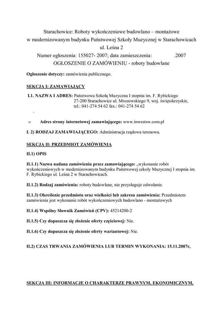 Starachowice: Roboty wykończeniowe budowlano – montaŜowe w modernizowanym budynku Państwowej Szkoły Muzycznej w Starachowicach ul. Leśna 2 Numer ogłoszenia: 155027- 2007; data zamieszczenia: .2007 OGŁOSZENIE O ZAMÓWIENIU - roboty budowlane Ogłoszenie dotyczy: zamówienia publicznego. SEKCJA I: ZAMAWIAJĄCY I.1. NAZWA I ADRES: Państwowa Szkołą Muzyczna I stopnia im. F. Rybickiego 27-200 Starachowice ul. Mrozowskiego 9, woj. świętokrzyskie, tel.: 041-274 54 62 fax.: 041-274 54 62 . • Adres strony internetowej zamawiającego: www.inwestsw.com.pl I. 2) RODZAJ ZAMAWIAJĄCEGO: Administracja rządowa terenowa. SEKCJA II: PRZEDMIOT ZAMÓWIENIA II.1) OPIS II.1.1) Nazwa nadana zamówieniu przez zamawiającego: „wykonanie robót wykończeniowych w modernizowanym budynku Państwowej szkoły Muzycznej I stopnia im. F. Rybickiego ul. Leśna 2 w Starachowicach. II.1.2) Rodzaj zamówienia: roboty budowlane, nie przysługuje odwołanie. II.1.3) Określenie przedmiotu oraz wielkości lub zakresu zamówienia: Przedmiotem zamówienia jest wykonanie robót wykończeniowych budowlano - montaŜowych II.1.4) Wspólny Słownik Zamówień (CPV): 45214200-2 II.1.5) Czy dopuszcza się złoŜenie oferty częściowej: Nie. II.1.6) Czy dopuszcza się złoŜenie oferty wariantowej: Nie. II.2) CZAS TRWANIA ZAMÓWIENIA LUB TERMIN WYKONANIA: 15.11.2007r, SEKCJA III: INFORMACJE O CHARAKTERZE PRAWNYM, EKONOMICZNYM, FINANSOWYM I TECHNICZNYM III.1) WARUNKI DOTYCZĄCE ZAMÓWIENIA • Informacja na temat wadium: 1.Wykonawca przystępujący do postępowania jest zobowiązany wnieść wadium w kwocie: 6 000,00 PLN (słownie złotych: sześć tysięcy) 2.Wadium wnosi się przed upływem terminu składania ofert. 3.Wadium moŜe być wniesione zgodnie z Ustawą PZP, 4.Dowód wniesienia wadium naleŜy załączyć do oferty.. III.2) WARUNKI UDZIAŁU • Opis warunków udziału w postępowaniu oraz opis sposobu dokonywania oceny spełniania tych warunków: W przetargu mogą wziąć udział wykonawcy, którzy: 1.spełniają warunki określone w art. 22 ust.1 Pzp, 2.nie podlegają wykluczeniu z postępowania na podstawie art. 24 ust.1 i 2 Pzp, 3.dysponują osobą posiadającą uprawnienia budowlane do kierowania robotami budowlanymi, jak równieŜ przynaleŜącą do właściwej izby samorządu zawodowego, 4.posiadają doświadczenie zawodowe rozumiane jako naleŜyte wykonanie w okresie ostatnich trzech lat przed dniem wszczęcia postępowania o udzielenie zamówienia, a jeŜeli okres prowadzenia działalności jest krótszy - w tym okresie, co najmniej 2 robót budowlanych o wartości co najmniej 500 000,00 zł brutto kaŜda. Zamawiający oceni spełnienie warunków wg kryteriów spełnia lub nie spełnia. • Informacja o oświadczeniach i dokumentach, jakie mają dostarczyć wykonawcy w celu potwierdzenia spełniania warunków udziału w postępowaniu: a)oświadczenie wykonawcy o spełnianiu warunków określonych w art. 22 ust. 1 Pzp, b)aktualny odpis z właściwego rejestru albo aktualne zaświadczenia o wpisie do ewid. działalności gospodarczej, jeŜeli odrębne przepisy wymagają wpisu do rejestru lub zgłoszenia do ewidencji działalności gosp., c)wykaz osób przewidzianych do kierowania robotami budowlanymi, d)wykaz robót budowlanych . Wszystkie załączniki zgodnie ze SIWZ SEKCJA IV: PROCEDURA IV.1) TRYB UDZIELENIA ZAMÓWIENIA IV.1.1) Tryb udzielenia zamówienia: przetarg nieograniczony. IV.2) KRYTERIA OCENY OFERT IV.2.1) Kryteria oceny ofert: najniŜsza cena. IV.2.2) Wykorzystana będzie aukcja elektroniczna: Nie. IV.3) INFORMACJE ADMINISTRACYJNE IV.3.1) Adres strony internetowej, na której dostępna jest specyfikacja istotnych warunków zamówienia: www.inwestsw.com.pl Specyfikację istotnych warunków zamówienia moŜna uzyskać pod adresem: Państwowa Szkoła Muzyczna I stopnia im. F. Rybickiego 27-200 Starachowice ul. Mrozowskiego 9 IV.3.4) Termin składania wniosków o dopuszczenie do udziału w postępowaniu lub ofert:01/10/2007 godzina 10:00, miejsce: Państwowa Szkoła Muzyczna I stopnia im. F. Rybickiego 27-200 Starachowice ul. Mrozowskiego 9 IV.3.5) Termin związania ofertą: okres w dniach: 30 (od ostatecznego terminu składania ofert).
