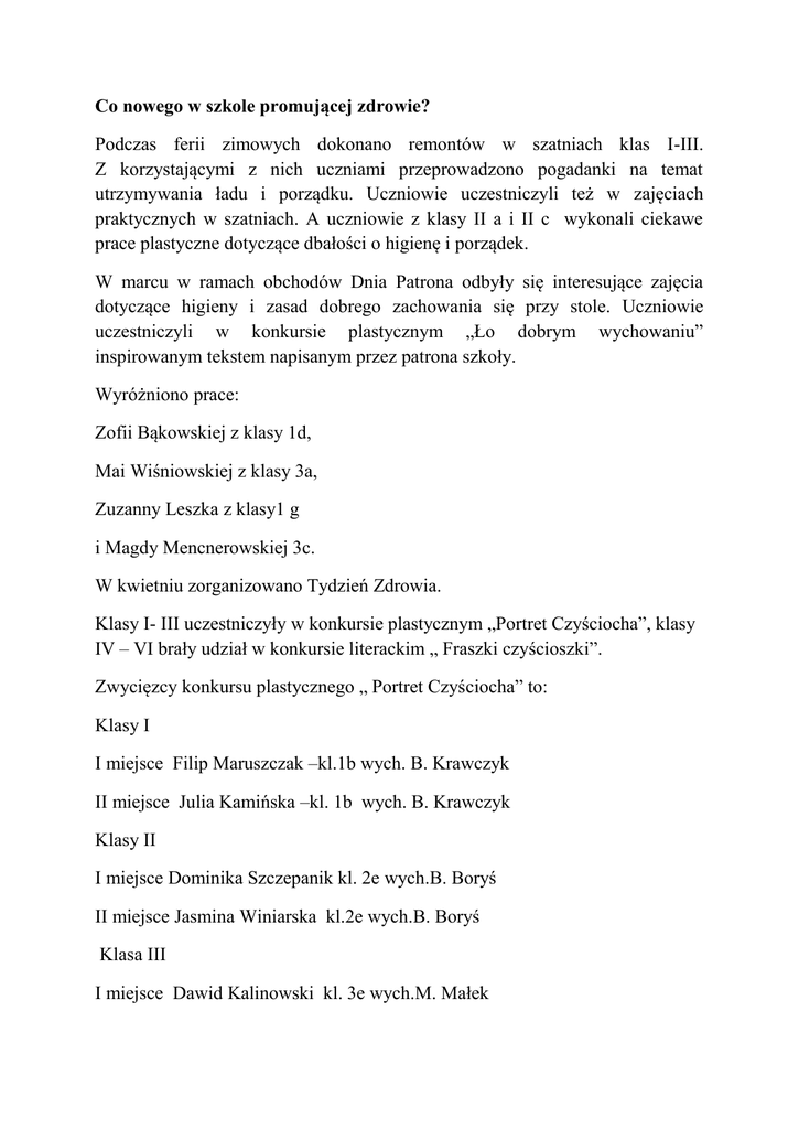 Co nowego w szkole promującej zdrowie? Podczas ferii zimowych dokonano remontów w szatniach klas I-III. Z korzystającymi z nich uczniami przeprowadzono pogadanki na temat utrzymywania ładu i porządku. Uczniowie uczestniczyli też w zajęciach praktycznych w szatniach. A uczniowie z klasy II a i II c wykonali ciekawe prace plastyczne dotyczące dbałości o higienę i porządek. W marcu w ramach obchodów Dnia Patrona odbyły się interesujące zajęcia dotyczące higieny i zasad dobrego zachowania się przy stole. Uczniowie uczestniczyli w konkursie plastycznym „Ło dobrym wychowaniu” inspirowanym tekstem napisanym przez patrona szkoły. Wyróżniono prace: Zofii Bąkowskiej z klasy 1d, Mai Wiśniowskiej z klasy 3a, Zuzanny Leszka z klasy1 g i Magdy Mencnerowskiej 3c. W kwietniu zorganizowano Tydzień Zdrowia. Klasy I- III uczestniczyły w konkursie plastycznym „Portret Czyściocha”, klasy IV – VI brały udział w konkursie literackim „ Fraszki czyścioszki”. Zwycięzcy konkursu plastycznego „ Portret Czyściocha” to: Klasy I I miejsce Filip Maruszczak –kl.1b wych. B. Krawczyk II miejsce Julia Kamińska –kl. 1b wych. B. Krawczyk Klasy II I miejsce Dominika Szczepanik kl. 2e wych.B. Boryś II miejsce Jasmina Winiarska kl.2e wych.B. Boryś Klasa III I miejsce Dawid Kalinowski kl. 3e wych.M. Małek Szymon Ignar kl.3d wych.A. Kornak II miejsce Wiktoria Rusek kl.3c wych.M Nawrot III miejsce Aleksandra Łapisz kl.3c wych.M Nawrot Karolina Orzechowska kl.3c wych.M Nawrot W konkursie literackim zwyciężył Natan Kuśmirek z klasy 5c, drugie miejsce zajął Alan Kuśmirek z klasy 4c. W klasach I – III podczas tygodnia zdrowia odbywały się też zajęcia dotyczące ładu i porządku w otoczeniu i tornistrze. Ze względów organizacyjnych planowane w Tygodniu Zdrowia przedstawienie „Czystość to zdrowie” odbyło się w maju. Obejrzeli je uczniowie młodszych klas naszej szkoły i rodzice uczniów klasy II H. 29 kwietnia 2016 roku odbył się Szkolny Turniej Zdrowotny. Turniej został przygotowany przez nauczycieli : Magdalenę Nawrot, Annę Galę, Olgę Czyż, Renatę Kaczmarek i Urszulę Zielińską. Uczestniczyły w nim wszystkie klasy III. Otwarcia turnieju dokonała pani dyrektor Gabriela Kozik. Sześciu przedstawicieli z każdej klasy brało udział w konkurencjach sportowych, były to: skoki w workach, „sadzenie ziemniaków”, sztafeta z piłką lekarską oraz rzut do ruchomego celu. Wylosowani reprezentanci z publiczności brali udział w konkurencjach dotyczących wiedzy o zdrowiu. Rozwiązywali krzyżówkę, rebus, szyfrogram i układali puzzle. Każda klasa miała również za zadanie zaśpiewania piosenki dotyczącej dbałości o higienę osobistą Atmosfera podczas turnieju była gorąca, a rywalizacja zaciekła. O ostatecznym wyniku turnieju zdecydowała dogrywka – skoki przez skakankę. Zmagania poszczególnych klas oceniało jury w składzie: pani Elżbieta Ignar – reprezentant rodziców, pielęgniarka szkolna – pani Monika Paś - Herba, pani Urszula Zielińska – nauczyciel edukacji wczesnoszkolnej. Zawody obserwowała również pani wicedyrektor Magdalena Świaczny – Szafraniec. Zwycięzcami Szkolnego Turnieju Zdrowotnego zostali uczniowie z klasy III c. Drugie miejsce zajęła klasa III, a trzecie klasa III. Wszystkie klasy otrzymały dyplomy i nagrody ufundowane przez Radę Rodziców. Z inicjatywy Rady Rodziców we współpracy z m. in. :MOSiR, Komendą Straży Pożarnej w Żorach, Radą Dzielnicy Powstańców Ślaskich i Księcia Władysława, Centrum Organizacji Pozarządowych, Piekarnią Rehlis, Zarządem Spółdzielni Mieszkaniowej w Żorach, Firmią P.P.H.U eXploat.pl, Firmą KNS Ślaską Fabryką Okien odbył się Festyn Rodzinny na Sportowo z SP 17. Odbył się wówczas pokaz udzielania pierwszej pomocy, rozgrywki sportowe i różnego typu zajęcia. Przeprowadzono konkursy plastyczne „Sport to zdrowie” i „Dyscypliny Olimpijskie”. W konkursie Plastycznym dla klas I - III pt :"Sport to zdrowie". I miejsce zdobyła Maja Faryna II miejsce zdobyła Dominika Zaborska III miejsce zdobyła Marta Sołtys Wyróżnienia przyznano następującym uczniom: Oliwia Szołtysek Magdalena Lanuszny Kacper Górski Wiktoria Kustra Paweł Boruta Organizatorkami konkursu były panie: Magdalena Nawrot, Agnieszka Zdziebło, Urszula Zielińska W konkursie „ Dyscypliny olimpijskie” zwyciężyli: I miejsce w kategorii klas 4 – Maja Kisiel z klasy 4 B I miejsce w kategorii klas 5 – Zuzanna Jaromin 5 B I miejsce w kategorii klas 6 – Nadia Wawrzyńczuk 6d Wyróżnienia: Paulina Samek 6 B Amelia Szymańska 6 D Aleksandra Tomaszewska 5E Zuzanna Grzymała 5 G Angelika Sulorz 6 B Uczniowie biorący udział w konkursach otrzymali atrakcyjne nagrody. Uczniowie klas drugich uczestniczą w profilaktycznym„ Nie pal przy mnie proszę” . ogólnopolskim programie