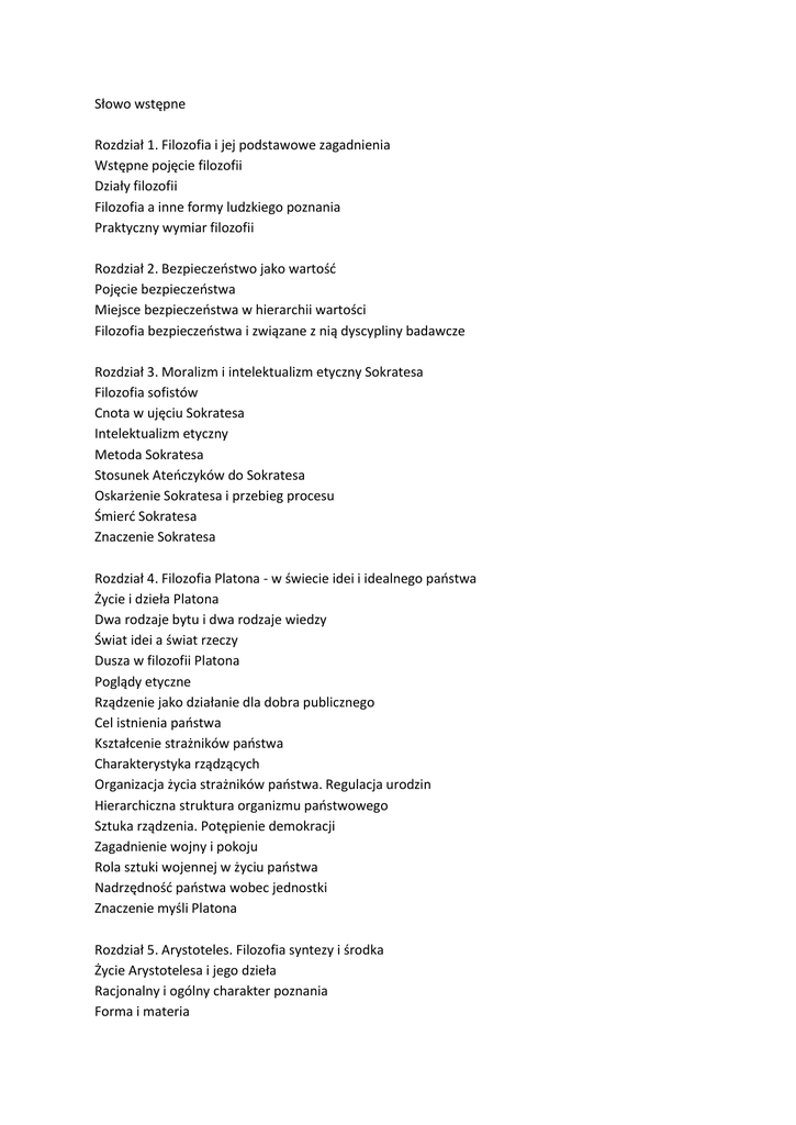 Słowo wstępne Rozdział 1. Filozofia i jej podstawowe zagadnienia Wstępne pojęcie filozofii Działy filozofii Filozofia a inne formy ludzkiego poznania Praktyczny wymiar filozofii Rozdział 2. Bezpieczeństwo jako wartość Pojęcie bezpieczeństwa Miejsce bezpieczeństwa w hierarchii wartości Filozofia bezpieczeństwa i związane z nią dyscypliny badawcze Rozdział 3. Moralizm i intelektualizm etyczny Sokratesa Filozofia sofistów Cnota w ujęciu Sokratesa Intelektualizm etyczny Metoda Sokratesa Stosunek Ateńczyków do Sokratesa Oskarżenie Sokratesa i przebieg procesu Śmierć Sokratesa Znaczenie Sokratesa Rozdział 4. Filozofia Platona - w świecie idei i idealnego państwa Życie i dzieła Platona Dwa rodzaje bytu i dwa rodzaje wiedzy Świat idei a świat rzeczy Dusza w filozofii Platona Poglądy etyczne Rządzenie jako działanie dla dobra publicznego Cel istnienia państwa Kształcenie strażników państwa Charakterystyka rządzących Organizacja życia strażników państwa. Regulacja urodzin Hierarchiczna struktura organizmu państwowego Sztuka rządzenia. Potępienie demokracji Zagadnienie wojny i pokoju Rola sztuki wojennej w życiu państwa Nadrzędność państwa wobec jednostki Znaczenie myśli Platona Rozdział 5. Arystoteles. Filozofia syntezy i środka Życie Arystotelesa i jego dzieła Racjonalny i ogólny charakter poznania Forma i materia Przyczyny działające w świecie. Powszechna celowość Pierwszy Poruszyciel i budowa wszechświata Rola duszy w świecie organicznym Pojęcie substancji Struktura wiedzy Poglądy etyczne Państwo a jednostka Sprawiedliwość. Kwestia niewolnictwa Cel istnienia państwa Ustrój państwa Prawa obywatelskie Bezpieczeństwo państwa Wojna jako środek do pokoju Państwo a wychowanie Państwo a małżeństwo Znaczenie filozofii Arystotelesa Rozdział 6. Epikureizm. Szczęście jako spokojne i bezpieczne życie Życie Epikura Hedonizm Teoria przyrody Demokryta Wiodąca rola etyki w poznaniu. Kanonika Fizyka i jej instrumentalny charakter Etyka. Natura przyjemności Stosunek do cierpienia i śmierci Rola cnót Wartość bezpieczeństwa. Znaczenie przyjaźni Charakter filozofii Epikura Rozdział 7. Stoicy i idea niezależności od losu Szkoła stoicka Filozofia cyników Natura wszechświata Konieczność i wolność Natura człowieka i cel życia Charakter życia zgodnego z rozumem Rzeczy zależne i niezależne Przygotowanie do śmierci Gotowość na cierpienie Obowiązki wobec ludzi Filozofia grecka w Rzymie Poglądy Cycerona Stoicyzm a problem bezpieczeństwa Rozdział 8. Św. Augustyn i państwo Boże Wpływ religii na filozofię Kształtowanie się filozofii chrześcijańskiej Życie i działalność św. Augustyna Charakter poznania. Poznanie prawd wiecznych Stosunek Boga do świata i cel człowieka Działanie łaski Państwo Boże i państwo ziemskie Znaczenie pokoju Ziemskie bytowanie człowieka jako cierpienie Wieczny pokój i wieczna wojna Kościół, państwo, władza Rozdział 9. Św. Tomasz z Akwinu. Synteza arystotelizmu i chrześcijaństwa Scholastyka i jej zagadnienia Życie i dzieło św. Tomasza Filozofia a teologia Teoria bytu Dowody na istnienie Boga Dusza a ciało. Poznanie Poglądy etyczne Państwo a Kościół Zadania państwa Rodzaje prawa i jego stosowanie Bezpieczeństwo w poglądach św. Augustyna i św. Tomasza Znaczenie św. Tomasza z Akwinu Rozdział 10. Niccolo Machiavelli i polityka bez moralności Schyłek scholastyki Poglądy Ockhama Humanizm odrodzenia. Zmiany społeczno-ekonomiczne Życie i twórczość Machiavellego Polityczne uwarunkowania doktryny Machiavellego Sposoby podporządkowania podbitych państw Technika zdobywania i utrzymywania władzy Znaczenie wojska Wizerunek i zobowiązania księcia Sztuka rządzenia a ludzka natura Powinność i fakty Troska władcy o państwo Zasady Machiavellego a praktyka polityczna Poglądy Bodina Rozdział 11. Renesansowe wizje idealnego państwa. Thomas More, Francis Bacon, Tomasso Campanella Życie i działalność Morusa Utopia i utopie Krytyka własności prywatnej Zniesienie własności Praca i czas wolny. Religia System prawny Wojna i metody walki Istota poglądów Morusa Życie i dzieła Bacona Poznanie przyrody i rola techniki Teoria złudzeń umysłu Teoria indukcji Państwo nauki. Technologie militarne Spełnione i niespełnione przewidywania Bacona Życie i twórczość Campanelli Metafizyka Budowa zewnętrzna Miasta Słońca Struktura władzy Własność i praca Nadzór nad płodzeniem dzieci i wychowaniem Religia Wojna a funkcjonowanie Miasta Słońca Charakter poglądów Campanelli. Wojna w myśli utopistów Rozdział 12. Thomas Hobbes i wojna wszystkich ze wszystkimi Życie i dzieła Hobbesa Materializm mechanistyczny. Problem poznania Podział nauk Filozofia człowieka Wojna wszystkich przeciwko wszystkim jako stan natury Prawa natury. Znaczenie pokoju Pochodzenie władzy zwierzchniej Uprawnienia suwerena i poddanych Monarchia jako najlepszy ustrój Państwo, Kościół, religia Istota filozofii polityki Hobbesa Poglądy Grocjusza Rozdział 13. John Locke. Wolność, równość, własność, tolerancja Filozofia Kartezjusza Życie i dzieła Locke‘a Pochodzenie idei Empiryzm Idee proste. Cechy pierwotne i wtórne Idee złożone Substancja Istnienie Boga Stan natury jako stan zmierzający do pokoju i bezpieczeństwa Stan natury a stan wojny Własność Społeczeństwo obywatelskie Władza zdobyta przez siłę Idea tolerancji religijnej Rozdział państwa od Kościoła Granice tolerancji Znaczenie Locke‘a David Hume jako kontynuator empiryzmu Locke‘a Rozdział 14. Jean-Jacques Rousseau i filozofia francuskiego oświecenia Charakter francuskiej filozofii XVIII wieku Czołowi myśliciele francuskiego oświecenia Diderot i Encyklopedia Życie i twórczość Rousseau Potępienie nauki, sztuki i współczesnej cywilizacji Stan natury Powstanie społeczeństwa Umowa społeczna Funkcjonowanie rządu Państwo a religia Oddziaływanie poglądów Ro