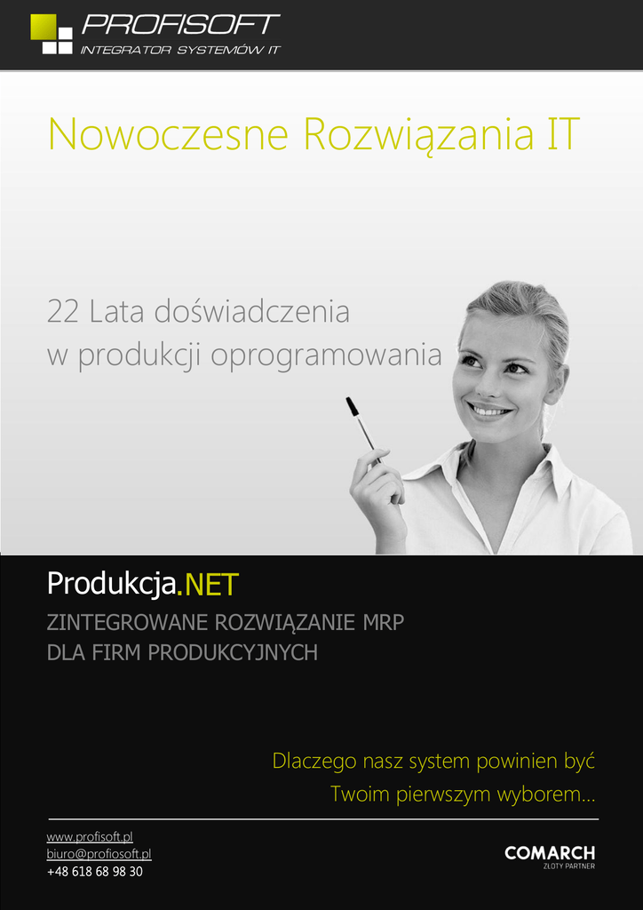 Produkcja.NET Strona |1 Nowoczesne Rozwiązania IT 22 Lata doświadczenia w produkcji oprogramowania Produkcja.NET ZINTEGROWANE ROZWIĄZANIE MRP DLA FIRM PRODUKCYJNYCH Kiosk Warsztatowy rejestracji kart pracy Dlaczego naszTryb system powinien być Twoim pierwszym wyborem… www.profisoft.pl [email protected] www.profisoft.pl +48 618 68 98 30 [email protected] +48 618 68 98 30 str. 1 Produkcja.NET Strona |2 Rozwiązanie dla Każdej branży produkcyjnej… Nasz produkt został tak skonstruowany, żeby stanowić rozwiązanie dla każdej branży. Architektura systemu pozwala na dostosowanie go do indywidualnych potrzeb firmy. System stworzony jest w najnowszej technologii integruje się z urządzeniami produkcyjnymi i Twoim systemem ERP. Tu już działa… Branża narzędziowa Branża budowlana Branża militarna Branża motoryzacyjna Branża meblowa Twoja branża A jaka jest Twoja branża ? Nie możemy powiedzieć, że nigdy niczym nikt nas nie zaskoczył… Mamy jednak receptę na oprogramowanie spełniające zaoptrzebowanie każdej branży. Konstrukcja systemu umożliwiająca wysoki poziom konfiguracji i dział tworzenia rozwiązań dedykowanych pozwoli dostosować nasz produkt do najbardziej wymagających projektów… Dlaczego jesteśmy tacy Pewni ? Produkcja.NET powstała w oderwaniu o istnijące produkty na rynku klasy MRP. Wdrażając wcześniej inne systemy ERP oraz MRP i co najważniejsze słuchając naszych Klientów stworzyliśmy kompilacje najlepszych cech które zapakowaliśmy w nasz system. www.profisoft.pl [email protected] +48 618 68 98 30 str. 2 Produkcja.NET Strona |3 W trzech zdaniach o systemie Produkcja.NET System Produkcja.NET jest kompleksowym rozwiązaniem wspierającym zarządzanie produkcją w systemie Comarch ERP XL. Nasz MRP wspiera złożone procesy produkcji wymagające szczegółowego kalkulowania, planowania i kontroli TKW "Techniczny Koszt Wytworzenia". Produkcja.NET zawiera zestaw funkcjonalności umożliwiających rejestrację bazy produkcyjnej i technologii wytwarzania produktów. System daje możliwość ewidencji kart technologicznych, kalkulacji kosztów wytworzenia produktów, a także planowania produkcji i zapotrzebowania surowcowego oraz nadzorowania procesu produkcji. Celujemy w Twoje potrzeby… Produkcja.NET jest aplikacją wspierającą zarządzanie procesem produkcyjnym i rozliczaniem kosztów produkcji w pełnym zakresie funkcjonalnym. Program jest ściśle zintegrowany z pozostałymi W aplikacji można wydzielić trzy obszary kompetencyjne: Technologia - obszar odpowiedzialny za tworzenie i ewidencjonowanie wzorcowej dokumentacji technologicznej produktów; Produkcja - obszar odpowiedzialny za otwieranie, uruchamianie, rozliczanie i prowadzenie zleceń produkcyjnych na wytwarzanie produktów; Administracja - obszar odpowiedzialny za prowadzenie dodatkowych ewidencji, słowników i pomocniczych rejestrów elementów niezbędnych do realizacji produkcji.; Niektóre podpunkty istotne z punktu widzenia produkcji… Podstawową ewidencją modułu Profukcja.NET jest dokumentacja technologiczna obejmująca standardową, hierarchiczną dokumentację technologiczną oraz technologie wyrobów podobnych. modułami systemu Comarch ERP XL, szczególnie z modułem magazynowym z którego funkcjonalności Wyroby podobne korzysta. Jest to bardzo elastyczna aplikacja, która Technologia wyrobów podobnych pozawala na dynamiczne tworzenie technologii na podstawie wspiera różne procesy produkcyjne, podzielone ze względu na rodzaj produktu. System pozwala jednocześnie działać w oparciu o produkcję zadanych (na przykład w zapytaniu ofertowym lub powtarzalną, jak również na indywidualne zleceniu) parametrów. Na podstawie dokumentacji technologicznej (typowej lub pochodzącej z definicji zamówienie Klienta. Wyrobów podobnych) uruchamiane są zlecenia produkcyjne i w konsekwencji zapotrzebowania na surowce i karty pracy. Na każdym etapie realizacji zlecenia można otrzymać informacje o kosztach i stanie realizacji. Zarejestrowane zlecenia produkcyjne są umieszczane w harmonogramie prac. W każdym momencie obłożenie poszczególnych stanowisk i harmonogram można zobaczyć na wykresie Gantta dla konkretnych zleceń, jak również dla poszczególnych stanowisk produkcyjnych. www.profisoft.pl [email protected] +48 618 68 98 30 str. 3 Produkcja.NET Strona |4 Symulacja kosztów Jeśli organizacja produkcji w przedsiębiorstwie to Obsługa braków, technologia naprawy… przewiduje, stan realizacji zlecenia jest śledzony na W procesie produkcyjnym zdarzają się braki. podstawie spływających kart pracy i rozchodów surowcowych. System wspiera prace działów handlowych w modułach symulacji kosztów i Rejestr Spraw. Symulacja pozwala udawać otwarcie zlecenia produkcyjnego dla wyrobu wg zadanych parametrów (np. ilość w zleceniu) i wyznaczenie kosztów własnych w celu precyzyjnego określenia ceny sprzedaży. Symulacja może być również uwzględniana w harmonogramie, jeśli tak zdecyduje operator (spodziewane zamówienia). Spinanie symulacji z zapytaniami ofertowymi Rejestr Spraw ewidencjonuje zapytania ofertowe na produkty, parametry tych produktów, spina je z symulacjami oraz ew. ofertami innych producentów pozwalając handlowcom podejmować optymalne decyzje, czy daną część zlecenia realizować jako zlecenie produkcyjne lub pozyskać z rynku, jeśli warunki dostawy są korzystniejsze niż produkcja własna. Wsparcie dla braków obejmuje dodatkowe technologie naprawy braków naprawialnych i obsługę braków nienaprawialnych. W przypadku, gdy z różnych względów rozchody surowców różniły się od zdefiniowanych w opisie technologicznym, możemy do zlecenia zarejestrować dodatkowe przychody i rozchody magazynowe w zależności od potrzeb. Surowce na zlecenie mogą być wydawane z magazynów lub przez pośredni magazyn produkcyjny w zależności od organizacji pracy przedsiębiorstwa. Zamknięcie zlecenia blokuje ew. próby rejestrow