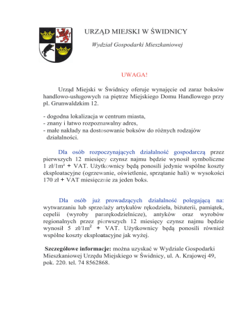 URZĄD MIEJSKI W ŚWIDNICY Wydział Gospodarki Mieszkaniowej UWAGA! Urząd Miejski w Świdnicy oferuje wynajęcie od zaraz boksów handlowo-usługowych na piętrze Miejskiego Domu Handlowego przy pl. Grunwaldzkim 12. - dogodna lokalizacja w centrum miasta, - znany i łatwo rozpoznawalny adres, - małe nakłady na dostosowanie boksów do różnych rodzajów działalności. Dla osób rozpoczynających działalność gospodarczą przez pierwszych 12 miesięcy czynsz najmu będzie wynosił symboliczne 1 zł/1m² + VAT. Użytkownicy będą ponosili jedynie wspólne koszty eksploatacyjne (ogrzewanie, oświetlenie, sprzątanie hali) w wysokości 170 zł + VAT miesięcznie za jeden boks. Dla osób już prowadzących działalność polegającą na: wytwarzaniu lub sprzedaży artykułów rękodzieła, biżuterii, pamiątek, cepelii (wyroby pararękodzielnicze), antyków oraz wyrobów regionalnych przez pierwszych 12 miesięcy czynsz najmu będzie wynosił 5 zł/1m2 + VAT. Użytkownicy będą ponosili również wspólne koszty eksploatacyjne jak wyżej. Szczegółowe informacje: można uzyskać w Wydziale Gospodarki Mieszkaniowej Urzędu Miejskiego w Świdnicy, ul. A. Krajowej 49, pok. 220. tel. 74 8562868.
