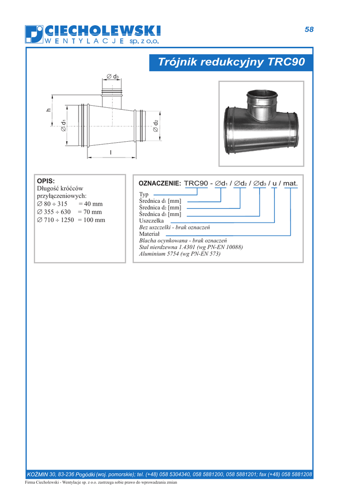 58 W E N T Y L A C J E sp. z o.o. Trójnik redukcyjny TRC90 Æ d2 Æ d1 h Æ d3 l OPIS: D³ugoœæ króæców przy³¹czeniowych: Æ 80 ¸ 315 = 40 mm Æ 355 ¸ 630 = 70 mm Æ 710 ¸ 1250 = 100 mm 30, 83-236 OZNACZENIE: TRC90 - Æd1 / Æd2 / Æd3 / u / mat. Typ Œrednica d1 [mm] Œrednica d2 [mm] Œrednica d3 [mm] Uszczelka Bez uszczelki - brak oznaczeñ Materia³ Blacha ocynkowana - brak oznaczeñ Stal nierdzewna 1.4301 (wg PN-EN 10088) Aluminium 5754 (wg PN-EN 573) (woj. pomorskie); tel. (+48) 058 5304340, 058 5881200, 058 5881201; fax (+48) 058 5881208 Firma Ciecholewski - Wentylacje sp. z o.o. zastrzega sobie prawo do wprowadzania zmian 59 W E N T Y L A C J E sp. z o.o. Trójnik redukcyjny TRC90 Tabela 21. Przyk³adowe wymiary charakterystyczne trójników redukcyjnych TRC90. Æd1 [mm] Æd2 [mm] Æd3 [mm] l [mm] Masa [kg] Æd1 [mm] Æd2 [mm] Æd3 [mm] l [mm] Masa [kg] 100 160 80 80 80 100 80 100 100 160 160 100 100 160 160 200 200 160 160 200 200 250 250 200 200 250 250 315 315 80 80 100 100 80 80 100 100 160 80 100 100 160 160 200 100 160 160 200 200 250 160 200 200 250 250 315 250 280 310 310 280 280 310 310 290 280 310 310 390 390 450 340 420 420 480 480 550 420 480 480 550 550 640 0,7 1,0 1,1 1,2 1,0 1,2 1,4 1,5 1,5 1,2 1,4 1,4 1,5 1,6 1,6 1,8 2,1 1,9 2,4 2,8 3,6 2,9 3,8 4,4 5,3 6,5 7,3 500 250 250 315 315 400 400 315 315 400 400 500 500 400 400 500 500 630 630 500 500 630 630 800 800 630 630 800 200 250 250 315 315 400 250 315 315 400 400 500 315 400 400 500 500 630 400 500 500 630 630 800 500 630 630 480 550 550 640 640 760 600 690 690 810 810 950 690 810 810 950 950 1140 810 950 950 1140 1140 1380 1190 1190 1190 4,8 6,6 7,4 8,1 9,2 10,7 9,6 8,3 10,5 14,0 16,4 18,1 10,9 14,2 15,6 19,2 22,2 26,1 28,4 30,6 32,2 36,4 42,3 47,4 50,6 56,1 62,2 200 250 315 400 30, 83-236 630 800 1000 1250 (woj. pomorskie); tel. (+48) 058 5304340, 058 5881200, 058 5881201; fax (+48) 058 5881208 Firma Ciecholewski - Wentylacje sp. z o.o. zastrzega sobie prawo do wprowadzania zmian 60 W E N T Y L A C J E sp. z o.o. Trójnik redukcyjny TRC90 Rys. 18. Zale¿noœæ spadku ciœnienia od natê¿enia przep³ywu dla trójnika TRC 90. 30, 83-236 (woj. pomorskie); tel. (+48) 058 5304340, 058 5881200, 058 5881201; fax (+48) 058 5881208 Firma Ciecholewski - Wentylacje sp. z o.o. zastrzega sobie prawo do wprowadzania zmian 61 W E N T Y L A C J E sp. z o.o. Trójnik redukcyjny TRC90 Rys. 18. Zale¿noœæ spadku ciœnienia od natê¿enia przep³ywu dla trójnika TRC90. 30, 83-236 (woj. pomorskie); tel. (+48) 058 5304340, 058 5881200, 058 5881201; fax (+48) 058 5881208 Firma Ciecholewski - Wentylacje sp. z o.o. zastrzega sobie prawo do wprowadzania zmian 62 W E N T Y L A C J E sp. z o.o. Trójnik redukcyjny TRC90 Rys. 18. Zale¿noœæ spadku ciœnienia od natê¿enia przep³ywu dla trójnika TRC90. 30, 83-236 (woj. pomorskie); tel. (+48) 058 5304340, 058 5881200, 058 5881201; fax (+48) 058 5881208 Firma Ciecholewski - Wentylacje sp. z o.o. zastrzega sobie prawo do wprowadzania zmian