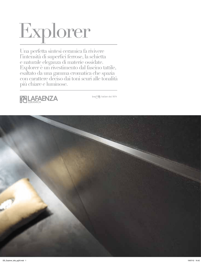 Explorer Una perfetta sintesi ceramica fa rivivere l’intensità di superfici ferrose, la schietta e naturale eleganza di materie ossidate. Explorer è un rivestimento dal fascino tattile, esaltato da una gamma cromatica che spazia con carattere deciso dai toni scuri alle tonalità più chiare e luminose. DD_Explorer_lafa_pg24.indd 1 19/07/12 16.42 EXPLORER100W LP MK.EXPLO 11N LP A perfect synthesis of ceramics relives the intensity of ferrous surfaces, the genuine and natural elegance of oxidised materials. Explorer is a cladding with tactile charm enhanced by a range of colours that starts with the strong character of dark shades to lighter and brighter shades. Une parfaite synthèse céramique fait revivre l’intensité de surfaces ferreuses, l’élégance pure et naturelle de matières oxydées. Explorer est un revêtement mural au charme tactile, mis en valeur par une gamme chromatique allant, non sans hardiesse, des tons les plus foncés aux tonalités les plus claires et les plus étincelantes. Eine perfekte Keramik-Synthese belebt die Intensität eisenhaltiger Oberflächen, die reine und natürliche Eleganz oxidierter Materialien. Explorer ist eine Keramikverkleidung von tastbarem Reiz, die sich durch eine breit gefächerte Farbskala, von kräftigen und dunklen bis hin zu hellen und strahlenden Farben hervorhebt. Una perfecta síntesis cerámica que pone de manifiesto la intensidad de las superficies ferrosas y la elegancia esencial y natural de las materias herrumbrosas. Explorer es un revestimiento principalmente táctil, enriquecido de una gama cromática que abraza con determinación tonos oscuros y tonalidades más claras y luminosas. Explorer DD_Explorer_lafa_pg24.indd 2-3 Совершенство синтеза в керамике возвращает к выразительности железной поверхности, прямой и естественной красоте окисленного материала. Плитка Explorer обладает тактильным очарованием, которое подчеркивается цветовой гаммой, решительно простирающейся от темных тонов до более светлых и сияющих оттенков. Savršena keramička sinteza oživljava intenzitet željeznih površina, iskrenu i prirodnu eleganciju oksidiranog materijala. Explorer je obloga taktilnog šarma, pojačana rasponom boja, od tamnih tonova jakih značajki prema svjetlijim i blistavim tonovima. 完美的陶瓷综合重塑铁质表面的强烈效果——氧化后材 料的诚实天然典雅。Explorer 是一款具有迷人触感的 铺面材料,具有独特个性的深浅色彩的丰富变化更是突 出这一特点。 19/07/12 16.42 Explorer EXPLORER 100T L.INOX 50 SAT DD_Explorer_lafa_pg24.indd 4-5 19/07/12 16.42 Explorer EXPLORER 100T L.INOX 50 SAT DD_Explorer_lafa_pg24.indd 6-7 19/07/12 16.42 Explorer EXPLORER100W LP DD_Explorer_lafa_pg24.indd 8-9 19/07/12 16.42 Explorer EXPLORER100W LP MK.EXPLO 11N LP DD_Explorer_lafa_pg24.indd 10-11 19/07/12 16.42 W n bianco nero suggested applications destination anwendungsbereich lugar de empleo Предназначение Krajnja namjena 用途 indications for use instructions d’utilisation anwendungsbereich indicaciones de uso указания по использованию upute o korištenju 使用说明 tipology of glaze typologie d’émail typologie der glasur tipología de esmalte Типология эмали Tipologija emajla 釉料类型 destinazioni d’uso indicazioni d’uso tipologia di smalto abitazioni pavimento rivestimento smalto opaco smalto semilucido dometisc purpose habitation wohnbereich habitación Жилое помещение Stanovanje 住宅 floor tiles sol boden piso Пол Podovi 地板 wall tiles revêtement wand revestimiento Облицовка Zidovi 墙面 matt glaze email opaque matte glasur esmalte opaco Матовая глазурь Emajlirane mat 亚光釉 semi-glossy glaze email semi-brillant halbglänzende glasur esmalte semi-brillante Полуглянцевая глазурь Emajlirane polusjajne 半高光釉 edge bord rand borde Кромка Rub 边缘 surface finish finition superficielle oberflächen acabado superficial поверхностная отделка površinska dovršenja 表面处理 shade variation variation de nuances schattierung destonalización Разброс цветового тона Gradacija 石质化 bordo finitura superficiale stonalizzazione rettificato monocalibro naturale lappato monocaliber, rectified rectifié monocalibre rettifiziert monokaliber rectificado monocalibre Ректифицированный монокалибр Retificirane monokalibarske 单尺寸研磨式 natural naturel natur matt природный prirodne 自然式 honed adouci anpoliert esmerillado полуполированный polirane 磨砂式 50x100 / 20”x40” B T beige marrone 50x50 / 20”x20” 33x66 / 13”x26” Porcellanato smaltato Glazed porcelain tiles Grès cérame émaillé Glasiertes Feinsteinzeug Porcelánico esmaltado Керамогранит глазурованный Porculansko-kamene pločice glazirane 上釉仿石瓷砖 colori DD_Explorer_lafa_pg24.indd 12-13 colours coloris Farben colori цвета boje 颜色 formati sizes formats formate formatos Форматы formati 版型 Explorer simbologia Symbols Symboles Symbole Símbolos Система символов Simboli 标识 19/07/12 16.42 explorer 50w explorer 50w lp 50x50 - 20”x20” 50x50 - 20”x20” l.inox 50 sat l.inox 50 sat 1x50 - 0.4”x20” 1x50 - 0.4”x20” explorer 100w explorer 3366w explorer100W lp explo.3366W lp 50x100 - 20”x40” 33x66 - 13”x26” 50x100 - 20”x40” 33x66 - 13”x26” mk.explo 11w lp 25x50 - 10”x20” elissi w1 50x100 - 20”x40” l.explorer 66WN 5x66 - 2”x26” l.explorer 33WN l.explorer 5F l.explorer 5N 5x33 - 2”x13” 5x33 - 2”x13” 5x33 - 2”x13” Explo