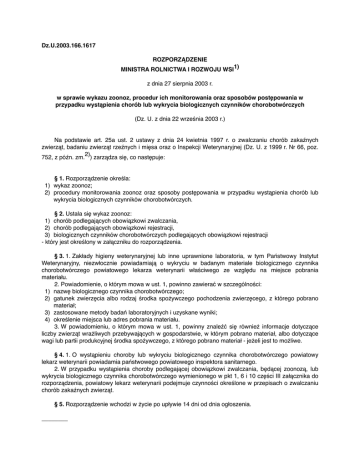 Dz.U.2003.166.1617 ROZPORZĄDZENIE MINISTRA ROLNICTWA I ROZWOJU WSI1) z dnia 27 sierpnia 2003 r. w sprawie wykazu zoonoz, procedur ich monitorowania oraz sposobów postępowania w przypadku wystąpienia chorób lub wykrycia biologicznych czynników chorobotwórczych (Dz. U. z dnia 22 września 2003 r.) Na podstawie art. 25a ust. 2 ustawy z dnia 24 kwietnia 1997 r. o zwalczaniu chorób zakaźnych zwierząt, badaniu zwierząt rzeźnych i mięsa oraz o Inspekcji Weterynaryjnej (Dz. U. z 1999 r. Nr 66, poz. 752, z późn. zm.2)) zarządza się, co następuje: § 1. Rozporządzenie określa: 1) wykaz zoonoz; 2) procedury monitorowania zoonoz oraz sposoby postępowania w przypadku wystąpienia chorób lub wykrycia biologicznych czynników chorobotwórczych. § 2. Ustala się wykaz zoonoz: 1) chorób podlegających obowiązkowi zwalczania, 2) chorób podlegających obowiązkowi rejestracji, 3) biologicznych czynników chorobotwórczych podlegających obowiązkowi rejestracji - który jest określony w załączniku do rozporządzenia. § 3. 1. Zakłady higieny weterynaryjnej lub inne uprawnione laboratoria, w tym Państwowy Instytut Weterynaryjny, niezwłocznie powiadamiają o wykryciu w badanym materiale biologicznego czynnika chorobotwórczego powiatowego lekarza weterynarii właściwego ze względu na miejsce pobrania materiału. 2. Powiadomienie, o którym mowa w ust. 1, powinno zawierać w szczególności: 1) nazwę biologicznego czynnika chorobotwórczego; 2) gatunek zwierzęcia albo rodzaj środka spożywczego pochodzenia zwierzęcego, z którego pobrano materiał; 3) zastosowane metody badań laboratoryjnych i uzyskane wyniki; 4) określenie miejsca lub adres pobrania materiału. 3. W powiadomieniu, o którym mowa w ust. 1, powinny znaleźć się również informacje dotyczące liczby zwierząt wrażliwych przebywających w gospodarstwie, w którym pobrano materiał, albo dotyczące wagi lub partii produkcyjnej środka spożywczego, z którego pobrano materiał - jeżeli jest to możliwe. § 4. 1. O wystąpieniu choroby lub wykryciu biologicznego czynnika chorobotwórczego powiatowy lekarz weterynarii powiadamia państwowego powiatowego inspektora sanitarnego. 2. W przypadku wystąpienia choroby podlegającej obowiązkowi zwalczania, będącej zoonozą, lub wykrycia biologicznego czynnika chorobotwórczego wymienionego w pkt 1, 6 i 10 części III załącznika do rozporządzenia, powiatowy lekarz weterynarii podejmuje czynności określone w przepisach o zwalczaniu chorób zakaźnych zwierząt. § 5. Rozporządzenie wchodzi w życie po upływie 14 dni od dnia ogłoszenia. ________ 1) Minister Rolnictwa i Rozwoju Wsi kieruje działem administracji rządowej - rolnictwo, na podstawie § 1 ust. 2 pkt 1 rozporządzenia Prezesa Rady Ministrów z dnia 29 marca 2002 r. w sprawie szczegółowego zakresu działania Ministra Rolnictwa i Rozwoju Wsi (Dz. U. Nr 32, poz. 305). 2) Zmiany tekstu jednolitego wymienionej ustawy zostały ogłoszone w Dz. U. z 2001 r. Nr 29, poz. 320, Nr 123, poz. 1350 i Nr 129, poz. 1438, z 2002 r. Nr 112, poz. 976 oraz z 2003 r. Nr 52, poz. 450, Nr 122, poz. 1144 i Nr 165, poz. 1590. ZAŁĄCZNIK WYKAZ ZOONOZ Część I. CHOROBY PODLEGAJĄCE OBOWIĄZKOWI ZWALCZANIA 1) 2) 3) 4) 5) 6) pryszczyca (Foot and mouth disease); gorączka doliny Rift (Rift valley fever); wścieklizna (Rabies); wąglik (Anthrax); gruźlica bydła (Bovine tuberculosis); bruceloza (Brucellosis): a) bydła, Brucella abortus (Bovine brucellosis), b) kóz i owiec, Brucella melitensis (Ovine and caprine brucellosis), c) świń, Brucella suis (Porcine brucellosis); 7) gąbczasta encefalopatia bydła (Bovine spongiform encephalopathy); 8) trzęsawka owiec (Scrapie). Część II. 1) 2) 3) 4) 5) 6) 7) 8) 9) 10) 11) listerioza (Listeriosis); toksoplazmoza, Toxoplasma gondi (Toxoplasmosis); tularemia, Francisella tularensis (Tularaemia); nosacizna, Burkholderia mallei (Glanders); gorączka Q, Coxiella burnetii (Q fever); salmonelloza, S. Enteritidis, S. Typhimurium (Salmonellosis): a) bydła i świń (Salmonellosis of cattle and pigs), b) drobiu (Avian salmonellosis); włośnica (Trichinellosis); chlamydioza ptaków i bydła (Avian and cattle chlamydiosis); kampylobakterioza, Campylobacter species (Campylobacteriosis); echinokokoza, Echinoccocus granulosus, alveokokoza, Echinoccocus multilocularis (Echinococcosis); jersinioza, Yersinia enterocolica, Yersinia pseudotuberculosis (Yersiniosis). Część III. 1) 2) 3) 4) 5) 6) 7) 8) CHOROBY PODLEGAJĄCE OBOWIĄZKOWI REJESTRACJI BIOLOGICZNE CZYNNIKI CHOROBOTWÓRCZE PODLEGAJĄCE OBOWIĄZKOWI REJESTRACJI Bacillus anthracis; Campylobacter species; Coxiella burnetii; Leptospira species (L. interrogans); Listeria monocytogenes; Mycobacterium tuberculosis (i inne prątki chorobotwórcze dla ludzi); Salmonella species (odzwierzęce typy serologiczne); Toxoplasma gondii; 9) Trichinella spiralis; 10) wirus wścieklizny; 11) Yersinia enterocolitica, Yersinia pseudotuberculosis.