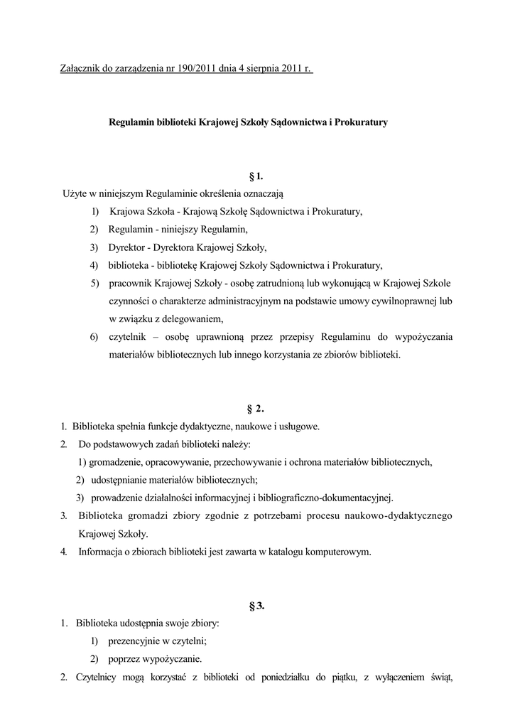 Załącznik do zarządzenia nr 190/2011 dnia 4 sierpnia 2011 r. Regulamin biblioteki Krajowej Szkoły Sądownictwa i Prokuratury § 1. Użyte w niniejszym Regulaminie określenia oznaczają 1) Krajowa Szkoła - Krajową Szkołę Sądownictwa i Prokuratury, 2) Regulamin - niniejszy Regulamin, 3) Dyrektor - Dyrektora Krajowej Szkoły, 4) biblioteka - bibliotekę Krajowej Szkoły Sądownictwa i Prokuratury, 5) pracownik Krajowej Szkoły - osobę zatrudnioną lub wykonującą w Krajowej Szkole czynności o charakterze administracyjnym na podstawie umowy cywilnoprawnej lub w związku z delegowaniem, 6) czytelnik – osobę uprawnioną przez przepisy Regulaminu do wypożyczania materiałów bibliotecznych lub innego korzystania ze zbiorów biblioteki. § 2. 1. Biblioteka spełnia funkcje dydaktyczne, naukowe i usługowe. 2. Do podstawowych zadań biblioteki należy: 1) gromadzenie, opracowywanie, przechowywanie i ochrona materiałów bibliotecznych, 2) udostępnianie materiałów bibliotecznych; 3) prowadzenie działalności informacyjnej i bibliograficzno-dokumentacyjnej. 3. Biblioteka gromadzi zbiory zgodnie z potrzebami procesu naukowo-dydaktycznego Krajowej Szkoły. 4. Informacja o zbiorach biblioteki jest zawarta w katalogu komputerowym. § 3. 1. Biblioteka udostępnia swoje zbiory: 1) prezencyjnie w czytelni; 2) poprzez wypożyczanie. 2. Czytelnicy mogą korzystać z biblioteki od poniedziałku do piątku, z wyłączeniem świąt, w następujących godzinach: 1) od 8.00 -16.00 - w dni trwania zajęć szkoleniowych dla aplikantów; 2) od 9.00 – 15.30 - w pozostałe dni. § 4. Biblioteka funkcjonuje bez wolnego dostępu do zbiorów; materiały biblioteczne podaje bibliotekarz. § 5. 1. Prawo wypożyczania zbiorów przysługuje aplikantom, wykładowcom oraz pracownikom Krajowej Szkoły. 2. Prawo korzystania ze zbiorów w czytelni przysługuje wszystkim pełnoletnim zainteresowanym. § 6. Korzystanie z czytelni następuje po zgłoszeniu się do bibliotekarza, okazaniu dokumentu tożsamości lub identyfikatora Krajowej Szkoły bądź karty bibliotecznej oraz dokonaniu wpisu do księgi odwiedzin. §7. 1. Pracownik i wykładowca Krajowej Szkoły mogą wypożyczyć materiały biblioteczne po okazaniu dokumentu tożsamości lub identyfikatora Krajowej Szkoły oraz podpisaniu oświadczenia o treści określonej w załączniku nr 1 do Regulaminu. 2. Aplikant nabywa prawo wypożyczania zbiorów z chwilą otrzymania karty bibliotecznej i jest zobowiązany okazać ważną kartę biblioteczną przy każdym wypożyczeniu. 3. Kartę biblioteczną wydaje się po okazaniu dowodu tożsamości i podpisaniu oświadczenia o treści określonej w załączniku nr 1 do Regulaminu. § 8. 1. Posiadacz karty bibliotecznej może upoważnić inną osobę do wypożyczania materiałów bibliotecznych w jego imieniu. Upoważnienie, którego wzór stanowi załącznik nr 2 do Regulaminu, składa się w bibliotece. 2. Upoważniony do wypożyczenia materiałów bibliotecznych w imieniu innej osoby powinien przy wypożyczaniu okazać kartę biblioteczną tej osoby oraz własny dowód tożsamości. 3. Kartę biblioteczną można odstąpić jedynie upoważnionemu, o którym mowa w ust. 2. 4. O zgubieniu karty bibliotecznej należy niezwłocznie poinformować bibliotekarza 5. Pierwsze wydanie duplikatu karty bibliotecznej jest bezpłatne; za każde kolejne uiszcza się opłatę 10 zł. § 9. 1. Czytelnik może wypożyczyć nie więcej niż pięć woluminów materiałów bibliotecznych, z zastrzeżeniem §10 ust. 5. 2. Nie wypożycza się materiałów bibliotecznych, z których można korzystać jedynie w czytelni, oznaczonych naklejką z napisem „czytelnia" oraz gazet codziennych. 3. Czytelnik może zarezerwować 5 woluminów materiałów bibliotecznych, niewypożyczonych innemu czytelnikowi w momencie dokonywania rezerwacji. Rezerwacja jest ważna 10 dni i po tym terminie wygasa. § 10. 1. Materiały biblioteczne wypożycza się na okres czterech tygodni, z zastrzeżeniem przepisów poniższych. 2. Na prośbę czytelnika, zgłoszoną przed upływem terminu zwrotu materiału bibliotecznego, możliwa jest prolongata terminu, jeżeli na wypożyczony materiał nie występuje zapotrzebowanie ze strony innych czytelników. 3. Na wniosek czytelnika prolongata terminu może być dokonywana trzykrotnie. 4. Bibliotekarz może wyznaczyć termin zwrotu materiału bibliotecznego krótszy od określonego w ust. l, jeżeli na materiał występuje duże zapotrzebowanie ze strony innych czytelników lub w innych uzasadnionych wypadkach. 5. Pracownik Krajowej Szkoły może wypożyczyć materiały biblioteczne, na które nie występuje zapotrzebowanie ze strony innych czytelników, na czas nieokreślony, bez ograniczenia ilościowego, o którym mowa w § 9 ust. 1, z tym, że zobowiązany jest do ich niezwłocznego zwrotu na żądanie bibliotekarza. § 11. Wypożyczone materiały biblioteczne nie muszą być zwracane przez czytelników osobiście. § 12. 1. Czytelnicy są zobowiązani szanować zbiory biblioteczne i przestrzegać przepisów Regulaminu. 2. Komputery znajdujące się w czytelni służą do przeglądania katalogu bibliotecznego, przeszukiwania baz danych oraz do innych celów naukowo-dydaktycznych. 3. Czytelnicy korzystający z komputerów ponoszą odpowiedzialność za stan stanowiska komputerowego. § 13. 1. Czytelnicy ponoszą materialną odpowiedzialność za udostępnione materiały biblioteczne. W przypadku zagubienia, zniszczenia lub uszkodzenia dzieła czytelnik jest obowiązany odkupić dzieło tożsame lub inne, wskazane przez bibliotekarza. 2. W przypadku przekroczenia terminu zwrotu wypożyczonego materiału bibliotecznego, czytelnikowi nalicza się karę pieniężną w wysokości l zł za każdy dzień zwłoki. 3. W wypadku, gdy kara pieniężna nie przekracza 10 zł oraz w innych uzasadnionych przypadkach Dyrektor, na wniosek czytelnika, może umorzyć należną karę. § 14. 1. Czytelnik podlegający karze pienię