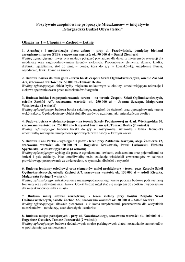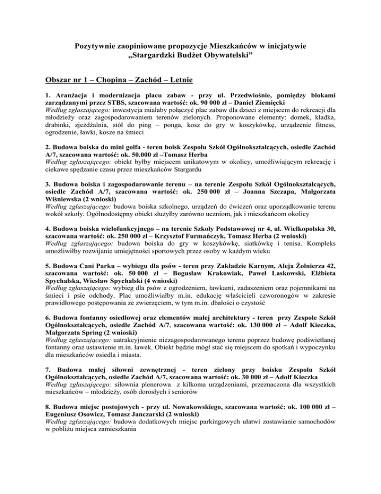 Pozytywnie zaopiniowane propozycje Mieszkańców w inicjatywie „Stargardzki Budżet Obywatelski” Obszar nr 1 – Chopina – Zachód – Letnie 1. Aranżacja i modernizacja placu zabaw - przy ul. Przedwiośnie, pomiędzy blokami zarządzanymi przez STBS, szacowana wartość: ok. 90 000 zł – Daniel Ziemięcki Według zgłaszającego: inwestycja miałaby połączyć plac zabaw dla dzieci z miejscem do rekreacji dla młodzieży oraz zagospodarowaniem terenów zielonych. Proponowane elementy: domek, kładka, drabinki, zjeżdżalnia, stół do ping – ponga, kosz do gry w koszykówkę, urządzenie fitness, ogrodzenie, ławki, kosze na śmieci 2. Budowa boiska do mini golfa - teren boisk Zespołu Szkół Ogólnokształcących, osiedle Zachód A/7, szacowana wartość: ok. 50.000 zł –Tomasz Herba Według zgłaszającego: obiekt byłby miejscem unikatowym w okolicy, umożliwiającym rekreację i ciekawe spędzanie czasu przez mieszkańców Stargardu 3. Budowa boiska i zagospodarowanie terenu – na terenie Zespołu Szkół Ogólnokształcących, osiedle Zachód A/7, szacowana wartość: ok. 250 000 zł – Joanna Szczapa, Małgorzata Wiśniewska (2 wnioski) Według zgłaszającego: budowa boiska szkolnego, urządzeń do ćwiczeń oraz uporządkowanie terenu wokół szkoły. Ogólnodostępny obiekt służyłby zarówno uczniom, jak i mieszkańcom okolicy 4. Budowa boiska wielofunkcyjnego – na terenie Szkoły Podstawowej nr 4, ul. Wielkopolska 30, szacowana wartość: ok. 250 000 zł – Krzysztof Furmańczyk, Tomasz Herba (2 wnioski) Według zgłaszającego: budowa boiska do gry w koszykówkę, siatkówkę i tenisa. Kompleks umożliwiłby rozwijanie umiejętności sportowych przez osoby w każdym wieku 5. Budowa Cani Parku – wybiegu dla psów - teren przy Zakładzie Karnym, Aleja Żołnierza 42, szacowana wartość: ok. 50 000 zł – Bogusław Krakowiak, Paweł Laskowski, Elżbieta Spychalska, Wiesław Spychalski (4 wnioski) Według zgłaszającego: wybieg dla psów z ogrodzeniem, ławkami, zadaszeniem oraz pojemnikami na śmieci i psie odchody. Plac umożliwiałby m.in. edukację właścicieli czworonogów w zakresie prawidłowego postępowania ze zwierzęciem, w tym m.in. dbałości o czystość 6. Budowa fontanny osiedlowej oraz elementów małej architektury - teren przy Zespole Szkół Ogólnokształcących, osiedle Zachód A/7, szacowana wartość: ok. 130 000 zł – Adolf Kieczka, Małgorzata Spring (2 wnioski) Według zgłaszającego: uatrakcyjnienie niezagospodarowanego terenu poprzez budowę podświetlanej fontanny oraz ustawienie m.in. ławek. Obiekt będzie mógł stać się miejscem do spotkań i wypoczynku dla mieszkańców osiedla i miasta. 7. Budowa małej siłowni zewnętrznej - teren zielony przy boisku Zespołu Szkół Ogólnokształcących, osiedle Zachód A/7, szacowana wartość: ok. 30 000 zł – Adolf Kieczka Według zgłaszającego: siłownia plenerowa z kilkoma urządzeniami, przeznaczona dla wszystkich mieszkańców – młodzieży, osób dorosłych i seniorów 8. Budowa miejsc postojowych - przy ul. Nowakowskiego, szacowana wartość: ok. 100 000 zł – Eugeniusz Osowicz, Tomasz Janczarski (2 wnioski) Według zgłaszającego: budowa dodatkowych miejsc parkingowych ułatwi zostawianie samochodów w pobliżu miejsca zamieszkania 9. Budowa oświetlenia drogi dla pieszych i ścieżki rowerowej łączącej osiedle Letnie z osiedlem Zachód (wzdłuż ogrodzenia jednostki wojskowej), szacowana wartość: ok. 120 000 zł – Grażyna Laskowska Według zgłaszającego: realizacji inwestycji przyczyniłaby się do zwiększenia bezpieczeństwa w ruchu drogowym, a także wyeliminowania spożywających alkohol po zmroku na ławkach. Droga jest licznie uczęszczana przez mieszkańców okolicznych osiedli i młodzież z pobliskich szkół oraz przez pacjentów przychodni lekarskiej 10. Budowa oświetlenia na przejściu dla pieszych - pomiędzy ulicą Lechicką a ulicą Pogodną (wzdłuż Bursy Szkolnej), szacowana wartość: ok. 35 000 zł – Krzysztof Bak Według zgłaszającego: instalacja 3 – 4 sztuk słupów oświetleniowych podniesie bezpieczeństwo osób korzystających z przejścia wzdłuż Bursy Szkolnej 11. Budowa parkingu dla samochodów osobowych – przy bloku A/21 na osiedlu Zachód, szacowana wartość: ok. 180 000 zł – Danuta Bielecka, Tadeusz Ośka, Tadeusz Różański (3 wnioski) Według zgłaszającego: budowa nowego parkingu do dyspozycji mieszkańców pobliskich budynków oraz dla pozostałych mieszkańców Stargardu 12. Budowa parku dla psów - teren Parku Stefana Batorego, szacowana wartość: ok. 100 000 zł – Joanna Koczorowska Według zgłaszającego: wydzielenie odległej części parku z przeznaczeniem dla czworonogów i ich właścicieli. Proponowane elementy: ogrodzenie, latarnie, ławeczki, przeszkody dla zwierząt, podajnik z woreczkami na odchody, kosz na śmieci oraz ewentualnie wiata chroniąca przed deszczem. Park służyłby wielu mieszkańcom Stargardu 13. Budowa placu treningowego do ćwiczeń kalistenicznych - teren boiska przy Zakładzie Karnym, Aleja Żołnierza 42, szacowana wartość: ok. 40 000 zł – Marcin Sucharzewski Według zgłaszającego: plac do treningu siłowego z wykorzystaniem masy własnego ciała na prostych przyrządach (drążki, drabinki, słupki), umożliwiający aktywne spędzanie wolnego czasu przez młodzież oraz wzrost aktywności fizycznej 14. Budowa stołów do tenisa stołowego, teren Gimnazjum nr 4, Zespołu Szkół Ogólnokształcących oraz Gimnazjum nr 3, osiedle Zachód B/15, osiedle Zachód A/7, ul. Szkolna 2, szacowana wartość: ok. 30 000 zł – Jerzy Jakubowski Według zgłaszającego: ogólnodostępne stoły dadzą możliwość aktywnego spędzania wolnego czasu. Zlokalizowanie ich na terenie szkół zapewni ochronę przed dewastacją 15. Budowa stołów do tenisa stołowego - teren Szkoły Podstawowej nr 4, ul. Wielkopolska 30, szacowana wartość: ok. 20 000 zł – Tomasz 