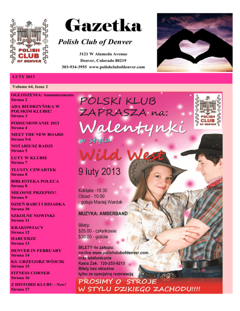 Gazetka Polish Club of Denver 3121 W Alameda Avenue Denver, Colorado 80219 303-934-3955 www.polishclubofdenver.com LUTY 2013 Volume 64, Issue 2 OGŁOSZENIA/ Announcements Strona 2 ADA BIEDRZYŃSKA W POLSKIM KLUBIE! Strona 3 PODSUMOWANIE 2012 Strona 4 MEET THE NEW BOARD Strona 5-6 NOTARIUSZ RADZI Strona 5 LUTY W KLUBIE Strona 7 TŁUSTY CZWARTEK Strona 8 BIBLIOTEKA POLECA Strona 8 MIŁOSNE PRZEPISY! Strona 9 DZIEŃ BABCI I DZIADKA Strona 10 SZKOLNE NOWINKI Strona 11 KRAKOWIACY Strona 12 HARCERZE Strona 13 DENVER IN FEBRUARY Strona 14 KS. GRZEGORZ WÓJCIK Strona 15 FITNESS CORNER Strona 16 Z HISTORII KLUBU - New! Strona 17 Edward Bogacz Jan Krajewski Kazimierz Kudla Andrew Kulenty Danuta Lewandowski Harold Maslanik Julia Maslanik Mirosława Mucek ~ Carroll Novicki ~ Janina Nowatorski ~ Rose Oleasz Michal Płatek ~ Józef Polak Barbara Polak ~ Ryszard Rykowski ~ Roman Sałata Jan Trzeciak ~ Anna Trzeciak ~ Gregory Walkowiak Janina Ządło ~ Bożena Zródłowska If you prefer that your birthday is not disclosed, contact Roman Sałata, Membership Director at 303-988-6251. ~ REZERWUJ ONLINE ~ Zachęcamy Państwa do korzystania z naszego internetowego systemu rezerwacji. Jest to możliwe już przywiększości imprez klubowych. Wystarczy wejść na stronę Klubu: www.polishclubofdenver.com i kliknąć na KUP BILETY przy imprezie, którą jesteście Państwo zainteresowani. Z Twojej karty kredytowej zostanie ściągniety $1 jako autoryzacja, a reszta sumy na 48 godzin przed rozpoczęciem imprezy. Jest to bezpieczny i szybki serwis. W przypadku usprawiedliwionej nieobecności, istnieje możliwość zwrotu pieniędzy na kartę kredytową, z której zrobiona została rezerwacja. Zachęcamy do zakupu biletów przez internet na nadchodzący występ Adrianny Biedrzyńskiej pt. „Ada To Nie Wypada Czyli Wspólna Z Widzami Piosenkowa Biesiada”, który odbędzie się 12 lutego b.r. o godz. 19:00 w Klubie Polskim w Denver. SPECJANE ŻYCZENIA URODZINOWE DLA ROMANA SAŁATY od kolegów z Zarządu! Gratulacje dla Ireny i Andrzeja Motas z okazji narodzin wnuka! COOPER ALEXANDER TAYLOR urodzony 01/16/2013! Środa, 6 luty, godz. 6:00 pm Wolontariusze potrzebni do dekorowania Klubu na Zabawę Walentynkową. Chętnych do pomocy zapraszamy do Klubu na godz. 18:00. ~ Czwartek, 7 luty, godz. 7:00 pm „Tusty Czwartek” Dla Polonii - Fat Thursday! Join us at the Club on February 7th at 7pm for some traditional Polish „Pączki”! ~ Wtorek, 12 luty, godz. 7:00pm "Ada to nie wypada, czyli wspólna z widzami piosenkowa Biesiada". Spektakl muzyczny złożony z piosenek i przyśpiewek w wykonaniu Ady Biedrzyńskiej, znanej polskiej aktorki telewizyjnej, teatralnej i kabaretowej. Bilety: $20. www.polishclubofdenver.com lub telefonicznie: Kasia Zak 720-233-9213. ~ Sobota 16 luty, godz. 6:30 pm Brighton Ziębice Sister Cities 9th Annual Dinner & Auction Brighton Recreation Center - 555 N 11th Ave Tickets are $12.50/Person Info: Henry Ross │[email protected] ~ ZUMBA Classes at the Polish Club starting in March! Details to follow via email and on Facebook. 2 Online booking and reservations are now available for most Club events. To make a reservation, please go to our website at www.polishclubofdenver.com and click on BUY TICKETS by the event of your choice. Your credit card will be charged $1 to authorize the transaction. The remaining amount will be charged within 48 hours from the event. It is safe, fast and convenient. We encourage you to make an online reservation for the February show of Polish actress Ada Biedrzynska. QUESTIONS: Anna Spencer 720-583-3806 SCHOLARSHIP Deadline is March 1, 2013. Online application: http://polishclubofdenver.com/forms/Scholarship.pdf GRANT Deadline is April 1, 2013 Online application: http://polishclubofdenver.com/forms/Grant.pdf Questions: Ron Tanski 303-973-4804 VOLUNTEERS NEEDED at the Polish Club Wednesday Feb 6th at 6:00PM. Help us decorate the Club for our annual Valentine's Day Dance. GREAT opportunity to make new friends, get involved in the polish community and see what the Polish Club of Denver is all about! You do not have to speak Polish to participate. Email us at [email protected] or call Kasia Zak at 720-233-9213. GAZETKA 3 PODSUMOWANIE ROKU 2012 Rok 2012 był wyjątkowy dla Polskiego Klubu w Denver. Był to rok wielu ważnych zmian i ciekawych wydarzeń w naszym klubowym życiu. W Lutym 2012 w Klubie odbyła się akcja charytatywna na rzecz chorego na białaczkę Eryka Walaszczyka. Ze względu na frekwencję było to jedno z największych wydarzeń w Klubie w ubiegłym roku. Dzięki hojności Polonii w Kolorado i nie tylko, zebraliśmy ponad $25,000 które pomogły rodzinie Walaszczyków pokryć przynajmniej cześć wydatków związanych z leczeniem Eryka. Na nasza imprezę charytatywna przybyło ponad 500 osób i była ona szeroko nagłośniona w lokalnych mediach. O tym jak dzisiaj miewa się Eryk, mogą Państwo przeczytac na stronie 14. W czerwcu Polski Klub zorganizował doroczny Piknik Polonijny. Licznie przybyli goście, słoneczna pogoda, smaczne polskie jedzenie i liczne atrakcje dla dzieci i dorosłych sprawiły, ze Piknik okazał się ogromnym sukcesem. W październiku zeszłego roku Klub zorganizował również weekendową wycieczkę do Salidy. Bankiet, ognisko w górach, czy gorące źródła, to tylko część atrakcji, z których można było skorzystać. Wycieczka, zorganizowana była już po raz drugi i cieszyła się wielkim zainteresowaniem. W 2012 Klub stworzył niepowtarzalna okazję do spotkania z kilkoma znanymi polskimi osobowościami, miedzy innymi, aktorem Stanisławem Górką, Krzysztofem Respondkiem, Kabaretem Rak, Zespołem VOX, aktorką Anna Seniuk i pianistą Maciejem Grzybowskim. W minionym roku próbowaliśmy również zainteresować Państwa kilkoma nowymi propozycjami: wspólna nauka tańca w Klubie, wspólnymi wyprawami w góry raz w miesiącu i spotkaniami Polonii na tzw. ‘Happy Hour’, gdzie członkowie klubu mogli poznać się b