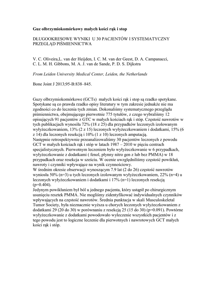 Guz olbrzymiokomórkowy małych kości rąk i stop DŁUGOOKRESOWE WYNIKI U 30 PACJENTÓW I SYSTEMATYCZNY PRZEGLĄD PIŚMIENNICTWA V. C. Oliveira,L. van der Heijden, I. C. M. van der Geest, D. A. Campanacci, C. L. M. H. Gibbons, M. A. J. van de Sande, P. D. S. Dijkstra From Leiden University Medical Center, Leiden, the Netherlands Bone Joint J 2013;95-B:838–845. Guzy olbrzymiokomórkowe (GCTs) małych kości rąk i stop są rzadko spotykane. Spotykane są co prawda rzadko opisy literatury w tym zakresie jednakże nie ma zgodności co do leczenia tych zmian. Dokonaliśmy systematycznego przeglądu piśmiennictwa, obejmującego pierwotnie 775 tytułów, z czego wybraliśmy 12 opisujących 91 pacjentów z GTC w małych kościach rąk i stóp. Częstość nawrotów w tych publikacjach wynosiła 72% (18 z 25) dla przypadków leczonych izolowanym wyłyżeczkowaniem, 13% (2 z 15) leczonych wyłyżeczkowaniem i dodatkami, 15% (6 z 14) dla leczonych resekcją i 10% (1 z 10) leczonych amputacją. Następnie retrospektywnie przeanalizowaliśmy 30 pacjentów leczonych z powodu GCT w małych kościach rąk i stóp w latach 1987 – 2010 w pięciu centrach specjalistycznych. Pierwotnym leczeniem było wyłyżeczkowanie w 6 przypadkach, wyłyżeczkowanie z dodatkami ( fenol, płynny nitro gen z lub bez PMMA) w 18 przypadkach oraz resekcja w sześciu. W ocenie uwzględniliśmy częstość powikłań, nawroty i czynniki wpływające na wynik czynnościowy. W średnim okresie obserwacji wynoszącym 7.9 lat (2 do 26) częstość nawrotów wyniosła 50% (n=3) u tych leczonych izolowanym wyłyżeczkowaniem, 22% (n=4) u leczonych wyłyżeczkowaniem i dodatkami i 17% (n=1) leczonych resekcją (p=0.404). Jedynym powikłaniem był ból u jednego pacjenta, który ustąpił po chirurgicznym usunięciu resztek PMMA. Nie mogliśmy zidentyfikować indywidualnych czynników wpływających na częstość nawrotów. Średnia punktacja w skali Musculoskeletal Tumor Society, była nieznacznie wyższa u chorych leczonych wyłyżeczkowaniem z dodatkami 29 (20 do 30) w porównaniu z resekcją 25 (15 do 30) (p=0.091). Powtórne wyłyżeczkowanie z dodatkami powodowało wyleczenie wszystkich pacjentów i z tego powodu jest to logiczne leczenie dla pierwotnych i nawrotowych GCT małych kości rąk i stóp.