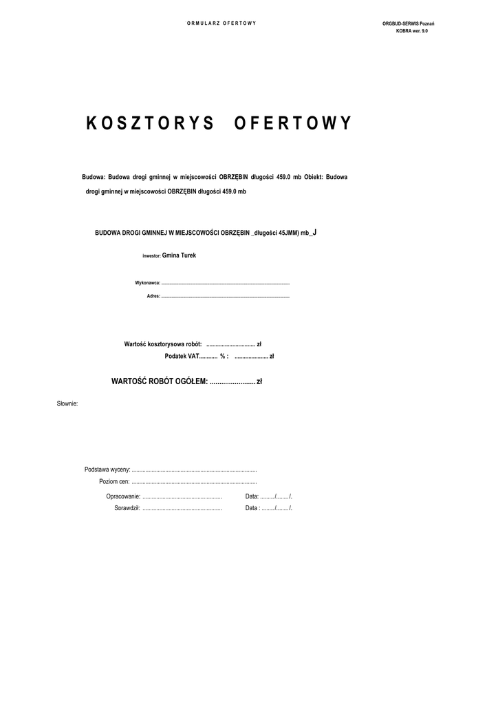 FORMULARZ OFERTOWY KOSZTORYS OFERTOWY Budowa: Budowa drogi gminnej w miejscowości OBRZĘBIN długości 459.0 mb Obiekt: Budowa drogi gminnej w miejscowości OBRZĘBIN długości 459.0 mb BUDOWA DROGI GMINNEJ W MIEJSCOWOŚCI OBRZĘBIN _długości 45JMM) mb_J inwestor: Gmina Turek Wykonawca: ................................................................................................................ Adres: ................................................................................................................ Wartość kosztorysowa robót: ................................ zł Podatek VAT............ % : ...................... zł WARTOŚĆ ROBÓT OGÓŁEM: ........................ zł Słownie: Podstawa wyceny: .................................................................................. Poziom cen: .................................................................................. Opracowanie: .................................................... Data: ......... /........ /. Sprawdził: .................................................... Data : ........ /........ /. ORGBUD-SERWIS Poznań KOBRA wer. 9.0 BUDOWA DROGI GMINNEJ W MIEJSCOWOŚCI OBRZĘBIN długości: 459.00 mb Budowa drogi gminnej w miejscowości OBRZĘBIN długości 459.0 mb Obiekt: Budowa drogi gminnej w miejscowości OBRZĘBIN długości 459.0 mb Budowa: Str: 1 Data: 2009-04-22 TABELA ELEMENTÓW SCALONYCH Opis pozycji tabeli a I. ROBOTY PRZYGOTOWAWCZE CPV 45100000-8 j Wartość [zt] ........... b II. ROBOTY ZIEMNE CPV 45112100-6 c III. BUDOWA STUDNI CHŁONNYCH CPV 45232453-2 ........... d IV. BUDOWA ŚCIEKÓW I OPORNIKA CPV 45233140-2 ........... e V. PODBUDOWA CPV 45233220-7 ........... f VI. NAWIERZCHNIA CPV 45233220-7 ........... g VII. OZNAKOWANIE CPV 45233290-8 ........... h VIII. INWENTARYZACJA CPV 452100000-8 ........... Razem: ........... KOSZTORYSOWA WARTOŚĆ ROBÓT: ........... BUDOWA DROGI GMINNEJ W MIEJSCOWOŚCI OBRZĘBIN długości 459.00 mb Budowa drogi gminnej w miejscowości OBRZĘBIN długości 459.0 mb Obiekt: Budowa drogi gminnej w miejscowości OBRZĘBIN długości 459.0 mb Budowa : KOSZTORYS Data: 2009-04-22 Podstawa kalkulacji / Opis pozycji Lp. OFERTOWY Ilość J.m. Str: Cena jednostkowa a. I. ROBOTY PRZYGOTOWAWCZE CPV 45100000-8 1. KNNR 001-0111-01-00 MRRiB 0,459 km Roboty pomiarowe przy liniowych robotach ziemnych (drogach), w terenie: równinnym 459 Numer specyfikacji: D-01.01.01 2. KNNR 001-0101-06-00 MRRiB 10,000 szt Mechaniczne ścinanie drzew, z karczowaniem pni, o średnicy: 56-65 cm Numer specyfikacji: D-01.02.01 3. KNNR 001-0101-03-00 MRRiB 2,000 szt Mechaniczne ścinanie drzew, z karczowaniem pni, o średnicy: 26-35 cm Numer specyfikacji: D-01.02.01 4. KNNR 001-0107-01-00 MRRiB 3,600 mp Transport na odległość do 2 km - dtużyc Uwaga: skrót jednostki miary "mp" oznacza - metr przestrzenny Numer specyfikacji: D-01.02.01 5. KNNR 001-0202-04-00 MRRiB 11,000 m3 Roboty ziemne wykonywane koparkami podsiębiernymi, z transportem urobku samochodami samowyładowczymi na odległość do 1 km, przy pojemności łyżki koparki: 0,25 m3 /grunt kat. I Zasypywanie wykopów po karczowaniu pni Numer specyfikacji: D-02.00.01.D-02.01.01 6. Analiza własna 10,000 m Cięcie piłą nawierzchni bitumicznych na głębokość do 4 cm Numer specyfikacji: D-05.03.05 b. II. ROBOTY ZIEMNE CPV 45112100-6 7. KNR 201-0126-01-00 IZOiEPB ORGBUD W-wa 1 606,000 m2 Usunięcie warstwy ziemi urodzajnej /humusu/ za pomocą spycharek, przy grubości warstwy: do 15 cm z załadunkiem i odwozem 459 x 3.5 Numer specyfikacji: D-01.02.02 8. KNNR 001-0202-04-00 MRRiB 804,000 m3 Roboty ziemne wykonywane koparkami podsiębiernymi, z transportem urobku samochodami samowyładowczymi na odległość do 1 km, przy pojemności łyżki koparki: 0,25 m3 /grunt kat. III. wykopy pod ścieki i obrzeża -242 wykopy pod przepust i studnie chłonne 22+242+540= Numer specyfikacji: D-02.00.01, D-02.01.01 9. KNNR 001-0202-07-20 MRRiB 677,000 m3 Nasypy dla wykonania korony drogi z piasku średniego , roboty ziemne wykonywane koparkami podsiębiernymi, z transportem urobku samochodami samowyładowczymi na odległość do 1 km, przy pojemności łyżki koparki: 0,60 m3 / grunt kat. I-II i samochód 10-151/ Numer specyfikacji: D-02.00.01, D-02.01.01 10. KNNR 001-0407-01-40 MRRiB 677,000 m3 .............. Formowanie nasypów o wys.do 3,0 m, warstwami o grub. 20 cm, w gruncie kat. I-II, spycharkami: 110 kW (150 KM) Iz zagęszczaniem/ Numer specyfikacji: D-02.03.01 11. KNNR 001-0218-02-00 MRRiB 363,000 m3 Mechaniczne plantowanie terenu i przygotowanie podłoża spycharkami gąsienicowymi o mocy: 74 kW (100 KM) - grunt kat. III-IV Numer specyfikacji: D-02.03.01 Wartość [ zł ] 1 FORMULARZ OFERTOWY ORGBUD-SERWISPoznań KOBRA wer. 9.0 BUDOWA DROGI GMINNEJ W MIEJSCOWOŚCI OBRZĘBIN długości 459.00 mb Lp. Data: 2009-04-22 2 b. II. ROBOTY ZIEMNE CPV 45112100-6 Podstawa kalkulacji / Opis pozycji Str: j Ilość J.m. Cena jednostkowa c. III. BUDOWA STUDNI CHŁONNYCH CPV 45232453-2 12. KNNR 006-0604-04-00 MRRiB 2,000 szt ............ Studnie chłonne z kręgów żelbetowych wypełnionych materiałami odsączającymi, przy średnicy kręgów 1,0 m i głębokości studni 3,0 m Numer specyfikacji: D-03.01.01 d. IV. BUDOWA ŚCIEKÓW I OPORNIKA CPV 45233140-2 13. KNNR 006-0605-02-00 MRRiB 50,000 m3 Ławy fundamentowe pod ściek i obrzeża z betonu B20, gr 22 cm Numer specyfikacji: D-08.05.00 14. KNNR 006-0606-03-00 MRRiB 960,000 m Ścieki z elementów betonowych układanych na podsypce cem.-piask. przy grubości prefabrykatów 8cm. Ściek z dwóch rzędów kostki brukowej na podsypce cementowo-piaskowej 918 +62-20= Numer specyfikacji: D-0.8.05.00 15. KNNR 006-0404-05-00 MRRiB 960,000 m ................ Obrzeża betonowe na podsypce cementowo-piaskowej, z wypełnieniem spoin zaprawą cementową i wymiarach obrzeża 30x8 cm Numer specyfikacji: D-08.04.01, D-08.03.01 e. V. PODBUDOWA CPV 45233220-7 Numer specyfikacji: d-08.03.01 16. KNNR 006-0103-03-00 MRRiB 