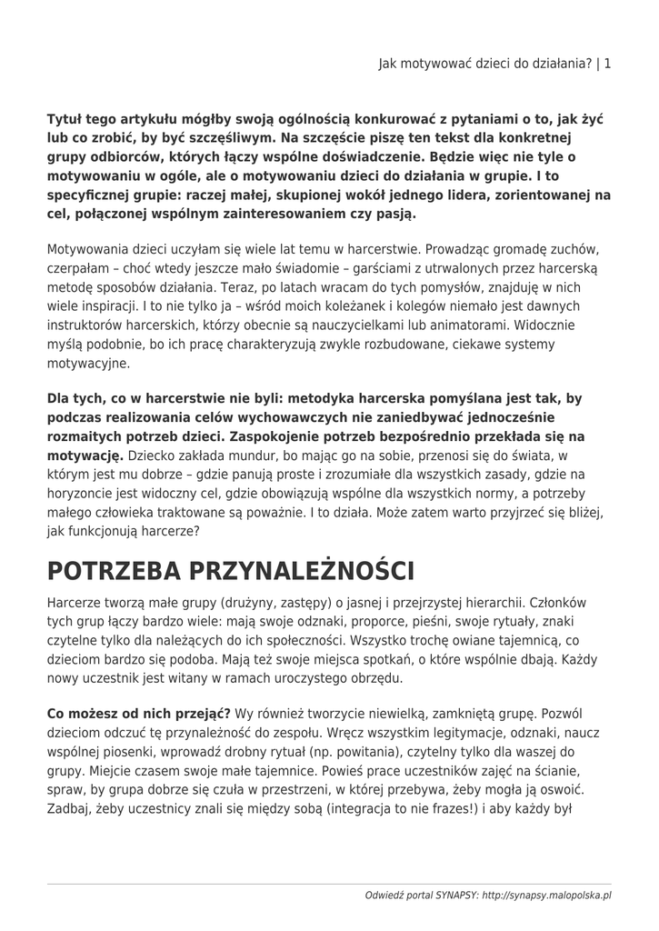 Jak motywować dzieci do działania? | 1 Tytuł tego artykułu mógłby swoją ogólnością konkurować z pytaniami o to, jak żyć lub co zrobić, by być szczęśliwym. Na szczęście piszę ten tekst dla konkretnej grupy odbiorców, których łączy wspólne doświadczenie. Będzie więc nie tyle o motywowaniu w ogóle, ale o motywowaniu dzieci do działania w grupie. I to specyficznej grupie: raczej małej, skupionej wokół jednego lidera, zorientowanej na cel, połączonej wspólnym zainteresowaniem czy pasją. Motywowania dzieci uczyłam się wiele lat temu w harcerstwie. Prowadząc gromadę zuchów, czerpałam – choć wtedy jeszcze mało świadomie – garściami z utrwalonych przez harcerską metodę sposobów działania. Teraz, po latach wracam do tych pomysłów, znajduję w nich wiele inspiracji. I to nie tylko ja – wśród moich koleżanek i kolegów niemało jest dawnych instruktorów harcerskich, którzy obecnie są nauczycielkami lub animatorami. Widocznie myślą podobnie, bo ich pracę charakteryzują zwykle rozbudowane, ciekawe systemy motywacyjne. Dla tych, co w harcerstwie nie byli: metodyka harcerska pomyślana jest tak, by podczas realizowania celów wychowawczych nie zaniedbywać jednocześnie rozmaitych potrzeb dzieci. Zaspokojenie potrzeb bezpośrednio przekłada się na motywację. Dziecko zakłada mundur, bo mając go na sobie, przenosi się do świata, w którym jest mu dobrze – gdzie panują proste i zrozumiałe dla wszystkich zasady, gdzie na horyzoncie jest widoczny cel, gdzie obowiązują wspólne dla wszystkich normy, a potrzeby małego człowieka traktowane są poważnie. I to działa. Może zatem warto przyjrzeć się bliżej, jak funkcjonują harcerze? POTRZEBA PRZYNALEŻNOŚCI Harcerze tworzą małe grupy (drużyny, zastępy) o jasnej i przejrzystej hierarchii. Członków tych grup łączy bardzo wiele: mają swoje odznaki, proporce, pieśni, swoje rytuały, znaki czytelne tylko dla należących do ich społeczności. Wszystko trochę owiane tajemnicą, co dzieciom bardzo się podoba. Mają też swoje miejsca spotkań, o które wspólnie dbają. Każdy nowy uczestnik jest witany w ramach uroczystego obrzędu. Co możesz od nich przejąć? Wy również tworzycie niewielką, zamkniętą grupę. Pozwól dzieciom odczuć tę przynależność do zespołu. Wręcz wszystkim legitymacje, odznaki, naucz wspólnej piosenki, wprowadź drobny rytuał (np. powitania), czytelny tylko dla waszej do grupy. Miejcie czasem swoje małe tajemnice. Powieś prace uczestników zajęć na ścianie, spraw, by grupa dobrze się czuła w przestrzeni, w której przebywa, żeby mogła ją oswoić. Zadbaj, żeby uczestnicy znali się między sobą (integracja to nie frazes!) i aby każdy był Odwiedź portal SYNAPSY: http://synapsy.malopolska.pl Jak motywować dzieci do działania? | 2 równo traktowany. Reaguj, kiedy ktoś jest przez innych wykluczany, zakrzykiwany, spychany na margines. Jak najwięcej spraw rozwiązujcie na forum, zachęcaj całą grupę do przedyskutowywania konfliktów czy rozwiązywania trudnych sytuacji, ale i celebrowania sukcesów. POTRZEBA BEZPIECZEŃSTWA Struktura, a także zestaw norm uznawanych w grupie, czyli Prawo Harcerskie, to sposób harcerzy na zapewnianie poczucia bezpieczeństwa. Choć tyle się dzieje, a każda zbiórka jest inna, pewne podstawy są niezmienne i dla każdego przewidywalne – harcerz wie, czego się może spodziewać, wie też, jakie zachowania będą akceptowane i doceniane, a jakie niemile widziane. Co możesz wykorzystać? Zadbaj, by każdy członek twojej grupy czuł się bezpiecznie nie tylko w sensie dosłownym: żeby każdy znał zasady i wiedział, że są one po to, by chronić jego interes. Że cokolwiek się nie stanie, może oczekiwać szacunku, wsparcia, prawa do obrony i do zachowania swojego zdania. Ustalajcie zasady wspólnie, pozwól dzieciom powiedzieć, co z punktu bezpieczeństwa jest dla nich ważne, i traktuj to serio, nawet jeśli w twoich kategoriach to sprawy mało istotne. Nie musi to mieć formy sztywnej jak dekalog, ale niech będzie trwałe i dla wszystkich ważne – może podpiszcie się pod zasadami i powieście je w widocznym miejscu? POTRZEBA INDYWIDUALNEGO TRAKTOWANIA Harcerze zdobywają też różne sprawności indywidualnie. Co istotne, każdy może wybrać, na czym się skupić. Daje to możliwość rozwijania się we własnym tempie i w tych obszarach, które są danej osobie bliskie, ciekawe. Zdobycie każdej sprawności wiąże się z wykonaniem konkretnych działań. Jedni robią pewne rzeczy w mig, inni daną umiejętność doskonalą przez kilka tygodni. I w niczym to sobie nie przeszkadza. Po prostu, znając listę zadań, każdy harcerz samodzielnie ustala sobie plan działania. Starsi planują w ten sposób długie, skomplikowane (np. roczne) ścieżki rozwoju, jak zdobywanie stopni. Młodsi potrzebują większego konkretu i działań krótkoetapowych. Sprawności są ważne, ale nie powinny stać się elementem rywalizacji pomiędzy harcerzami. Nie chodzi o zawody w tym, kto zdobył ich najwięcej. Liczy się to, by każdy miał poczucie, że się rozwija. Ponieważ odznaki sprawności przyszywa się na rękawach, każdy może zwizualizować sobie ten rozwój, obserwując coraz mniejsze połacie zieleni na swoim Odwiedź portal SYNAPSY: http://synapsy.malopolska.pl Jak motywować dzieci do działania? | 3 mundurze. Jak to się ma do twojej pracy? Zadbaj o różnorodność waszych aktywności, nie działajcie tylko w jednym obszarze. O ile to tylko możliwe, daj każdemu prawo do wyboru tego, co dla niego ciekawe i rozwojowe. Nie traktuj wszystkich według jednego schematu, nie zakładaj na przykład, że dla każdego dziecka występ na scenie jest przyjemnością. Pomyśl także, że osiąganie celów nie dla wszystkich będzie przebiegać w jednakowym tempie. Pozwól każdemu rozwijać się po swojemu, ale też odczuwać, że posuwa się do przodu, a ty to zauważasz. Da