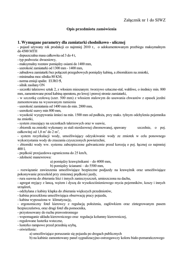 Załącznik nr 1 do SIWZ Opis przedmiotu zamówienia 1. Wymagane parametry dla zamiatarki chodnikowo - ulicznej - pojazd używany rok produkcji co najmniej 2010 r., o udokumentowanym przebiegu maksymalnym do 4500 MTH - dopuszczalna masa całkowita od 3 do 4 t, - typ podwozia: dwuosiowy, - maksymalny rozstaw pomiędzy osiami do 1400 mm, - szerokość zamiatarki od 1300 mm - 1400 mm, - zabudowa zamiatarki bez połączeń przegubowych pomiędzy kabiną, a zbiornikiem na zmiotki, - minimalna moc silnika 80 KM, - norma emisji spalin: EURO 5, - silnik zasilany ON - szczotki talerzowe sztuk 2, z włosiem mieszanym: tworzywo sztuczne-stal, wahliwe, o średnicy min. 800 mm, zamontowane przed kabiną operatora, po lewej i prawej stronie zamiatarki, - w szczotkę czołową (szer. 500 mm) z włosiem stalowym do usuwania chwastów z opasek jezdni zamontowana na wysuwanym ramieniu - szerokość zamiatania od 1400 mm do min. 2800 mm, - szerokość ssawy min 800 mm, - wysokość wysypywania śmieci na min. 1500 mm od podłoża, przy maks. tylnym odchyleniu pojemnika na zmiotki, - system zraszający na szczotkach talerzowych oraz w ssawie, - zbiornik na zmiotki wykonany ze stali nierdzewnej chromowanej, spawany szczelnie, o poj. 3 3 całkowitej od 1,8 m do 2 m , - system recyrkulacji wody, umożliwiający odzyskiwanie wody ze zmiotek w celu ponownego wykorzystania wody do zraszania czyszczonych powierzchni, - zbiorniki wody ww. systemu zabezpieczone galwanicznie przed korozją o poj. łącznej co najmniej 400 l, - prędkość przejazdowa ograniczona do 25 km/h, - zdolność manewrowa: a) pomiędzy krawężnikami – do 4000 mm, b) pomiędzy ścianami – do 5500 mm, - rozwiązanie zawieszenia umożliwiające bezpieczne podjazdy na krawężnik oraz umożliwiające pokonywanie przeszkód przy zmiennej prędkości jazdy, - rura ssawna do zbierania liści i innych zanieczyszczeń, umieszczona na dachu, - agregat myjący z lancą, wężem i dyszą do wysokociśnieniowego mycia pojemników, koszy i innych urządzeń, - odchylana z kabiny klapka do zbierania większych przedmiotów, - kabina przeszklona umożliwiająca obserwację pracy pojazdu, - kabina wyposażona w klimatyzację, - ergonomiczny fotel kierowcy z regulacją położenia, zagłówkiem oraz zintegrowanym pasem bezpieczeństwa, oraz drugi fotel dla pomocnika, - przystosowany do ruchu prawostronnego - wspomaganie układu kierowniczego oraz regulacja kolumny kierowniczej, - regulowane lusterka wsteczne, - lusterko rampowe przed przednią szybą, - oświetlenie: a) umożliwiające poruszanie się pojazdu po drogach publicznych b) na kabinie zamontowany panel sygnalizacyjno-ostrzegawczy koloru biało-pomarańczowego - kamera umieszczona z tyłu pojazdu, wraz z monitorem w kabinie, - zalegalizowany tachograf cyfrowy - sygnalizacja wizualna i akustyczna biegu wstecznego, - radio samochodowe wraz z anteną i głośnikami, - poziom hałasu w kabinie podczas pracy pojazdu: nie przekraczający 80 dB, - certyfikat CE, zgodnie z § 48 ust.1. i § 49 Rozporządzenia Ministra Gospodarki z dnia 20 grudnia 2005 r. w sprawie zasadniczych wymagań dla maszyn i elementów bezpieczeństwa (Dz. U. Nr 259, poz. 2170). - instrukcja obsługi w języku polskim, - katalog części zamiennych. - Wykonawca w ramach przekazania przedmiotu zamówienia przeszkoli osoby wskazane przez zamawiającego do obsługi zamiatarki, - pojazd wyposażony będzie system GPS monitorujący trasę pojazdu z rejestracją pracy szczotek - pojazd musi posiadać aktualne udokumentowane przeglądy serwisowe 2. Wymagane parametry dla kompletnej zamiatarki ulicznej 2.1. Podwozie: - samochód ciężarowy na podwoziu dwuosiowym rok produkcji co najmniej 2010 r., przystosowany do ruchu prawostronnego, o udokumentowanym maksymalnym przebiegu do 45000 km - Pojazd musi spełniać warunki zawarte w Rozporządzeniu Ministra Infrastruktury z dnia 31.12.2002 roku w sprawie warunków technicznych pojazdów oraz zakresu ich niezbędnego wyposażenia ( Dz. U z 2003r. nr 32 poz. 262 ze poz. zm.) - dopuszczalna masa całkowita (DMC) od 13 do 15 t, - silnik wysokoprężny o mocy min. 170 KM spełniający wymogi emisji spalin EURO 5, potwierdzone w homologacji podwozia lub odrębnym dokumentem, - skrzynia biegów manualna wielozakresowa, z biegiem pełzającym z sygnalizacją zewnętrzną (wizualną i akustyczną) biegu wstecznego, - rozstaw osi 3200 mm – 3300 mm, - ogumienie o rozmiarze R 19,5 - przednie zawieszenie na resorach parabolicznych, - tylne zawieszenie na resorach asymetrycznych, - blokada mechanizmu różnicowego, - wspomaganie układu kierowniczego, - dwuobwodowy układ hamulcowy, wyposażony w ABS, tarczowy w osi przedniej i tylnej, - filtr powietrza z wlotem na dachu kabiny, - układ wydechowy z rurą wydechowa skierowaną do góry, umieszczoną za kabiną, - zderzak przedni metalowy, - kabina koloru białego, dzienna, dwuosobowa, klimatyzowana, - szyba przednia przyciemniona elektrycznie podgrzewana, - elektrycznie sterowane i podgrzewane lusterka główne, - szyby boczne sterowane elektrycznie, - regulator prędkości (Tempomat), - zabezpieczenie zapłonu silnika typu immobilaiser, - zalegalizowany tachograf cyfrowy - układ paliwowy przystosowany do pracy w temperaturach spadających poniżej 18˚C, - komputer pokładowy informujący min. o zużyciu paliwa, ewentualnych usterkach, przeglądach okresowych z menu w języku polskim, - oświetlenie: a) umożliwiające poruszanie się pojazdu po drogach publicznych b) na kabinie zamontowany panel sygnalizacyjno-ostrzegawczy koloru biało-pomarańczowego - wskaźnik ciśnienia w ogumieniu umieszczony na desce rozdzielczej, - regulowana w dwóch płaszczyznach kolumna kierownicy, - radio samochodowe wraz z anteną i głośnikami, 2.2. Zabudowa zamiatarki rok produkcji co najmniej 2010, o udokumentowanym przebiegu max. do 5000 MTH. napędzana od własnego silnika o mocy min. 140 KM, spełniający normy emisji spalin min. EURO 3A, przeniesienie napędu na