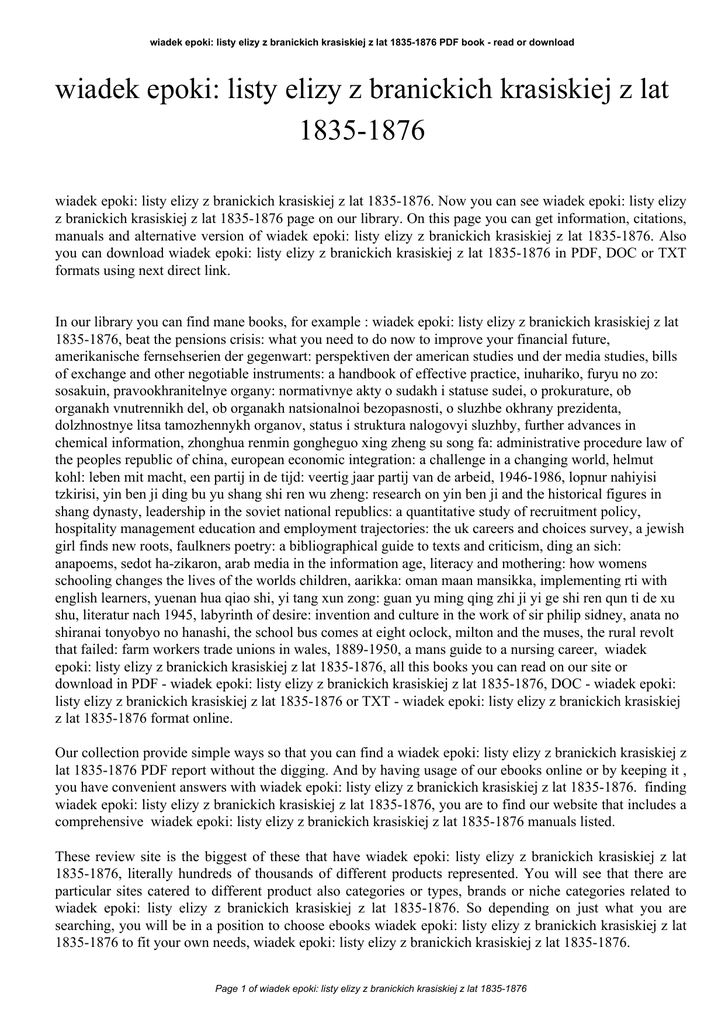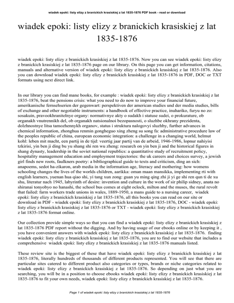 wiadek epoki: listy elizy z branickich krasiskiej z lat 1835-1876 PDF book - read or download wiadek epoki: listy elizy z branickich krasiskiej z lat 1835-1876 wiadek epoki: listy elizy z branickich krasiskiej z lat 1835-1876. Now you can see wiadek epoki: listy elizy z branickich krasiskiej z lat 1835-1876 page on our library. On this page you can get information, citations, manuals and alternative version of wiadek epoki: listy elizy z branickich krasiskiej z lat 1835-1876. Also you can download wiadek epoki: listy elizy z branickich krasiskiej z lat 1835-1876 in PDF, DOC or TXT formats using next direct link. In our library you can find mane books, for example : wiadek epoki: listy elizy z branickich krasiskiej z lat 1835-1876, beat the pensions crisis: what you need to do now to improve your financial future, amerikanische fernsehserien der gegenwart: perspektiven der american studies und der media studies, bills of exchange and other negotiable instruments: a handbook of effective practice, inuhariko, furyu no zo: sosakuin, pravookhranitelnye organy: normativnye akty o sudakh i statuse sudei, o prokurature, ob organakh vnutrennikh del, ob organakh natsionalnoi bezopasnosti, o sluzhbe okhrany prezidenta, dolzhnostnye litsa tamozhennykh organov, status i struktura nalogovyi sluzhby, further advances in chemical information, zhonghua renmin gongheguo xing zheng su song fa: administrative procedure law of the peoples republic of china, european economic integration: a challenge in a changing world, helmut kohl: leben mit macht, een partij in de tijd: veertig jaar partij van de arbeid, 1946-1986, lopnur nahiyisi tzkirisi, yin ben ji ding bu yu shang shi ren wu zheng: research on yin ben ji and the historical figures in shang dynasty, leadership in the soviet national republics: a quantitative study of recruitment policy, hospitality management education and employment trajectories: the uk careers and choices survey, a jewish girl finds new roots, faulkners poetry: a bibliographical guide to texts and criticism, ding an sich: anapoems, sedot ha-zikaron, arab media in the information age, literacy and mothering: how womens schooling changes the lives of the worlds children, aarikka: oman maan mansikka, implementing rti with english learners, yuenan hua qiao shi, yi tang xun zong: guan yu ming qing zhi ji yi ge shi ren qun ti de xu shu, literatur nach 1945, labyrinth of desire: invention and culture in the work of sir philip sidney, anata no shiranai tonyobyo no hanashi, the school bus comes at eight oclock, milton and the muses, the rural revolt that failed: farm workers trade unions in wales, 1889-1950, a mans guide to a nursing career, wiadek epoki: listy elizy z branickich krasiskiej z lat 1835-1876, all this books you can read on our site or download in PDF - wiadek epoki: listy elizy z branickich krasiskiej z lat 1835-1876, DOC - wiadek epoki: listy elizy z branickich krasiskiej z lat 1835-1876 or TXT - wiadek epoki: listy elizy z branickich krasiskiej z lat 1835-1876 format online. Our collection provide simple ways so that you can find a wiadek epoki: listy elizy z branickich krasiskiej z lat 1835-1876 PDF report without the digging. And by having usage of our ebooks online or by keeping it , you have convenient answers with wiadek epoki: listy elizy z branickich krasiskiej z lat 1835-1876. finding wiadek epoki: listy elizy z branickich krasiskiej z lat 1835-1876, you are to find our website that includes a comprehensive wiadek epoki: listy elizy z branickich krasiskiej z lat 1835-1876 manuals listed. These review site is the biggest of these that have wiadek epoki: listy elizy z branickich krasiskiej z lat 1835-1876, literally hundreds of thousands of different products represented. You will see that there are particular sites catered to different product also categories or types, brands or niche categories related to wiadek epoki: listy elizy z branickich krasiskiej z lat 1835-1876. So depending on just what you are searching, you will be in a position to choose ebooks wiadek epoki: listy elizy z branickich krasiskiej z lat 1835-1876 to fit your own needs, wiadek epoki: listy elizy z branickich krasiskiej z lat 1835-1876. Page 1 of wiadek epoki: listy elizy z branickich krasiskiej z lat 1835-1876