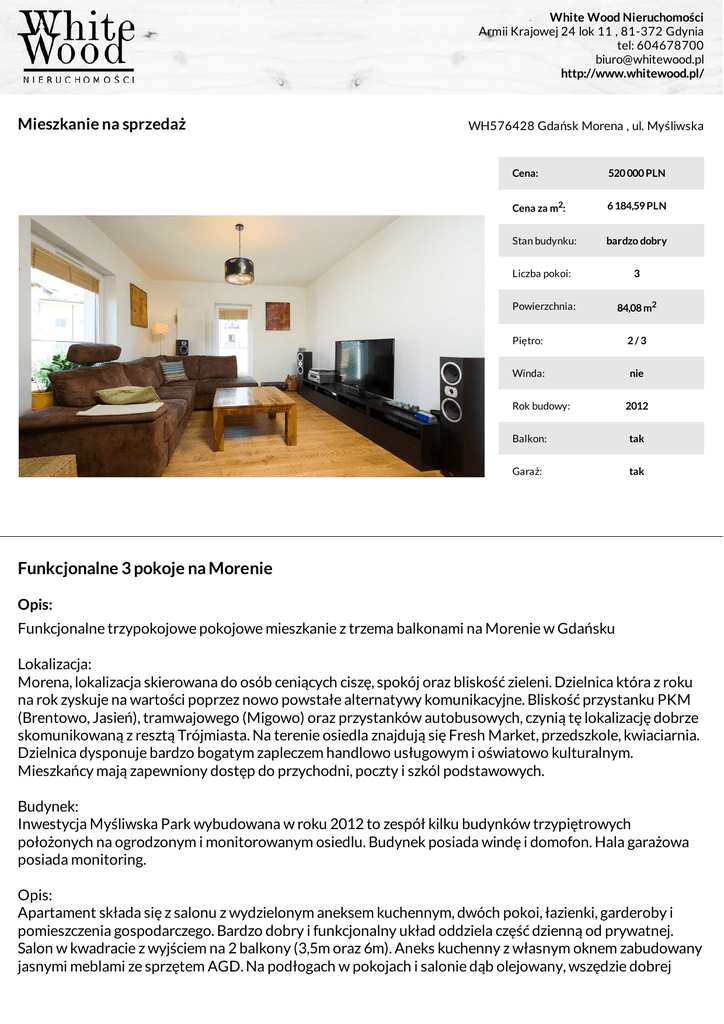 White Wood Nieruchomości Armii Krajowej 24 lok 11 , 81-372 Gdynia tel: 604678700 [email protected] http://www.whitewood.pl/ Mieszkanie na sprzedaż WH576428 Gdańsk Morena , ul. Myśliwska Cena: 520 000 PLN Cena za m2: 6 184,59 PLN Stan budynku: bardzo dobry Liczba pokoi: 3 Powierzchnia: 84,08 m2 Piętro: 2/3 Winda: nie Rok budowy: 2012 Balkon: tak Garaż: tak Funkcjonalne 3 pokoje na Morenie Opis: Funkcjonalne trzypokojowe pokojowe mieszkanie z trzema balkonami na Morenie w Gdańsku Lokalizacja: Morena, lokalizacja skierowana do osób ceniących ciszę, spokój oraz bliskość zieleni. Dzielnica która z roku na rok zyskuje na wartości poprzez nowo powstałe alternatywy komunikacyjne. Bliskość przystanku PKM (Brentowo, Jasień), tramwajowego (Migowo) oraz przystanków autobusowych, czynią tę lokalizację dobrze skomunikowaną z resztą Trójmiasta. Na terenie osiedla znajdują się Fresh Market, przedszkole, kwiaciarnia. Dzielnica dysponuje bardzo bogatym zapleczem handlowo usługowym i oświatowo kulturalnym. Mieszkańcy mają zapewniony dostęp do przychodni, poczty i szkól podstawowych. Budynek: Inwestycja Myśliwska Park wybudowana w roku 2012 to zespół kilku budynków trzypiętrowych położonych na ogrodzonym i monitorowanym osiedlu. Budynek posiada windę i domofon. Hala garażowa posiada monitoring. Opis: Apartament składa się z salonu z wydzielonym aneksem kuchennym, dwóch pokoi, łazienki, garderoby i pomieszczenia gospodarczego. Bardzo dobry i funkcjonalny układ oddziela część dzienną od prywatnej. Salon w kwadracie z wyjściem na 2 balkony (3,5m oraz 6m). Aneks kuchenny z własnym oknem zabudowany jasnymi meblami ze sprzętem AGD. Na podłogach w pokojach i salonie dąb olejowany, wszędzie dobrej White Wood Nieruchomości Armii Krajowej 24 lok 11 , 81-372 Gdynia tel: 604678700 [email protected] http://www.whitewood.pl/ jakości drzwi firmy Porta. Pierwszy pokój pełniący obecnie funkcje sypialną jest w kwadracie i mieści duże łóżko oraz komodę. Z tego pokoju można wyjść na trzeci balkon (3,5m). Drugi pokój nieco mniejszy od poprzedniego pełni rolę gościnnego. Łazienka z wanną w jasnych kolorach jest duża i wygodna. Pomieszczenie gospodarcze pełniące obecnie funkcję pralni można łatwo przerobić na drugą łazienkę. Z całą pewnością oprócz wc zmieści się tutaj prysznic. Mieszkanie idealne dla rodziny. Jest możliwość wydzielenia 4pokoju. Niezależne ogrzewanie. Do mieszkania przynależą 2 miejsca w hali garażowej (platforma) dodatkowo płatne 20 000PLN. Zapraszam do oglądania Marlena Kurczewska Tel: 606 546 246 Marlena Kurczewska +48-606-546-246 White Wood Nieruchomości Marlena Kurczewska Armii Krajowej 24 lok 11 , 81-372 Gdynia +48-606-546-246 [email protected] http://www.whitewood.pl/