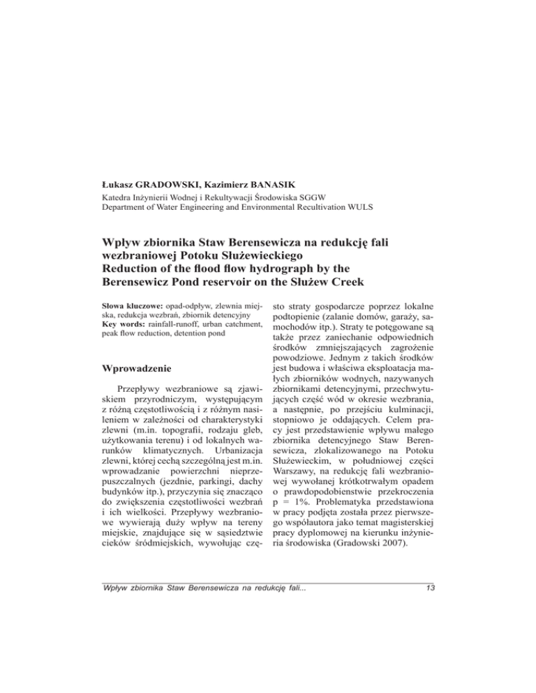 Łukasz GRADOWSKI, Kazimierz BANASIK Katedra Inżynierii Wodnej i Rekultywacji Środowiska SGGW Department of Water Engineering and Environmental Recultivation WULS Wpływ zbiornika Staw Berensewicza na redukcję fali wezbraniowej Potoku Służewieckiego Reduction of the flood flow hydrograph by the Berensewicz Pond reservoir on the Służew Creek Słowa kluczowe: opad-odpływ, zlewnia miejska, redukcja wezbrań, zbiornik detencyjny Key words: rainfall-runoff, urban catchment, peak flow reduction, detention pond Wprowadzenie Przepływy wezbraniowe są zjawiskiem przyrodniczym, występującym z różną częstotliwością i z różnym nasileniem w zależności od charakterystyki zlewni (m.in. topografii, rodzaju gleb, użytkowania terenu) i od lokalnych warunków klimatycznych. Urbanizacja zlewni, której cechą szczególną jest m.in. wprowadzanie powierzchni nieprzepuszczalnych (jezdnie, parkingi, dachy budynków itp.), przyczynia się znacząco do zwiększenia częstotliwości wezbrań i ich wielkości. Przepływy wezbraniowe wywierają duży wpływ na tereny miejskie, znajdujące się w sąsiedztwie cieków śródmiejskich, wywołując czę- sto straty gospodarcze poprzez lokalne podtopienie (zalanie domów, garaży, samochodów itp.). Straty te potęgowane są także przez zaniechanie odpowiednich środków zmniejszających zagrożenie powodziowe. Jednym z takich środków jest budowa i właściwa eksploatacja małych zbiorników wodnych, nazywanych zbiornikami detencyjnymi, przechwytujących część wód w okresie wezbrania, a następnie, po przejściu kulminacji, stopniowo je oddających. Celem pracy jest przedstawienie wpływu małego zbiornika detencyjnego Staw Berensewicza, zlokalizowanego na Potoku Służewieckim, w południowej części Warszawy, na redukcję fali wezbraniowej wywołanej krótkotrwałym opadem o prawdopodobienstwie przekroczenia p = 1%. Problematyka przedstawiona w pracy podjęta została przez pierwszego współautora jako temat magisterskiej pracy dyplomowej na kierunku inżynieria środowiska (Gradowski 2007). Wpływ zbiornika Staw Berensewicza na redukcję fali... 13 Opis obiektu badań Zlewnia Potoku Służewieckiego Jest ona położona w dorzeczu Wisły i znajduje się w południowej części Warszawy na terenie dzielnic: Ochota, Włochy, Ursynów i Wilanów. Potok Służewiecki rozpoczyna swój bieg w dzielnicy Warszawa Ochota przy alei Krakowskiej. Początkowy odcinek potoku przebiega jako kanał zamknięty do zbiegu ulic Hynka i Radarowej, gdzie dalej płynie jako kanał otwarty do terenu lotniska Okęcie. Pod terenem lotniska przebiega jako kolektor długości około 2,5 km. Wylot znajduje się przy ulicy Wirażowej. Od tego miejsca aż do ujścia do rzeki Wilanówki stanowi koryto otwarte, tylko w nielicznych miejscach przekształca się w kanał zamknięty. Całkowita powierzchnia zlewni Potoku Służewieckiego (do ujścia do Jeziora Wilanowskiego) wynosi 54,8 km2. Całkowita długość potoku jest równa 14,9 km (Operat hydrologiczny..., 2002). Głównymi jego dopływami są rowy otwarte (Rów Grabowski, Rów Wyścigi, Kanał Wolica). Pozostałe dopływy to rowy bez nazwy oraz wyloty kanalizacji deszczowej, odprowadzające wody burzowe z terenów zlewni potoku. Zlewnia Potoku Służewieckiego po profil Staw Berensewicza wynosi 26,9 km2, a długość głównego cieku 7,2 km. Z terenów dzielnic, na których znajduje się zlewnia Potoku Służewieckiego, wody deszczowe odprowadzane są za pomocą kanalizacji deszczowej lub za pomocą rowów melioracyjnych, pełniących funkcje odbiorników wód burzowych. Pierwotnie tereny zlewni Potoku Służewieckiego były użytkowane rolni- 14 czo. Również obecnie na terenach Ursynowa, Grabowa i Kabat znajduje się znaczna część obszarów niezabudowanych. Jednakże wzrastająca liczba ludności Warszawy i zapotrzebowanie na nowe mieszkania i usługi wymusza rozbudowę miasta i pozyskiwanie nowych terenów pod zabudowę (Banasik i in. 2007). Obszar zlewni Potoku Służewieckiego wraz z głównym jego dopływem – Rowem Grabowskim i zaznaczoną granicą zlewni po profil Stawu Berensewicza pokazano na rysunku 1. Staw Berensewicza Jest on położony w zlewni Potoku Służewieckiego w południowo-wschodniej części zabytkowego zespołu dworsko-ogrodowego „Wyczółki” przy ulicy Łączyny. Znajduje się w ciągu układu Potoku Służewieckiego na trasie między ulicą Kłobucką a ulicą Łączyny. Staw jest zasilany wodami z Potoku Służewieckiego i jego głównego dopływu – Rowu Grabowskiego. Staw ten składa się dwóch akwenów – dolnego, większego, i górnego, mniejszego. Staw dolny zlokalizowany jest bliżej ulicy Łączyny. W środku stawu górnego znajduje się wyspa, która w przeszłości była połączona z lądem za pomocą mostu, usytuowanego od strony północnej, po którym zachowały się tylko kamienne przyczółki. W centrum wyspy usytuowana jest murowana piwnica z wejściem od strony wschodniej. Staw Berensewicza został odbudowany w 2004 roku w celu retencjonowania wód z Potoku Służewieckiego w okresie przejścia fali wezbraniowej oraz odtworzenia historycznej kompozycji zespołu dworsko-ogrodowego „Wy- Ł. Gradowski, K. Banasik RYSUNEK 1. Lokalizacja zlewni Potoku Służewieckiego do profilu Staw Berensewicza (Banasik i in. 2007) FIGURE 1. Locality of the upper part of the river catchment of Służew Creek (Banasik et al. 2007) czółki”. W odbudowę Stawu Berensewicza wchodziły następujące prace: wykop namułów, pogłębienie oraz ukształtowanie skarp i wykonanie urządzeń wodnych dla prawidłowej pracy stawu (ujęcie wody na staw i mnich piętrzący wodę w stawie). Grobla ziemna, otaczająca staw dolny, została wyokrąglona i dostosowana do założeń programowo-przestrzennych rewaloryzacji zabytkowego ogrodu dworsko-ogrodowego „Wyczółki”. Linia brzegowa stawu górnego i wyspy pozostały bez zmian, zagospodarowanie terenu również nie zostanie zmienione. 