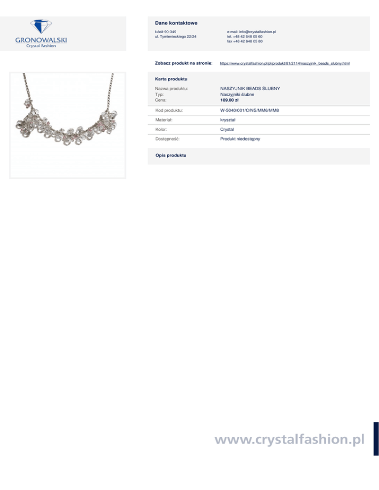 Powered by TCPDF (www.tcpdf.org) Dane kontaktowe Łódź 90-349 ul. Tymienieckiego 22/24 Zobacz produkt na stronie: e-mail: [email protected] tel. +48 42 648 05 60 fax +48 42 648 05 80 https://www.crystalfashion.pl/pl/produkt/81/2114/naszyjnik_beads_slubny.html Karta produktu Nazwa produktu: Typ: Cena: NASZYJNIK BEADS ŚLUBNY Naszyjniki ślubne 189.00 zł Kod produktu: W-5040/001/C/NS/MM6/MM8 Materiał: kryształ Kolor: Crystal Dostępność: Produkt niedostępny Opis produktu