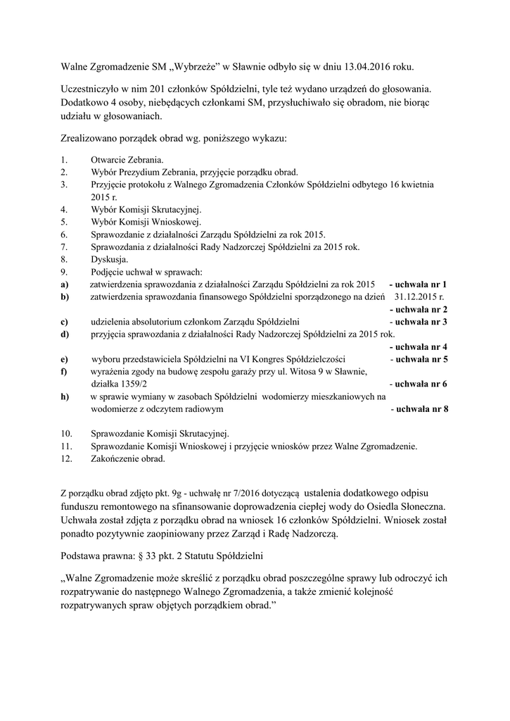 Walne Zgromadzenie SM „Wybrzeże” w Sławnie odbyło się w dniu 13.04.2016 roku. Uczestniczyło w nim 201 członków Spółdzielni, tyle też wydano urządzeń do głosowania. Dodatkowo 4 osoby, niebędących członkami SM, przysłuchiwało się obradom, nie biorąc udziału w głosowaniach. Zrealizowano porządek obrad wg. poniższego wykazu: 1. 2. 3. 4. 5. 6. 7. 8. 9. a) b) c) d) e) f) h) 10. 11. 12. Otwarcie Zebrania. Wybór Prezydium Zebrania, przyjęcie porządku obrad. Przyjęcie protokołu z Walnego Zgromadzenia Członków Spółdzielni odbytego 16 kwietnia 2015 r. Wybór Komisji Skrutacyjnej. Wybór Komisji Wnioskowej. Sprawozdanie z działalności Zarządu Spółdzielni za rok 2015. Sprawozdania z działalności Rady Nadzorczej Spółdzielni za 2015 rok. Dyskusja. Podjęcie uchwał w sprawach: zatwierdzenia sprawozdania z działalności Zarządu Spółdzielni za rok 2015 - uchwała nr 1 zatwierdzenia sprawozdania finansowego Spółdzielni sporządzonego na dzień 31.12.2015 r. - uchwała nr 2 udzielenia absolutorium członkom Zarządu Spółdzielni - uchwała nr 3 przyjęcia sprawozdania z działalności Rady Nadzorczej Spółdzielni za 2015 rok. - uchwała nr 4 wyboru przedstawiciela Spółdzielni na VI Kongres Spółdzielczości - uchwała nr 5 wyrażenia zgody na budowę zespołu garaży przy ul. Witosa 9 w Sławnie, działka 1359/2 - uchwała nr 6 w sprawie wymiany w zasobach Spółdzielni wodomierzy mieszkaniowych na wodomierze z odczytem radiowym - uchwała nr 8 Sprawozdanie Komisji Skrutacyjnej. Sprawozdanie Komisji Wnioskowej i przyjęcie wniosków przez Walne Zgromadzenie. Zakończenie obrad. Z porządku obrad zdjęto pkt. 9g - uchwałę nr 7/2016 dotyczącą ustalenia dodatkowego odpisu funduszu remontowego na sfinansowanie doprowadzenia ciepłej wody do Osiedla Słoneczna. Uchwała został zdjęta z porządku obrad na wniosek 16 członków Spółdzielni. Wniosek został ponadto pozytywnie zaopiniowany przez Zarząd i Radę Nadzorczą. Podstawa prawna: § 33 pkt. 2 Statutu Spółdzielni „Walne Zgromadzenie może skreślić z porządku obrad poszczególne sprawy lub odroczyć ich rozpatrywanie do następnego Walnego Zgromadzenia, a także zmienić kolejność rozpatrywanych spraw objętych porządkiem obrad.” Podczas Walnego Zgromadzenia podęto następujące uchwały: a) Uchwała nr 1/2016 w sprawie zatwierdzenia sprawozdania z działalności Zarządu Spółdzielni na rok 2015: przyjęta 118 głosami, przeciw 11, wstrzymało się od głosu 11 b) Uchwała nr 2/2016 w sprawie zatwierdzenia sprawozdania finansowego Spółdzielni sporządzonego na dzień 31.12.2015 roku: przyjęta 121 głosami, przeciw 6, wstrzymało się od głosu 12 c) Uchwała nr 3/2016 w sprawie udzielenia absolutorium członkom Zarządu Spółdzielni: - Kazimierz Olejniczak: absolutorium udzielone 90 głosami, przeciw 37, wstrzymało się od głosu 11 - Grzegorz Tworek: absolutorium udzielone 101 głosami, przeciw 21, wstrzymało się od głosu 9 d) Uchwała nr 4/2016 w sprawie przyjęcia sprawozdania z działalności Rady Nadzorczej Spółdzielni za 2015 rok: przyjęta 103 głosami, przeciw 9, wstrzymało się od głosu 14 e) Uchwała nr 5/2016 w sprawie wyboru przedstawiciela na VI Kongresu Spółdzielczości. Pan Krzysztof Kowalczyk, jako kandydata na Kongres zgłosił Prezesa Spółdzielni Kazimierza Olejniczaka. Kandydatura została przyjęta 108 głosami, przeciw 15, wstrzymało się od głosu 5 f) Uchwała nr 6/2015 w sprawie wyrażenia zgody na budowę zespołu garaży przy ul. Witosa 9 w Sławnie, działka nr 1359/2: przyjęta 92 głosami, przeciw 18, wstrzymało się od głosu 14 h) Uchwała nr 8/2015 w sprawie wymiany w zasobach Spółdzielczych wodomierzy na wodomierze z odczytem radiowym: przyjęta 79 głosami, przeciw 42, wstrzymało się od głosu 7 Ponadto udzielenie absolutorium członkom Zarządu Spółdzielni, odbyło się w głosowaniu tajnym.