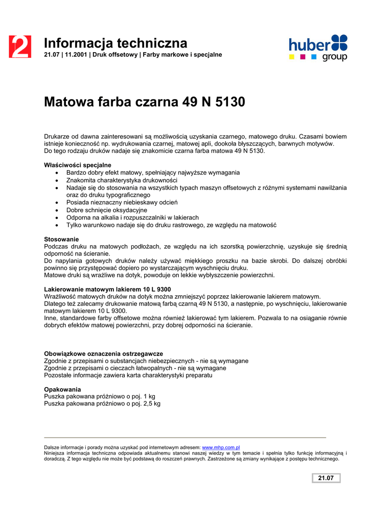 Informacja techniczna 21.07 | 11.2001 | Druk offsetowy | Farby markowe i specjalne Matowa farba czarna 49 N 5130 Drukarze od dawna zainteresowani są możliwością uzyskania czarnego, matowego druku. Czasami bowiem istnieje konieczność np. wydrukowania czarnej, matowej apli, dookoła błyszczących, barwnych motywów. Do tego rodzaju druków nadaje się znakomicie czarna farba matowa 49 N 5130. Właściwości specjalne • Bardzo dobry efekt matowy, spełniający najwyższe wymagania • Znakomita charakterystyka drukowności • Nadaje się do stosowania na wszystkich typach maszyn offsetowych z różnymi systemami nawilżania oraz do druku typograficznego • Posiada nieznaczny niebieskawy odcień • Dobre schnięcie oksydacyjne • Odporna na alkalia i rozpuszczalniki w lakierach • Tylko warunkowo nadaje się do druku rastrowego, ze względu na matowość Stosowanie Podczas druku na matowych podłożach, ze względu na ich szorstką powierzchnię, uzyskuje się średnią odporność na ścieranie. Do napylania gotowych druków należy używać miękkiego proszku na bazie skrobi. Do dalszej obróbki powinno się przystępować dopiero po wystarczającym wyschnięciu druku. Matowe druki są wrażliwe na dotyk, powoduje on lekkie wybłyszczenie powierzchni. Lakierowanie matowym lakierem 10 L 9300 Wrażliwość matowych druków na dotyk można zmniejszyć poprzez lakierowanie lakierem matowym. Dlatego też zalecamy drukowanie matową farbą czarną 49 N 5130, a następnie, po wyschnięciu, lakierowanie matowym lakierem 10 L 9300. Inne, standardowe farby offsetowe można również lakierować tym lakierem. Pozwala to na osiąganie równie dobrych efektów matowej powierzchni, przy dobrej odporności na ścieranie. Obowiązkowe oznaczenia ostrzegawcze Zgodnie z przepisami o substancjach niebezpiecznych - nie są wymagane Zgodnie z przepisami o cieczach łatwopalnych - nie są wymagane Pozostałe informacje zawiera karta charakterystyki preparatu Opakowania Puszka pakowana próżniowo o poj. 1 kg Puszka pakowana próżniowo o poj. 2,5 kg Dalsze informacje i porady można uzyskać pod internetowym adresem: www.mhp.com.pl Niniejsza informacja techniczna odpowiada aktualnemu stanowi naszej wiedzy w tym temacie i spełnia tylko funkcję informacyjną i doradczą. Z tego względu nie może być podstawą do roszczeń prawnych. Zastrzeżone są zmiany wynikające z postępu technicznego. 21.07