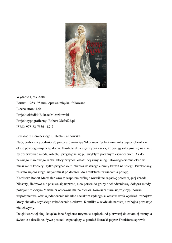 Wydanie I, rok 2010 Format: 125x195 mm, oprawa miękka, foliowana Liczba stron: 420 Projekt okładki: Łukasz Mieszkowski Projekt typograficzny: Robert Oleś/d2d.pl ISBN: 978-83-7536-187-2 Przekład z niemieckiego Elżbieta Kalinowska Nudę codziennej podróży do pracy urozmaicają Nikolasowi Schaferowi intrygujące obrazki w oknie pewnego mijanego domu. Każdego dnia mężczyzna czeka, aż pociąg zatrzyma się na stacji, by obserwować młodą kobietę i przyglądać się jej zwykłym porannym czynnościom. Aż do pewnego marcowego ranka, który przynosi ostatni tej zimy śnieg i złowrogo ciemne okno w mieszkaniu kobiety. Tylko przypadkiem Nikolas dostrzega ciemny kształt na śniegu. Przekonany, że stało się coś złego, natychmiast po dotarciu do Frankfurtu zawiadamia policję... Komisarz Robert Marthaler wraz z zespołem próbuje rozwikłać zagadkę przerażającej zbrodni. Niestety, śledztwo nie posuwa się naprzód, a co gorsza do grupy dochodzeniowej dołącza młody policjant, z którym Marthaler od dawna ma na pieńku. Komisarz stara się zdyscyplinować współpracowników, a jednoczenie nie ulec naciskom żądnego sukcesów szefa wydziału zabójstw, który chciałby szybkiego zakończenia śledztwa. Konflikt w wydziale narasta, a zabójca pozostaje nieuchwytny. Dzięki wartkiej akcji książka Jana Seghersa trzyma w napięciu od pierwszej do ostatniej strony, a świetnie nakreślone, żywe postaci i zapadający w pamięć literacki pejzaż Frankfurtu sprawią czytelniczą przyjemność nie tylko wielbicielom kryminałów. Śmierć gazet i przyszłość informacji Autor: Bernard Poulet W ostatnich latach coraz częściej pojawia się w debacie publicznej problem stopniowego zaniku znaczenia prasy drukowanej. Bernard Poulet, doświadczony francuski dziennikarz i redaktor naczelny opiniotwórczych gazet, przygląda się uważnie tej tendencji. Jego obserwacje nie ograniczają się jednak do analizy rynku prasy i spekulacji na temat jej przyszłości. Poulet zastanawia się nad dalekosiężnymi skutkami zmiany obiegu informacji, mogącymi fundamentalnie wpłynąć na funkcjonowanie całej przestrzeni publicznej. Czy koniec prasy drukowanej oznacza kres obecnej koncepcji cywilizacji? Czy czeka nas nowe zdefiniowanie istoty demokracji? Prowadzący umarłych. Opowieści prawdziwe. Chiny z perspektywy nizin społecznych Autor: Liao Yiwu Seria wydawnicza: Reportaż Przekład z języka angielskiego Agnieszka Pokojska Zbiór blisko trzydziestu wywiadów z przedstawicielami najniższych warstw chińskiego społeczeństwa. Wśród rozmówców Liao Yiwu są m. in.: handlarz ludźmi, kierownik szaletu publicznego, mistrz feng shui, trędowaty, chłopski cesarz, lunatyk, śpiewak uliczny. Ich opowieści mówią nam równie wiele o życiu codziennym Chińczyków żyjących na samym dole drabiny społecznej, ile o kulturowym bogactwie, wielosetletniej tradycji i skomplikowanej historii najnowszej tego kraju. Oddając głos tym, jak to określił Philip Gourevitch, "zakneblowanym grupom społeczeństwa", tym nieuznawanym przez Partię renegatom i pariasom, Liao Yiwu kreśli pasjonujący i bardzo prawdziwy obraz Chin. Mały złoty pierścionek Autor: Kjell Ola Dahl Przekład z języka norweskiego Milena Skoczko Pewnego niedzielnego poranka komisarz Gunnarstranda zostaje wezwany na miejsce okrutnego morderstwa. Ofiara, młoda dziewczyna, bawiła się poprzedniego wieczoru na imprezie zorganizowanej przez dyrekcję ośrodka dla narkomanów. Dawna podopieczna zakończyła leczenie i rozpoczynała właśnie nowe życie. Dlaczego musiała zginąć? Czy ciemna przeszłość Katrine jest kluczem do rozwiązania zagadki tej zbrodni? Komisarz Gunnarstranda i jego asystent Frank Frølich rozpoczynają żmudne śledztwo... Dahlowi udało się połączyć pełną napięcia intrygę rodem z klasycznego kryminału z barwnym opisem współczesnych metod pracy policji. Mały złoty pierścionek to złożona i wciągająca powieść, w której zmieniające się tropy i wątki prowadzą do zaskakującego zakończenia. W 2000 roku została wyróżniona Nagroda Rivertona i uznana za najlepszy norweski kryminał roku. Nominowano ją również do Literackiej Nagrody Brage, nagrody Szklanego Klucza oraz do niemieckiej Nagrody im. Martina Becka. Schronisko Autor: Roman Gren Seria wydawnicza: Linie Krajowe Przyjechali do Francji, jak tylu przed nimi, gnani nadzieją na lepsze życie. Wszyscy spotkali się w Grobowcu, schronisku dla bezdomnych. Sissoko z Mali – jego bliscy zostali zamordowani w niewyjaśnionych okolicznościach. Youmi z Senegalu – za diament kupił mieszkanie w jednej z najdroższych dzielnic Paryża. Monsieur Dembo – minister Republiki Środkowoafrykańskiej, uciekł z przyjęcia dyplomatycznego, na którym doszło do zamachu stanu. Stiopa – przyjechał z Kijowa, żeby pozbierać się po zdradzie żony. Maria z Wysp Zielonego Przylądka – chora na AIDS matka trójki dzieci, tak piękna, że mężczyźni, onieśmieleni, spuszczali wzrok. I wielu innych. Zjawiali się nagle i równie nagle znikali. Niektórzy zostawali na dłużej, chociaż zawsze mówili, że wpadają tylko na chwilę. W ankiecie przy pytaniu „Kogo zawiadomić w razie wypadku” zostawiali puste miejsce. Roman Gren maluje swoich bohaterów z precyzją godną holenderskiego mistrza. Pieczołowicie kreśli pełnokrwiste portrety i niezwykłe sceny rodzajowe, utrwalając to, co w nich najcenniejsze – ludzką godność. Reporterzy bez fikcji. Rozmowy z polskimi reporterami Autor: Agnieszka Wójcińska Seria wydawnicza: Poza serią Fascynujący zbiór siedemnastu wywiadów z najlepszymi polskimi reporterami. Agnieszka Wójcińska pyta dziennikarzy o warsztat, o poszukiwanie tematu, o jasne i ciemne strony pracy nad reportażem. Wybitni reporterzy zdradzają, w jaki sposób docierają do swoich rozmówców, na co zwracają uwagę w terenie i jakie cechy, według nich, charakteryzują dobrze napisany reportaż. ... bo jak 