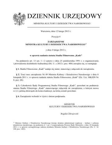 DZIENNIK URZĘDOWY MINISTRA KULTURY I DZIEDZICTWA NARODOWEGO Warszawa, dnia 12 lutego 2013 r. Pozycja 4 ZARZĄDZENIE MINISTRA KULTURY I DZIEDZICTWA NARODOWEGO1) z dnia 4 lutego 2013 r. w sprawie nadania statutu Studiu Filmowemu „Kadr” Na podstawie art. 13 ust. 1 i 2 ustawy z dnia 25 października 1991 r. o organizowaniu i prowadzeniu działalności kulturalnej (Dz. U. z 2012 r. poz. 406) zarządza się, co następuje: § 1. Studiu Filmowemu „Kadr” nadaje się statut, stanowiący załącznik do zarządzenia. § 2. Traci moc zarządzenie Nr 49 Ministra Kultury i Dziedzictwa Narodowego z dnia 8 listopada 2011 r. w sprawie nadania statutu Studiu Filmowemu „Kadr” (Dz. Urz. MKiDN Nr 8, poz. 68). § 3. Członkowie Rady Programowej Studia Filmowego „Kadr”, powołani na podstawie statutu Studia Filmowego „Kadr” stanowiącego załącznik do zarządzenia, o którym mowa w § 2, pełnią obowiązki do końca kadencji, na którą zostali powołani. § 4. Zarządzenie wchodzi w życie z dniem podpisania. MINISTER KULTURY I DZIEDZICTWA NARODOWEGO Bogdan Zdrojewski 1) Minister Kultury i Dziedzictwa Narodowego kieruje działem administracji rządowej – kultura i ochrona dziedzictwa narodowego, na podstawie § 1 ust. 2 rozporządzenia Prezesa Rady Ministrów z dnia 18 listopada 2011 r. w sprawie szczegółowego zakresu działania Ministra Kultury i Dziedzictwa Narodowego (Dz. U. Nr 248, poz. 1482). Załącznik do zarządzenia Ministra Kultury i Dziedzictwa Narodowego z dnia 4 lutego 2013 r. (poz. 4) STATUT STUDIA FILMOWEGO ‘KADR” Rozdział 1 Postanowienia ogólne § 1. 1. Studio Filmowe „Kadr”, zwane dalej „Studiem”, jest państwową instytucją kultury działającą na podstawie: 1) ustawy z dnia 25 października 1991 r. o organizowaniu i prowadzeniu działalności kulturalnej ( Dz. U. z 2012 r. poz. 406), zwanej dalej „ustawą”; 2) zarządzenia Nr 47 Ministra Kultury i Dziedzictwa Narodowego z dnia 4 października 2011 r. w sprawie utworzenia państwowej instytucji kultury Studio Filmowe „Kadr” przez przekształcenie państwowych instytucji filmowych: Studio Filmowe „KADR” i Studio Filmowe „OKO” (Dz. Urz. MKiDN Nr 7, poz. 66); 3) niniejszego statutu. 2. Studio może używać skróconej nazwy „SF „Kadr””. § 2. Studio posiada osobowość prawną. § 3. 1. Siedzibą Studia jest miasto stołeczne Warszawa, a terenem działania obszar Rzeczypospolitej Polskiej i zagranica. 2. Organizatorem Studia jest minister właściwy do spraw kultury i ochrony dziedzictwa narodowego, zwany dalej „Ministrem”. 3. Studio jest wpisane do rejestru instytucji kultury prowadzonego przez Ministra pod numerem RIK 84/11. 4. Nadzór nad Studiem sprawuje Minister. Rozdział 2 Zakres działalności Studia § 4. Do zakresu działalności Studia należy edukacja i upowszechnianie kultury filmowej, w szczególności: 1) wspieranie rozwoju artystycznego i zawodowego młodych twórców filmowych poprzez realizowanie opieki artystycznej nad projektami filmowymi najmłodszej generacji polskich filmowców oraz działań w zakresie ich profesjonalizacji zawodowej; 2) produkcja i koprodukcja filmów; 3) dystrybucja i rozpowszechnianie filmów; 4) świadczenie usług produkcyjnych na rzecz podmiotów prowadzących działalność w zakresie kinematografii, nadawców programów telewizyjnych oraz innych podmiotów krajowych i zagranicznych; 5) tworzenie warunków powszechnego dostępu do dorobku polskiej sztuki filmowej poprzez: a) udostępnianie własnych zasobów archiwalnych, b) prowadzenie procesu cyfryzacji i rekonstrukcji filmów. Rozdział 3 Organy zarządzające i doradcze oraz sposób ich powoływania § 5. Organami Studia są: 1) Dyrektor; 2) Rada Programowa, zwana dalej „Radą”. § 6. 1. Dyrektor zarządza Studiem i reprezentuje je na zewnątrz. 2. Do obowiązków Dyrektora należy realizacja zadań statutowych, a w szczególności: 1) odpowiedzialność za bieżącą działalność Studia; 2) przygotowywanie strategii, rocznych i wieloletnich programów działania oraz założeń finansowych działalności Studia; 3) nadzór i koordynacja wykonania programów działania i planów finansowych Studia; 4) sporządzanie sprawozdań merytorycznych i sprawozdań finansowych za każdy rok kalendarzowy; 5) racjonalne i efektywne gospodarowanie posiadanymi środkami finansowymi i materialnymi oraz prawami; 6) wydawanie wewnętrznych zarządzeń i regulaminów. 3. Dyrektora powołuje i odwołuje Minister w trybie określonym ustawą. 4. Dyrektor zarządza Studiem przy pomocy jednego zastępcy. 5. Zastępcę Dyrektora powołuje i odwołuje Dyrektor, po zasięgnięciu opinii Ministra. 6. Organizację wewnętrzną Studia oraz ramowy zakres działania komórek organizacyjnych i samodzielnych stanowisk pracy określa regulamin organizacyjny Studia, nadany przez Dyrektora w trybie określonym w art. 13 ust. 3 ustawy. § 7. 1. Rada jest organem doradczym i opiniodawczym Dyrektora. 2. Do zadań Rady należy: 1) opiniowanie strategii, rocznych i wieloletnich programów działania Studia oraz ocena ich realizacji; 2) pomoc Dyrektorowi w poszukiwaniu nowych form wsparcia organizacyjnego, koncepcyjnego i finansowego działalności Studia; 3) wyrażanie opinii i składanie wniosków do Dyrektora we wszystkich istotnych sprawach związanych z działalnością Studia. § 8. 1. W skład Rady wchodzą osoby powoływane na okres 4 lat przez Ministra na wniosek Dyrektora. 2. Rada liczy 3 członków. 3. Pierwsze posiedzenie Rady zwołuje Dyrektor. 4. Rada na pierwszym posiedzeniu wybiera ze swojego składu w głosowaniu tajnym Przewodniczącego i jego Zastępcę. 5. Przewodniczący kieruje pracami Rady. 6. W razie nieobecności Przewodniczącego, jego zadania wykonuje zastępca Przewodniczącego. § 9. 1. Uchwały Rady zapadają na posiedzeniach w głosowaniu jawnym, z zastrzeżeniem ust. 2, zwykłą większością głosów, przy obecności co najmniej połowy składu Rady. 2. Tajne głosowanie zar
