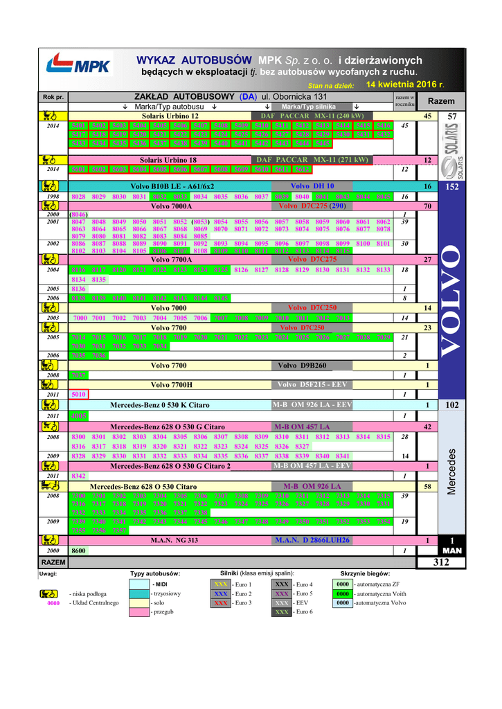 WYKAZ AUTOBUSÓW MPK Sp. z o. o. i dzierżawionych będących w eksploatacji tj. bez autobusów wycofanych z ruchu. 14 kwietnia 2016 r. Stan na dzień: ZAKŁAD AUTOBUSOWY (DA) ul. Obornicka 131 Rok pr. ↓ ↓ ↓ DAF PACCAR 5401 5402 5403 5404 5405 5406 5407 5408 5409 5410 5411 5412 5417 5418 5419 5420 5421 5422 5423 5424 5425 5426 5427 5428 5433 5434 5435 5436 5437 5438 5439 5440 5441 5442 5443 5444 2002 8048 8064 8080 8087 8103 8049 8065 8081 8088 8104 8050 8066 8082 8089 8105 8051 8067 8083 8090 8106 8052 8068 8084 8091 8107 (8053) 8069 8085 8092 8108 2005 2006 2005 2006 16 8054 8055 8056 8057 8058 8059 8060 8061 8062 8070 8071 8072 8073 8074 8075 8076 8077 8078 8093 8094 8095 8096 8097 8098 8099 8100 8101 8109 8110 8111 8112 8113 8114 8115 2008 7037 2011 5010 1 1 M-B OM 926 LA - EEV 1 Mercedes-Benz 628 O 530 G Citaro 2 M-B OM 457 LA 42 28 14 M-B OM 457 LA - EEV 1 1 M-B OM 926 LA Mercedes-Benz 628 O 530 Citaro 7301 7317 7333 7340 7356 7302 7318 7334 7341 7357 7303 7319 7335 7342 7304 7320 7336 7343 7305 7321 7337 7344 7306 7307 7308 7309 7310 7311 7312 7313 7314 7315 7322 7323 7324 7325 7326 7327 7328 7329 7330 7331 7338 7345 7346 7347 7348 7349 7350 7351 7352 7353 7354 58 39 19 M.A.N. D 2866LUH26 M.A.N. NG 313 8600 1 1 1 MAN 312 RAZEM Typy autobusów: Uwagi: - MIDI 0000 102 1 Mercedes-Benz 628 O 530 G Citaro 2000 2 Volvo D5F215 - EEV 8300 8301 8302 8303 8304 8305 8306 8307 8308 8309 8310 8311 8312 8313 8314 8315 8316 8317 8318 8319 8320 8321 8322 8323 8324 8325 8326 8327 8328 8329 8330 8331 8332 8333 8334 8335 8336 8337 8338 8339 8340 8341 2009 23 21 1 2008 7300 7316 7332 7339 7355 14 1 4005 2008 1 8 14 2011 8342 18 Volvo D9B260 Mercedes-Benz 0 530 K Citaro 2011 30 Volvo D7C250 Volvo 7700H 2009 70 1 39 27 7000 7001 7002 7003 7004 7005 7006 7007 7008 7009 7010 7011 7012 7013 Volvo D7C250 Volvo 7700 7014 7015 7016 7017 7018 7019 7020 7021 7022 7023 7024 7025 7026 7027 7028 7029 7030 7031 7032 7033 7034 7035 7036 Volvo 7700 152 16 Volvo D7C275 8116 8117 8120 8121 8122 8123 8124 8125 8126 8127 8128 8129 8130 8131 8132 8133 8134 8135 8136 8138 8139 8140 8141 8142 8143 8144 8145 Volvo 7000 2003 57 12 Volvo D7C275 (290) Volvo 7700A 2004 45 12 8028 8029 8030 8031 8032 8033 8034 8035 8036 8037 8039 8040 8041 8043 8044 8045 (8046) 8047 8063 8079 8086 8102 Razem 45 Volvo DH 10 Volvo 7000A 2000 2001 MX-11 (240 kW) 5413 5414 5415 5416 5429 5430 5431 5432 5445 5601 5602 5603 5604 5605 5606 5607 5608 5609 5610 5611 5612 Volvo B10B LE - A61/6x2 1998 razem w roczniku DAF PACCAR MX-11 (271 kW) Solaris Urbino 18 2014 ↓ Marka/Typ silnika Mercedes 2014 Marka/Typ autobusu Solaris Urbino 12 - niska podłoga - Układ Centralnego - trzyosiowy - solo - przegub Silniki (klasa emisji spalin): XXX - Euro 1 XXX - Euro 2 XXX - Euro 3 XXX - Euro 4 XXX - Euro 5 XXX - EEV XXX - Euro 6 Skrzynie biegów: 0000 - automatyczna ZF 0000 - automatyczna Voith 0000 -automatyczna Volvo