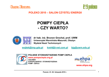 POLEKO 2010 – SALON CZYSTEJ ENERGII POMPY CIEPŁA - CZY WARTO? dr hab. inŜ. Brunon Grochal, prof. UWM Uniwersytet Warmińsko-Mazurski, Olsztyn Wydział Nauk Technicznych [email protected] [email protected] [email protected] POLSKIE STOWARZYSZENIE POMP CIEPŁA www.pompaciepla.org.pl CZŁONEK EUROPEJSKIEGO STOWARZYSZENIA POMP CIEPŁA Poznań, 23 -26. listopada 2010 r. www.ehpa.org 1 Plan prezentacji 1. Słów kilka o samej pompie ciepła - karczowanie stereotypów i edukacja energetyczna 2. Ile ciepło kosztuje - i czy o tym wiemy? 3. Punkty widzenia: - indywidualny uŜytkownik - dostawca ciepła - kraj 4. Co dalej z pompami ciepła w Polsce? Poznań, 23 -26. listopada 2010 r. 2 1. Słów kilka o samej pompie ciepła - karczowanie stereotypów i edukacja energetyczna Zasada działania pompy ciepła Pompa ciepła napędzana energią Ln pobiera ze środowiska (powietrze, woda, grunt) energię Q, uŜytkownik ma do dyspozycji sumę (Q + Ln). Średnioroczny współczynnik efektywności cieplnej SPF = (Q + Ln)/Ln w poprawnie wykonanych instalacjach przy pobieraniu ciepła z wody bądź z gruntu wynosi około 4 (SPF ≅ 4), przy pobieraniu ciepła z powietrza wynosi około 3 (SPF ≅ 3), i są to wartości pomierzone. Tak więc pompa ciepła pracuje na zasadzie recyrkulacji energii pobieranej ze środowiska Energia napędowa Ln moŜe być dostarczana jako: - energia elektryczna (pompy ciepła spręŜarkowe), - energia cieplna, np. ze spalania gazu (pompy ciepła absorpcyjne, niŜsze SPF, większe moce). Poznań, 23 -26. listopada 2010 r. 3 grunt (odwierty pionowe) powietrze grunt (koleor poziomy) woda (studnie) Dolne źródła ciepła małych instalacji: Poznań, 23 -26. listopada 2010 r. 4 Pompa ciepła = parownik+ spręŜarka+skraplacz+zawór rozpręŜny spręŜarkowa (+ automatyka) Przykład: kompaktowa pompa ciepła - ze zbiornikiem ciepłej wody uŜytkowej (Viessmann) Poznań, 23 -26. listopada 2010 r. 5 Pompa ciepła = parownik+ spręŜarka+skraplacz+zawór rozpręŜny spręŜarkowa (+ automatyka) Przykład: pompa ciepła IVT Greenline HT Plus (SunEnergy) http://www.sunenergy.pl/nowosci#/pompy-ciepla Pompa Premiumline X11 - laureatką konkursu o Złoty Medal Targów Poznańskich Instalacje 2010 Poznań, 23 -26. listopada 2010 r. 6 Dolne źródła ciepła duŜych instalacji Ciepło z wody morskiej Stockholm Värtan Ropsten – The largest sea water heat pump facilityworldwide, with 6 Unitop® 50FY and 180 MW total capacity (Friotherm) Poznań, 23 -26. listopada 2010 r. 7 Dolne źródła ciepła duŜych instalacji Poznań, 23 -26. listopada 2010 r. 8 Przykłady duŜych instalacji z pompami ciepła (z [10]) Poznań, 23 -26. listopada 2010 r. 9 Gruntowe dolne źródło/magazyn ciepła (z [12]) Poznań, 23 -26. listopada 2010 r. 10 Gruntowe dolne źródło/magazyn ciepła (z [12]) Poznań, 23 -26. listopada 2010 r. 11 Gruntowe dolne źródło/magazyn ciepła (z [12]) Poznań, 23 -26. listopada 2010 r. 12 z [1] Ilustracja relacji między efektywnościami cieplnymi pompy ciepła (COP) i instalacji grzewczej z pompą ciepła (SPF) wg propozycji EHPA. Poznań, 23 -26. listopada 2010 r. 13 Dolne źródło ciepła: powietrze grunt Pomierzone wartości średniorocznej efektywności cieplnej SPF SPF = (Q + Ln)/Ln Poznań, 23 -26. listopada 2010 r. 14 z [7] Poznań, 23 -26. listopada 2010 r. 15 Pompa ciepła moŜe dostarczać ciepło w całości pochodzące z OZE, jeśli z OZE pochodzi energia napędowa (stanowiąca część ciepła dostarczanego uŜytkownikowi). wg [6] Poznań, 23 -26. listopada 2010 r. 16 z [4] Po początkowym skupieniu uwagi na pozyskiwaniu z OZE przede wszystkim energii elektrycznej, dostrzeŜono w UE niezwykle istotny udział ciepła w zuŜyciu energii ogółem Poznań, 23 -26. listopada 2010 r. 17 2. Ile ciepło kosztuje - i czy o tym wiemy? Ze świadomością struktury kosztów energii ponoszonych w gospodarstwach domowych nie jest najlepiej ... Łączny udział kosztów ogrzewania i przygotowania ciepłej wody uŜytkowej w polskich budŜetach domowych przekracza 70%, ale zdaje sobie z tego sprawę tylko 32% badanych Poznań, 23 -26. listopada 2010 r. 18 Wzrost cen paliw w okresie 1999 - 2006 Poznań, 23 -26. listopada 2010 r. 19 3. Punkty widzenia : - indywidualny uŜytkownik koszty eksploatacji - narastająco z upływem czasu pompa ciepła pła e i c dło ó r ź inne A – koszt zakupu „innego źródła ciepła” B – koszt zakupu pompy ciepła Schemat do analizy opłacalności zainstalowania pompy ciepła (indywidualny uŜytkownik) Poznań, 23 -26. listopada 2010 r. 20 Jedno z publikowanych zestawień porównawczych Efektywnośc Plus – Viessmann http://www.ogrzewnictwo.pl/index.php?akt_cms=3998&cms=296 Poznań, 23 -26. listopada 2010 r. 21 Porównanie kosztów ogrzewania przy uŜyciu róŜnych systemów ogrzewania. (Źródło: http://www.kotly.pl/ogrzewanie.php) Poznań, 23 -26. listopada 2010 r. 22 wg [13] (wg danych z 2004 r.) Poznań, 23 -26. listopada 2010 r. 23 Tak wygląda obecnie porównanie kosztów ogrzewania w USA Poznań, 23 -26. listopada 2010 r. 24 3. Punkty widzenia : - dostawca ciepła z [1] Korzyści ze stosowania pomp ciepła z punktu widzenia dostawcy ciepła - przez polskie ciepłownie dotąd jakoś nie są dostrzegane ... Poznań, 23 -26. listopada 2010 r. 25 Ilości ciepła pozyskiwane w krajach UE przy wykorzystaniu pomp ciepła obecnie (po lewej) oraz potencjalne moŜliwości według prognozy na 2020 r. (po prawej) (NaleŜy zwrócić uwagę na róŜne skale pionowe wykresów!) Poznań, 23 -26. listopada 2010 r. 26 3. Punkty widzenia : - kraj (tzn. nasza administracja centralna) Poznań, 23 -26. listopada 2010 r. 27 Z referatu Perspektywy rozwoju energetyki odnawialnej w latach 2008-2020 przedstawionego w Międzyzdrojach, 12 maja 2008, na Spotkaniu Marszałków Województw przez p. Dariusza Bogdana, Podsekretarza Stanu w Ministerstwie Gospodarki: Ciepło z OZE - analiza 2020*) Biomasa - przede wszystkim układy kogeneracyjne Geotermia, w tym pomp