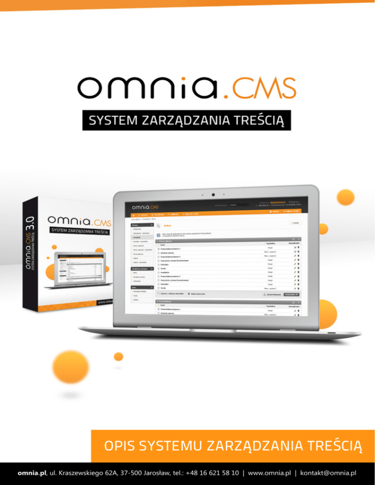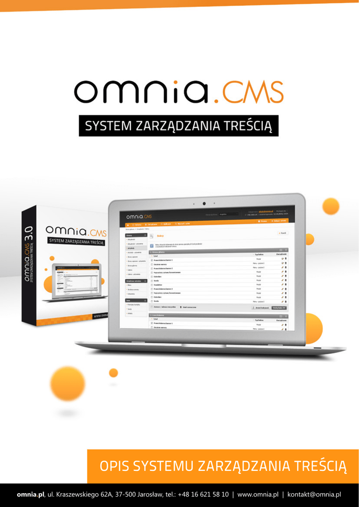 Opis systemu Zarządzania treścią omnia.pl, ul. Kraszewskiego 62A, 37-500 Jarosław, tel.: +48 16 621 58 10 | www.omnia.pl | [email protected] .czym jest omnia.CMS omnia.CMS to nasz autorski system zarządzania treścią i strukturą serwisu WWW, dedykowany firmom, urzędom i instytucjom pragnącym utrzymywać w Internecie zawsze aktualną stronę www. O systemie zarządzania treścią omnia.CMS System zarządzania treścią jest aplikacją pozwalającą na szybkie i wygodne dodawanie treści do strony internetowej i jej nieograniczone rozbudowanie. Dobrze zaprojektowany system CMS pozwala na łatwe i intuicyjne zarządzanie stronami przez samego Klienta nie wymagając przy tym wiedzy specjalistycznej. Nasz system zarządzania treścią, dzięki swojej modułowej budowie zapewnia wyjątkową elastyczności i uniwersalność pozwalając na zastosowanie go we wszystkich rodzajach stron internetowych począwszy od prostych stron firmowych po przez sklepy internetowe, a skończywszy na zaawansowanych portalach i aplikacjach dedykowanych. Łatwość i intuicyjność obsługi to cechy wyróżniające nasz system CMS od innych rozwiązań tego typu. W celu zarządzania stroną internetową nasi Klienci nie muszą znać technologii, ani języków programowania, a praca z omnia.CMS jest równie łatwa, jak tworzenie dokumentów w popularnych programach biurowych. Dodawanie nowych stron i działów, rozbudowa menu, wprowadzanie i edycja treści, tworzenie galerii zdjęć i filmów, zarządzanie kontami użytkowników, wysyłanie newsletterów, tworzenie ankiet, zarządzanie forum - to wszystko jest w zasięgu kilku kliknięć. omnia.CMS umożliwia również integrację z zewnętrznymi bazami danych, które pozwalają na automatyzację procesu aktualizacji strony internetowej. Możliwe jest również rozbudowywanie serwisów o moduły dedykowane, zawierające rozwiązania dokładnie dopasowane do specyfiki oraz potrzeb projektu i Klienta. Zalety omnia.CMS Łatwość obsługi Łatwe i szybkie zarządzanie stroną internetową poprzez intuicyjny panel administracyjny. Wbudowany edytor treści typu WYSIWYG (What You See Is What You Get) umożliwia wprowadzanie treści osobom bez znajomości języków programowania. Modułowość Modułowa struktura omnia.CMS pozwala idealnie dopasować elementy strony do potrzeb zarówno prostej strony WWW, jak i rozbudowanego portalu. Taki model pozwala na łatwe konfigurowanie i zarządzanie elementami na stronie internetowej. Funkcjonalność Rozbudowane funkcjonalności omnia.CMS pozwalają na tworzenie bardzo zaawansowanych stron internetowych idealnie dopasowanych do potrzeb klientów wraz z dostępem do pełnych możliwości konfiguracji serwisu po jego stronie. Oszczędność Brak ograniczeń ilości podstron i projektowanie stron w sposób zapewniający możliwość rozbudowywania ich struktury, gwarantujący, że rozbudowa strony internetowej nie wymaga żadnych dodatkowych nakładów finansowych. Bezpieczeństwo Kompatybilność z przeglądarkami Dla zapewnia zawsze najlepszego wyglądu realizowanych stron omnia.CMS zapewnia pełną kompatybilność z wszystkimi najnowszymi przeglądarkami internetowymi. Możliwości rozbudowanego zarządzania uprawnieniami administratorów i redaktorów serwisu, co pozwala na bezpieczne zarządzanie stroną WWW przez wielu użytkowników. Zaawansowane zabezpieczenia zapewniają, że nasze strony internetowe są bezpieczne przed atakami zewnętrznymi. 2 .zastosowanie omnia.CMS System zarządzania treścią omnia.CMS, dzięki swojej budowie pozwala na wykorzystywanie go do każdego rodzaju strony internetowej oraz pełne dostosowywanie go do potrzeb projektu. Strony i serwisy internetowe Sklepy internetowe Strona internetowa jest jednym z najważniejszych narzędzi marketingowych. Zapewnia całodobowy i nieograniczony przekaz informacji, przez co jest najtańszą formą reklamy. Dobrze zaprojektowany serwis internetowy ma budować świadomość marki u potencjalnego klienta oraz prezentować ofertę szerokiemu gronu potencjalnych kontrahentów. Aby to osiągnąć, musi charakteryzować się przemyślaną strukturą logiczną, intuicyjną nawigacją oraz oryginalną szatą graficzną, dopasowaną do profilu firmy. Sklepy internetowe to jedno z najbardziej skutecznych kanałów sprzedaży, dzięki łatwości dostępu oraz możliwości pełnej prezentacji oferowanego asortymentu, stanowi istotne narzędzie sprzedaży. Wieloletnie doświadczenie w branży e-commerce, pozwoliło wypracować nam rozbudowaną i w pełni skalowalną do potrzeb naszych klientów platformę sprzedaży internetowej B2B i B2C. Serwisy internetowe realizujemy w oparciu o nasze autorskie rozwiązanie omnia.CMS. Dzięki temu nasi klienci mają gwarancję, że ich serwis będzie zawsze działać bezbłędnie i stabilnie, a jego aktualizacja i rozbudowa będzie równie łatwa, jak obsługa popularnych programów biurowych, a liczne moduły dodatkowe pozwalają dopasować ją do potrzeb konkretnego projektu stron. omnia.CMS pozwala na budowanie sklepów internetowych idealnie dopasowanych do asortymentu i modelu sprzedaży. Opracowane rozwiązania pozwalają tworzyć własne bazy produktowe oraz integrować ofertę sklepu z zewnętrznymi bazami produktowymi i magazynowymi. Dla zwiększenia efektywności sprzedaży system oferuje rozbudowane opcje łączenia produktów, tworzenia pakietów, generowania kodów rabatowych i promocyjnych oraz narzędzia do analizy i raportowania skuteczności sprzedaży. Portale internetowe Aplikacje dedykowane Portale internetowe są najbardziej rozbudowanymi formami stron internetowych. Cechują się one oprócz dużej ilości zawartych informacji, również bardzo rozbudowaną strukturą nawigacyjną oraz opcjami konfiguracyjnymi. Z tego powodu zapewnienie prawidłowego działania portali wymaga wydajnego systemu CMS, który sprosta zarówno kwestii wyświetlania dużej ilości treści, jak również zagwarantuje wygodę i s