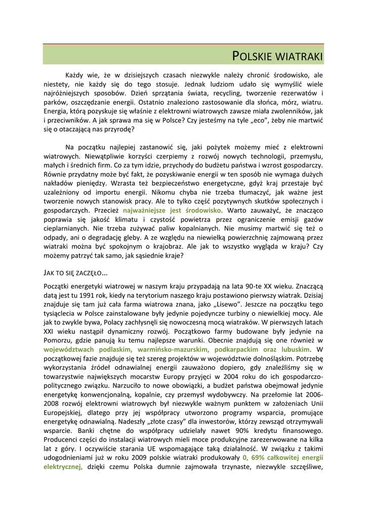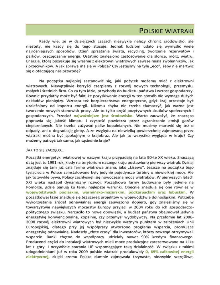 POLSKIE WIATRAKI Każdy wie, że w dzisiejszych czasach niezwykle należy chronić środowisko, ale niestety, nie każdy się do tego stosuje. Jednak ludziom udało się wymyślić wiele najróżniejszych sposobów. Dzień sprzątania świata, recycling, tworzenie rezerwatów i parków, oszczędzanie energii. Ostatnio znaleziono zastosowanie dla słońca, mórz, wiatru. Energia, którą pozyskuje się właśnie z elektrowni wiatrowych zawsze miała zwolenników, jak i przeciwników. A jak sprawa ma się w Polsce? Czy jesteśmy na tyle „eco”, żeby nie martwić się o otaczającą nas przyrodę? Na początku najlepiej zastanowić się, jaki pożytek możemy mieć z elektrowni wiatrowych. Niewątpliwie korzyści czerpiemy z rozwój nowych technologii, przemysłu, małych i średnich firm. Co za tym idzie, przychody do budżetu państwa i wzrost gospodarczy. Równie przydatny może być fakt, że pozyskiwanie energii w ten sposób nie wymaga dużych nakładów pieniędzy. Wzrasta też bezpieczeństwo energetyczne, gdyż kraj przestaje być uzależniony od importu energii. Nikomu chyba nie trzeba tłumaczyć, jak ważne jest tworzenie nowych stanowisk pracy. Ale to tylko część pozytywnych skutków społecznych i gospodarczych. Przecież najważniejsze jest środowisko. Warto zauważyć, że znacząco poprawia się jakość klimatu i czystość powietrza przez ograniczenie emisji gazów cieplarnianych. Nie trzeba zużywać paliw kopalnianych. Nie musimy martwić się też o odpady, ani o degradację gleby. A ze względu na niewielką powierzchnię zajmowaną przez wiatraki można być spokojnym o krajobraz. Ale jak to wszystko wygląda w kraju? Czy możemy patrzyć tak samo, jak sąsiednie kraje? JAK TO SIĘ ZACZĘŁO… Początki energetyki wiatrowej w naszym kraju przypadają na lata 90-te XX wieku. Znaczącą datą jest tu 1991 rok, kiedy na terytorium naszego kraju postawiono pierwszy wiatrak. Dzisiaj znajduje się tam już cała farma wiatrowa znana, jako „Lisewo”. Jeszcze na początku tego tysiąclecia w Polsce zainstalowane były jedynie pojedyncze turbiny o niewielkiej mocy. Ale jak to zwykle bywa, Polacy zachłysnęli się nowoczesną mocą wiatraków. W pierwszych latach XXI wieku nastąpił dynamiczny rozwój. Początkowo farmy budowane były jedynie na Pomorzu, gdzie panują ku temu najlepsze warunki. Obecnie znajdują się one również w województwach podlaskim, warmińsko-mazurskim, podkarpackim oraz lubuskim. W początkowej fazie znajduje się też szereg projektów w województwie dolnośląskim. Potrzebę wykorzystania źródeł odnawialnej energii zauważono dopiero, gdy znaleźliśmy się w towarzystwie największych mocarstw Europy przyjęci w 2004 roku do ich gospodarczopolitycznego związku. Narzuciło to nowe obowiązki, a budżet państwa obejmował jedynie energetykę konwencjonalną, kopalnie, czy przemysł wydobywczy. Na przełomie lat 20062008 rozwój elektrowni wiatrowych był niezwykle ważnym punktem w założeniach Unii Europejskiej, dlatego przy jej współpracy utworzono programy wsparcia, promujące energetykę odnawialną. Nadeszły „złote czasy” dla inwestorów, którzy zewsząd otrzymywali wsparcie. Banki chętne do współpracy udzielały nawet 90% kredytu finansowego. Producenci części do instalacji wiatrowych mieli moce produkcyjne zarezerwowane na kilka lat z góry. I oczywiście starania UE wspomagające taką działalność. W związku z takimi udogodnieniami już w roku 2009 polskie wiatraki produkowały 0, 69% całkowitej energii elektrycznej, dzięki czemu Polska dumnie zajmowała trzynaste, niezwykle szczęśliwe, miejsce pod względem zainstalowanej w kraju energetyki wiatrowej spośród wszystkich państw Unii Europejskiej. I chociaż sytuacja w Polsce niezwykle się poprawiła, a w tym samym roku planowano uruchomić kilkanaście dużych elektrowni, to wiele projektów zostało zawieszonych lub opóźnionych. Według danych Urzędu Regulacji Energetyki w połowie czerwca 2011 roku w Polce znajdowały się 472 instalacje wiatrowe o łącznej mocy 1389 MW. A to dopiero początek, gdyż na kolejne lata przygotowuje się kolejne inwestycje. Na dzień dzisiejszy na terenie kraju znajduje się 25 farm wiatrakowych, każda o mocy powyżej 5 MW. WALKA Z WIATRAKAMI? Czy Polska jest odpowiednim państwem do takiego typu przedsięwzięć? Minęło zaledwie 20 lat odkąd staramy się nadgonić osiągnięcia innych państw. A wiadomo, że „dobre złego początki”. Kryzys ekonomiczny, który dotknął nasz kraj był powolnym końcem przygody z wiatrakami dla niektórych inwestorów. Nawet w tej sytuacji można znaleźć pozytywne skutki. Na rynku wiatrowym umocniły się największe europejskie koncerny z sektora energetyki odnawialnej. Jednak wciąż głównym problemem związanym z zakładaniem nowych elektrowni są procedury. Wszystkie formalne zezwolenia nie dość, że są kosztowne, to na dodatek pochłaniają dużo czasu. Niezwykle trudne jest ich uzyskanie na obszarach objętych programem „Natura 2000” i w jej pobliżu. Dodatkowo ogranicza nas tak zwana taryfa „feed-in”. Można zapytać, czym jest ta norma. Taryfa gwarancyjna jest stosowana w większości państw Unii Europejskiej i określa ona stałą cenę energii elektrycznej z odnawialnych źródeł w zależności od szczególnych parametrów na zdecydowanie dłuższy czas. Z tego względu przychody nowych inwestycji można określić tylko na kilka pierwszych lat, gdyż z czasem stają się coraz bardziej mgliste i niedokładne. Ciekawym rozwiązaniem są także tak zwane projekty „off-shore”. Dokładniej mówiąc, są to elektrownie budowane na pełnym morzu. W Polsce jednak ten dział nadal jest słabo rozwinięty. Ale może w przyszłości będziemy mogli pochwalić się nowymi rozwiązaniami. A TO DOPIERO POCZĄTEK Polska, jako kraj debiutujący w sprawie energetyki wiatrowej, ma jeszcze wiele do przemyślenia. Z czasem rozwój tego sektora może bardzo